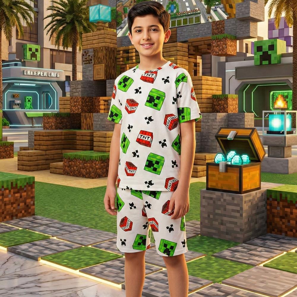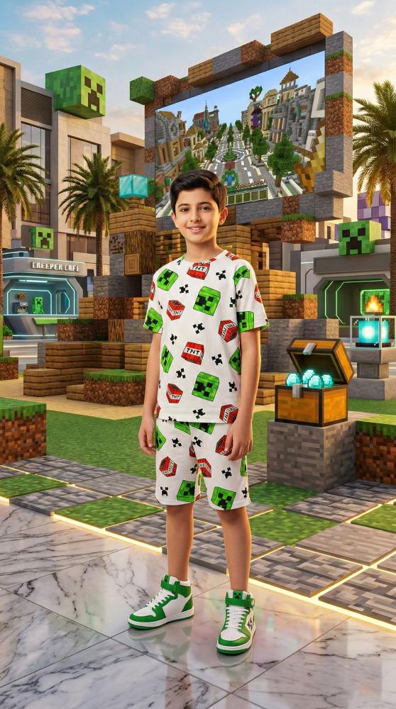 صُمم هذا الطقم المكون من قطعتين (تيشيرت وشورت) خصيصاً لعشاق عالم ماين كرافت. يتميز بتصميم عصري يجمع بين أيقونات اللعبة الشهيرة مثل الكريبر وصناديق الـ TNT المبهجة، ليعطي طفلك إطلالة مليئة بالحيوية والتميز.