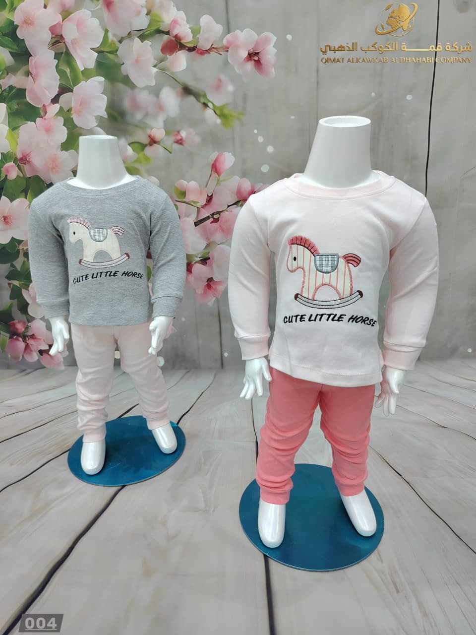 طقم بناتي مكوّن من بلوزة طويلة الأكمام بتطريز حصان هزاز مع عبارة CUTE LITTLE HORSE، وبنطال مريح بلون متناسق. تصميم ناعم ودافئ يناسب اللبس اليومي ويمنح إطلالة طفولية لطيفة.