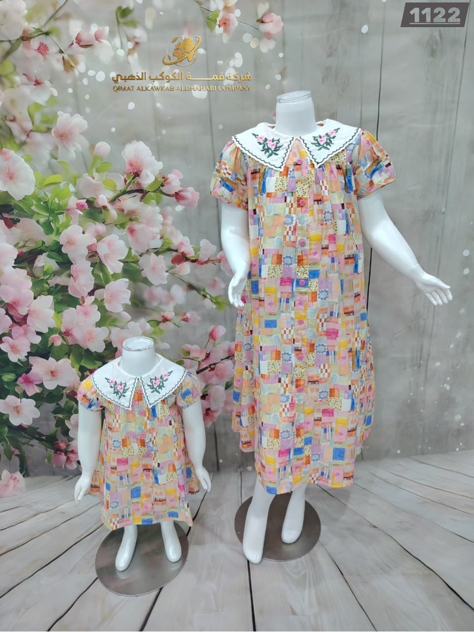 فستان بناتي بنقشة مربعات ملونة وياقة مطرّزة تضيف لمسة نعومة. تصميم مريح ومبهج يناسب الطلعات والمناسبات اليومية.