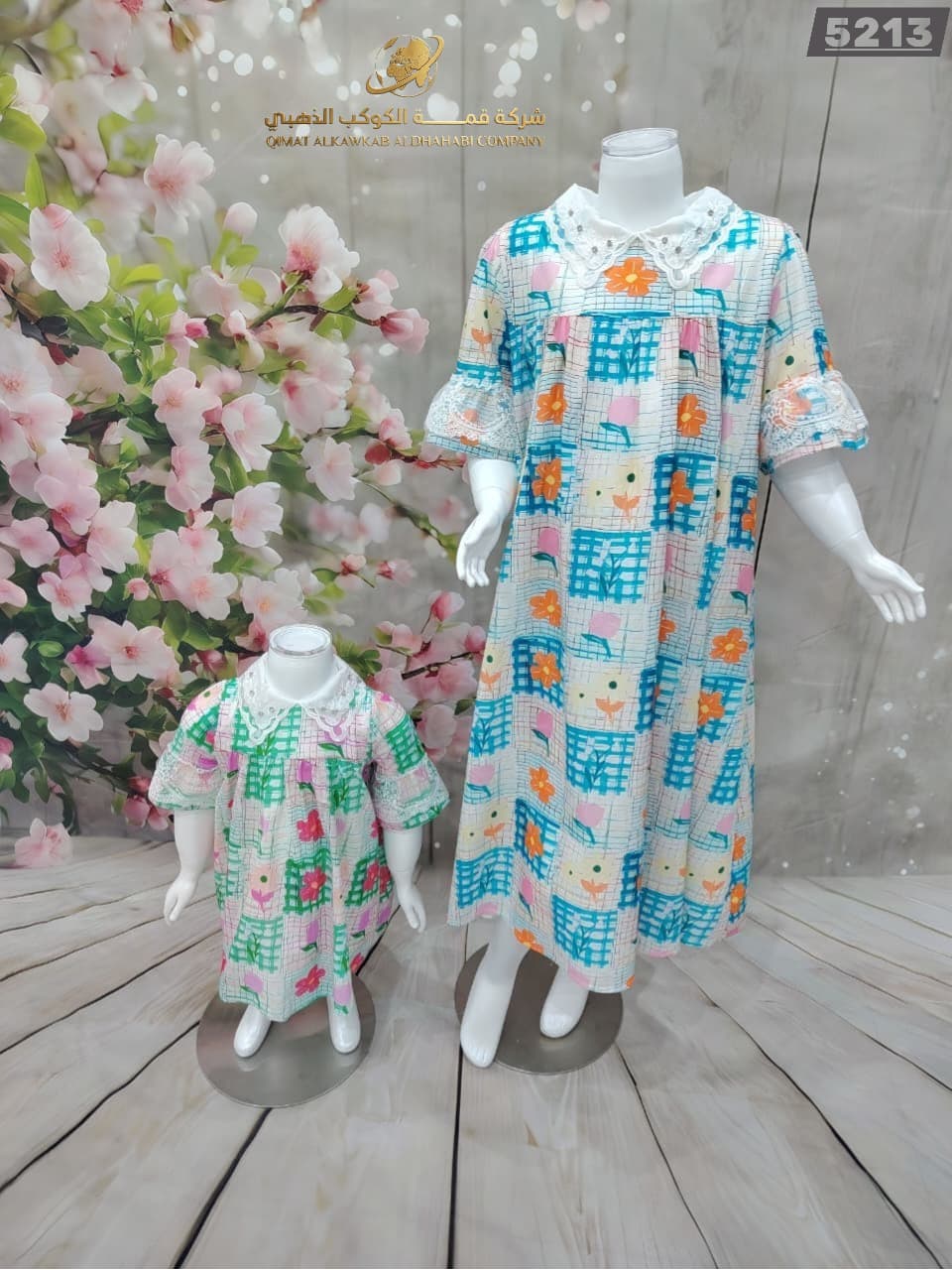 طقم بتصميم لطيف يجمع بين نقشة المربعات والزهور، مع ياقة دانتيل تضيف لمسة نعومة وأناقة. خيار مثالي لإطلالة متناسقة ومبهجة.