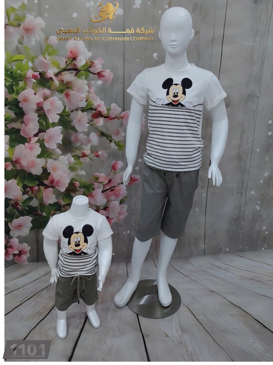 طقم أولادي لطيف مكوّن من تيشيرت أبيض بطباعة ميكي ماوس مع خطوط رمادية أنيقة، وشورت رمادي مريح. تصميم مرح وخفيف يناسب الطلعات اليومية ويمنح إطلالة محبوبة للأطفال.