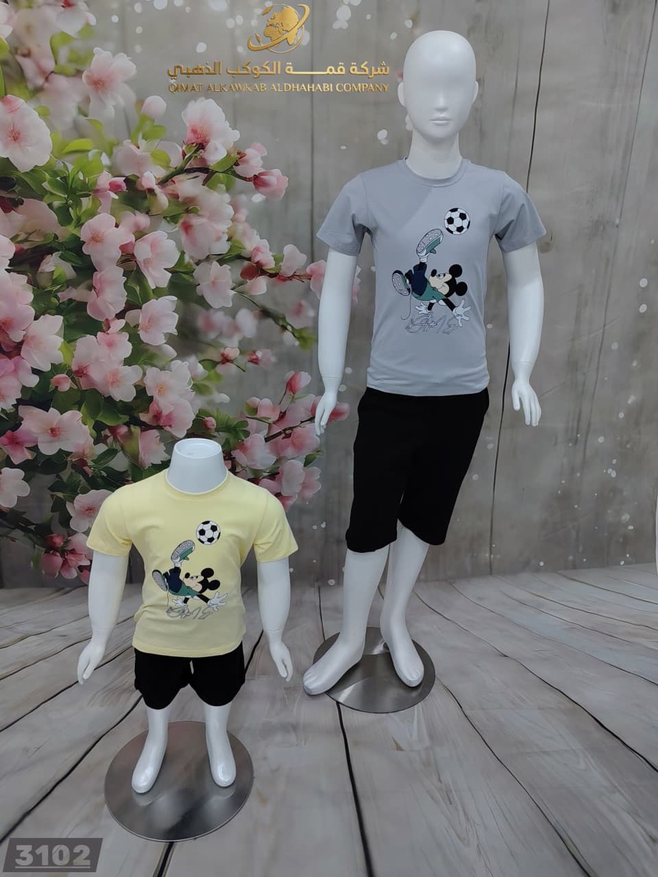 طقم أولادي مكوّن من تيشيرت بطباعة ميكي ماوس لاعب كرة وشورت أسود عملي. تصميم مرح ومريح يمنح الأطفال إطلالة رياضية لطيفة مناسبة للّعب والطلعات اليومية.