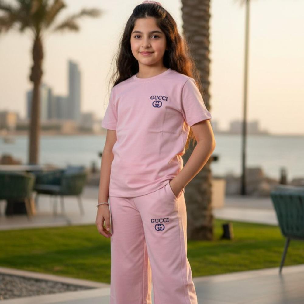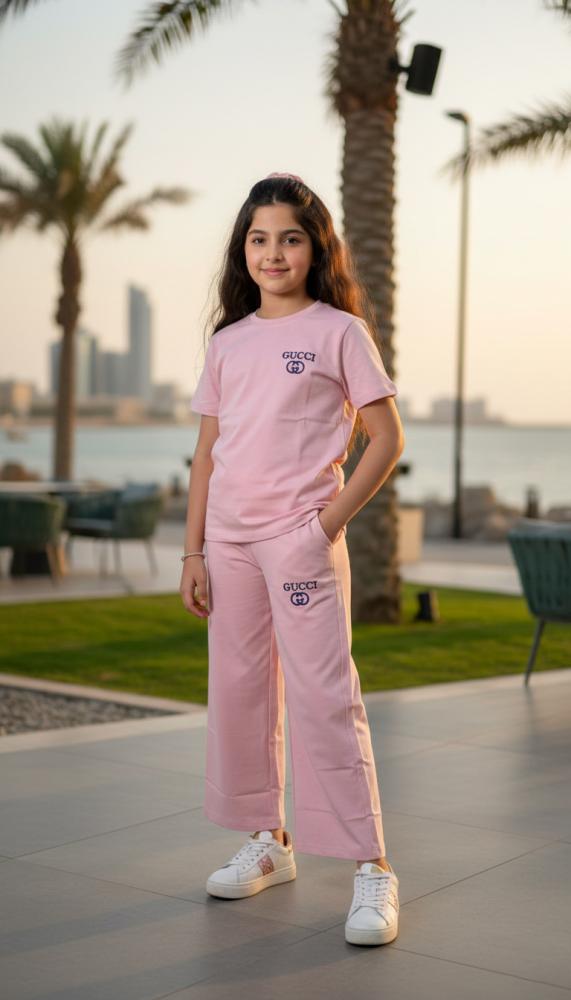 • التصميم: تصميم بسيط وخالٍ من النقوش المعقدة، يعتمد على اللون الوردي المشمشي كقاعدة. البلوزة سادة بخطوط تصميم نظيفة. البنطلون بقصة Jogger عصرية ومريحة بأطراف مطاطية.