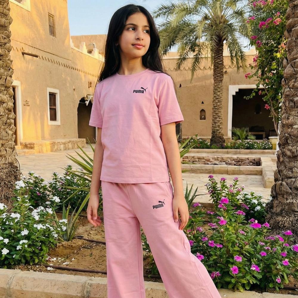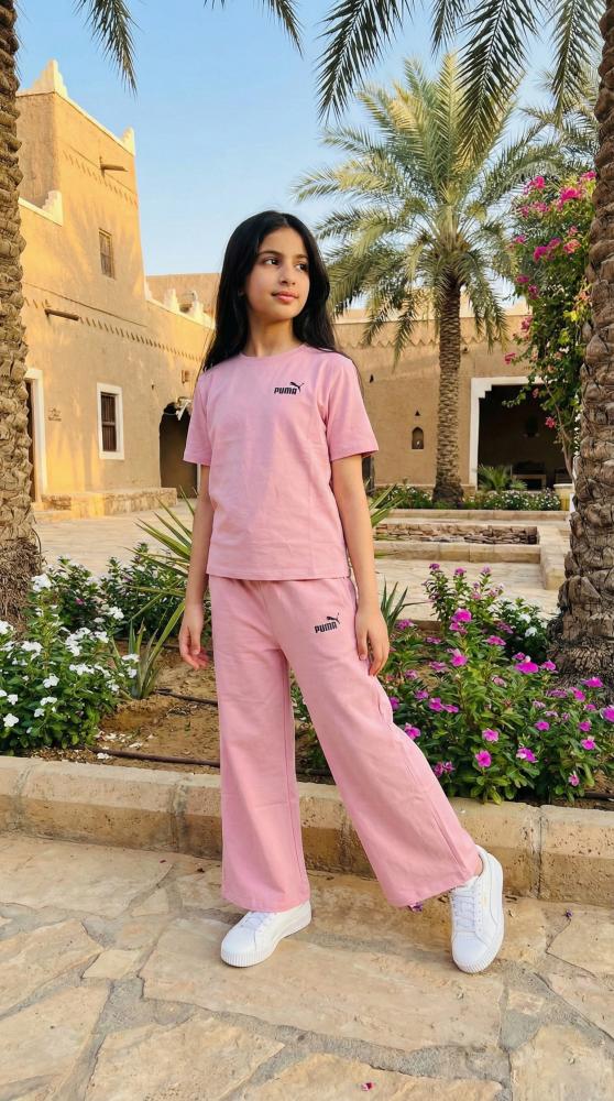 • التصميم: تصميم بسيط وخالٍ من النقوش المعقدة، يعتمد على اللون الوردي المشمشي كقاعدة. البلوزة سادة بخطوط تصميم نظيفة. البنطلون بقصة Jogger عصرية ومريحة بأطراف مطاطية.