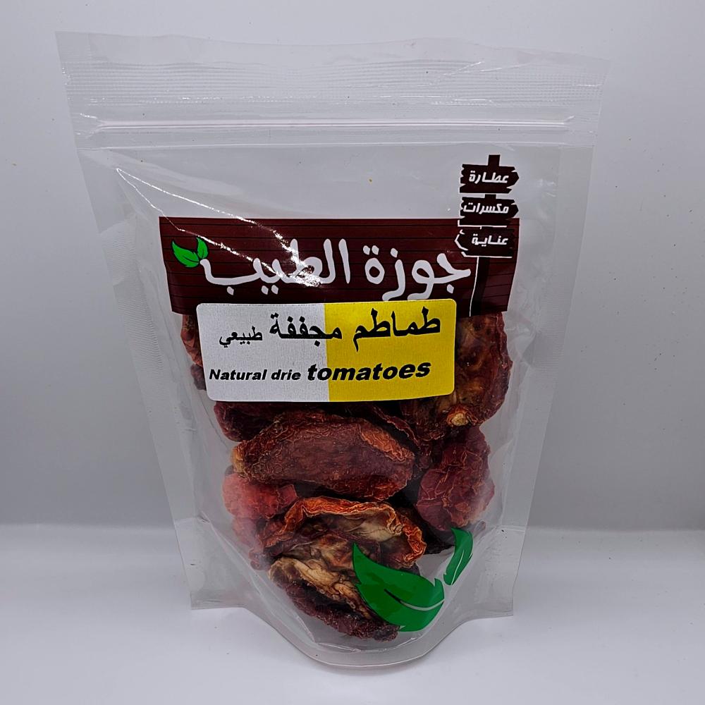 ( اضغط هنا لرؤية قسم الفواكة والخضروات المجففة )الطماطم المجففة الطبيعية من جوزة الطيب :هي ثمار طماطم ناضجة تفقد معظم محتواها من الماء بعد تجفيفها لفترة طويلة تحت أشعة الشمس. هذه العملية، التي غالبًا ما تُعالج فيها الطماطم مسبقًا بثاني أكسيد الكبريت أو الملح لتحسين جودتها ومظهرها، تؤدي إلى تكثيف نكهتها وقيمتها الغذائية بشكل ملحوظ.مواصفات الطماطم المجففة الطبيعية:المظهر: تكون الطماطم المجففة ذات مظهر مجعد ومنكمش، مع لون أحمر داكن يميل إلى البني. قد تحتفظ بعض الأنواع بلمعان خفيف من الطماطم الطازجة، لكنها بشكل عام تكون أكثر جفافاً وملمسها متماسك.القوام: تتميز بقوام مطاطي ومضغي، مما يجعلها أكثر صلابة عند العض أو التقطيع مقارنة بالطماطم الطازجة.الرائحة: لها رائحة طماطم نموذجية مع لمحات من الحلاوة.النكهة: نكهتها تكون مركزة بشكل كبير، مع طعم حلو وحامض (لاذع) وعمق فريد، وقد تحتوي على نفحات من الكراميل أو حتى لمسة مدخنة خفيفة. هذا التركيز في النكهة يجعلها إضافة مميزة للعديد من الأطباق.التحضير: تستغرق عملية التجفيف في الشمس عادةً من 4 إلى 10 أيام. تفقد الطماطم الكرزية حوالي 88% من وزنها الأصلي، بينما قد تفقد الطماطم الأكبر حجماً ما يصل إلى 93% من وزنها. وهذا يعني أن إنتاج كيلوغرام واحد من الطماطم المجففة يتطلب من 8 إلى 14 كيلوغراماً من الطماطم الطازجة.فوائد الطماطم المجففة الطبيعية:قيمة غذائية مركزة: نظرًا لفقدان الماء، تتركز العناصر الغذائية في الطماطم المجففة، فتصبح مصدراً غنياً بالفيتامينات والمعادن ومضادات الأكسدة.غنية بمضادات الأكسدة: تحتوي على نسبة عالية من الليكوبين (وهو مضاد أكسدة قوي)، والبيتا كاروتين، واللوتين، والتي تساهم في حماية الخلايا ودعم الصحة العامة.فيتامينات ومعادن: تعد مصدراً جيداً لفيتامين ج (يدعم المناعة وصحة الجلد)، وفيتامين ك (ضروري لصحة العظام وتخثر الدم)، والمغنيسيوم، والحديد، والبوتاسيوم (لتنظيم ضغط الدم).الألياف: غنية بالألياف الغذائية التي تحسن صحة الجهاز الهضمي وتقلل من فرص الإمساك.منخفضة السعرات الحرارية والدهون: توفر نكهة مميزة وعناصر غذائية دون إضافة الكثير من السعرات الحرارية أو الدهون غير الصحية.استخدامات الطماطم المجففة الطبيعية:تُستخدم الطماطم المجففة الطبيعية في مجموعة واسعة من الأطباق، حيث تضيف نكهة عميقة وغنية. يمكن استخدامها في:الصلصات والمعكرونة: تضفي نكهة مميزة على صلصات الباستا والبيتزا.السلطات والسندويشات: يمكن إضافتها لتعزيز نكهة السلطات والسندويشات.الحساء واليخنات: تمنح الحساء واليخنات عمقاً في النكهة.المقبلات: يمكن تناولها كوجبة خفيفة، أو حشوها بالجبن، أو تقديمها مع أطباق الأنتيباستو (مقبلات إيطالية).الخبز والمعجنات: يمكن إضافتها إلى عجينة الخبز أو البسكويت للحصول على نكهة مميزة.زيت الزيتون: غالبًا ما تُحفظ في زيت الزيتون، وأحياناً مع الأعشاب أو الثوم، مما يعزز نكهتها ويسهل استخدامها