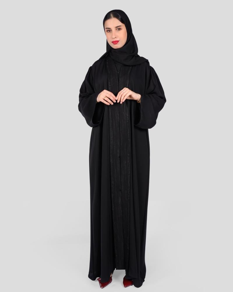 عباءة نسائية بقصة واسعة ومريحة، مصنوعة من قماش جاكار فاخر باللون الأسود. تتميز العباءة بنقشة غائرة لامعة على شكل أوراق شجر وزهور تتوزع على كامل القماش، مما يمنحها مظهرًا فاخرًا. تحتوي على صف أزرار مغطاة بالقماش نفسه تمتد على طول العباءة من الأمام، مما يسمح بارتدائها مفتوحة أو مغلقة. الأكمام مصممة بقصة مستقيمة مع فتحة جانبية صغيرة عند الأطراف. هذه العباءة هي قطعة أساسية تجمع بين الأناقة والعملية.