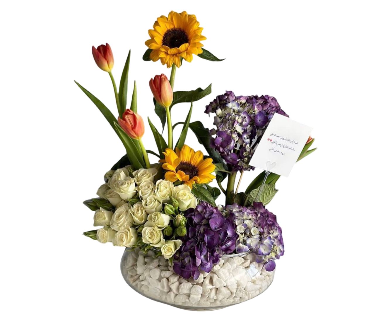 صحن زجاجي مع تنسيقه ورد بيبي روز وتوليب وهايدرانجا وعباد لشمس
