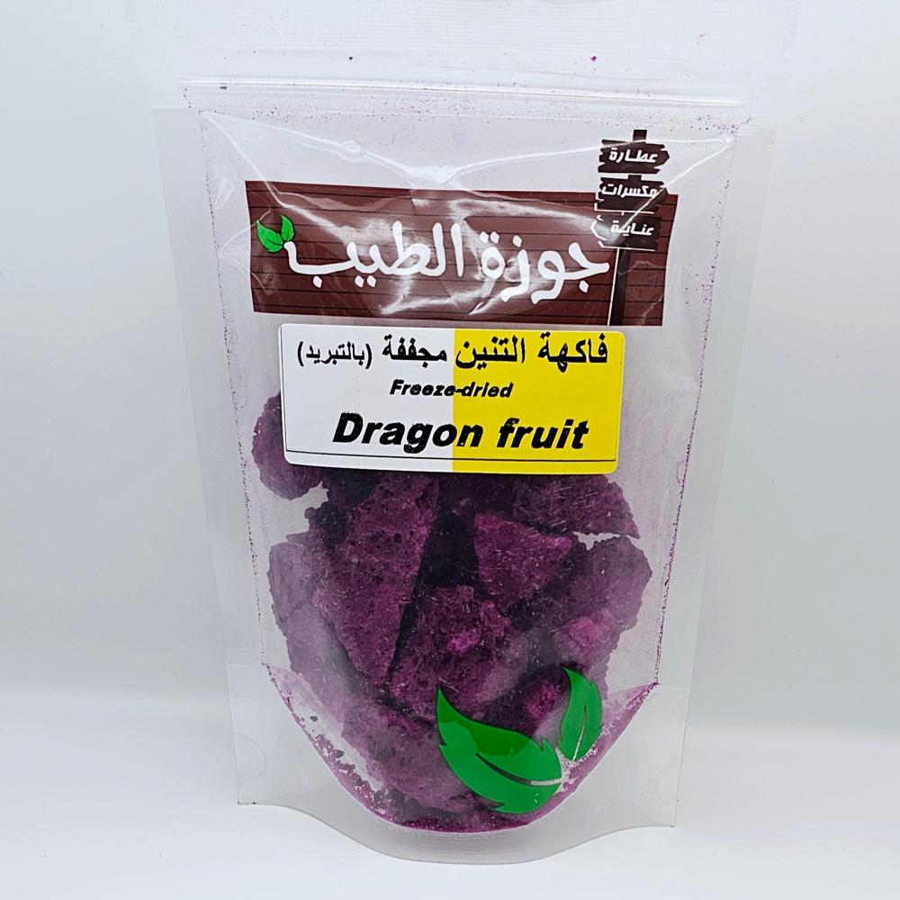 ( اضغط هنا لرؤية قسم الفواكة المجففة )فاكهة التنين البنفسجية المجففة بالتبريد من جوزة الطيب :المظهر: تتميز فاكهة التنين البنفسجية المجففة بالتجميد بلونها البنفسجي الزاهي والساحر، الذي يشبه ألوان اللافندر. تحتفظ الفاكهة بشكلها الأصلي إلى حد كبير، ولكنها تصبح هشة وخفيفة الوزن جداً، مع وجود البذور السوداء المميزة التي تظهر بوضوح.القوام: على عكس الفاكهة المجففة التقليدية التي تكون مطاطية، فإن فاكهة التنين المجففة بالتجميد لها قوام مقرمش وخفيف، يشبه رقائق البطاطس أو "الشيبس". تذوب في الفم بسهولة.النكهة: نكهة فاكهة التنين البنفسجية المجففة بالتجميد تكون مركزة ومكثفة أكثر من الفاكهة الطازجة. عادة ما تكون حلوة قليلاً مع لمسة من الحموضة الخفيفة، مما يبرز طعمها الاستوائي الفريد.الرائحة: لها رائحة استوائية لطيفة ومميزة لفاكهة التنين.الفوائد الرئيسية للتجفيف بالتجميد لفاكهة التنين:تعتبر فاكهة التنين المجففة بالتجميد خياراً ممتازاً لما تقدمه من فوائد:الحفاظ على القيمة الغذائية: هذه التقنية تحافظ على ما يصل إلى 97% من العناصر الغذائية والفيتامينات والمعادن الموجودة في الفاكهة الطازجة، بما في ذلك فيتامين C ومضادات الأكسدة (مثل البيتالين والكاروتينات) والألياف.لون طبيعي زاهٍ: تظل الألوان الطبيعية للفاكهة حية وزاهية دون الحاجة إلى ألوان صناعية.قوام فريد: القوام المقرمش يجعلها وجبة خفيفة ممتعة ومختلفة.طبيعية 100%: عادةً ما تكون خالية من السكر المضاف والمواد الحافظة والإضافات الصناعية.مدة صلاحية طويلة: يمكن تخزينها لفترات طويلة دون أن تفقد جودتها أو نكهتها.سهلة الاستخدام: لا تحتاج إلى تقشير أو تقطيع، وهي جاهزة للأكل مباشرة.استخدامات فاكهة التنين البنفسجية المجففة بالتجميد:تعتبر إضافة ممتازة ومتعددة الاستخدامات:وجبة خفيفة: يمكن تناولها بمفردها كوجبة خفيفة صحية ومقرمشة.السموثي والعصائر: يمكن طحنها وإضافتها إلى السموثي والعصائر لإضفاء لون بنفسجي جميل ونكهة استوائية.تزيين الحلويات: تستخدم كزينة أنيقة لطبقات الكيك، الكب كيك، الآيس كريم، أو البودنغ.مع الزبادي والشوفان: تُضاف إلى الزبادي أو الشوفان أو حبوب الإفطار لتعزيز النكهة والقيمة الغذائية.المخبوزات: يمكن دمجها في وصفات المخبوزات مثل الكعك أو البسكويت.السلطات: تضفي لمسة من النكهة والقوام المميز على سلطات الفاكهة أو حتى السلطات الخضراء.