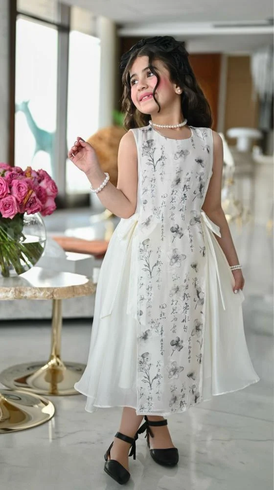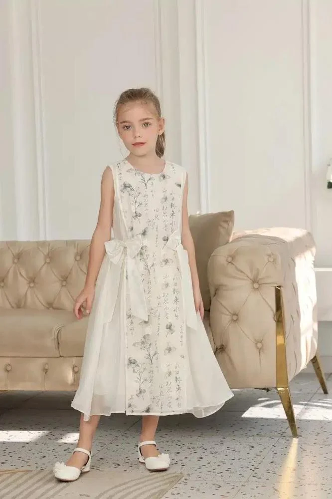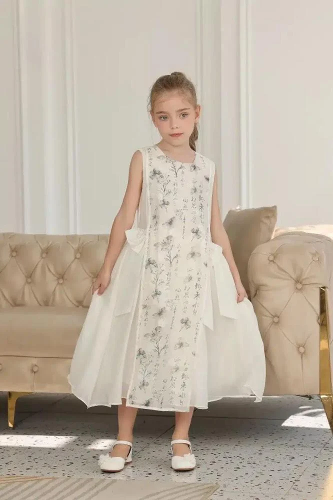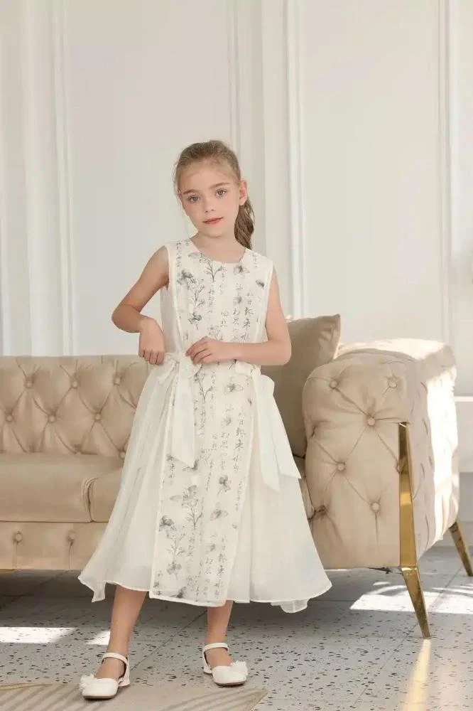 فستان بناتي فاخر بتصميم جذاب، مزين بطبعات زهور ناعمة مع تنورة منفوشة من التول تضفي عليه لمسة أنثوية ساحرة. يتميز بربطة أنيقة من الخلف، ما يجعله مثالياً للمناسبات المميزة.