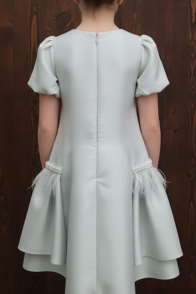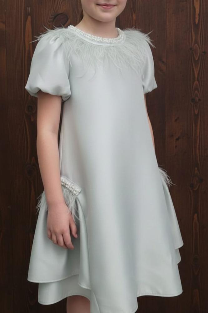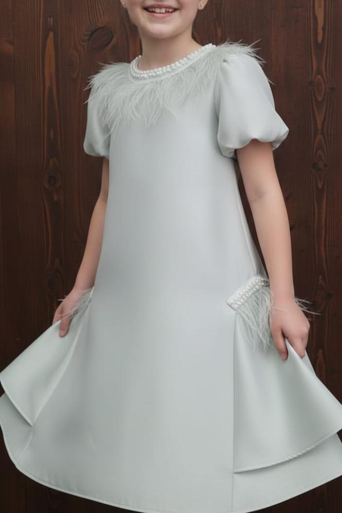 فستان اخظر فاتح بالريش والؤلؤ على العنق والجوانب