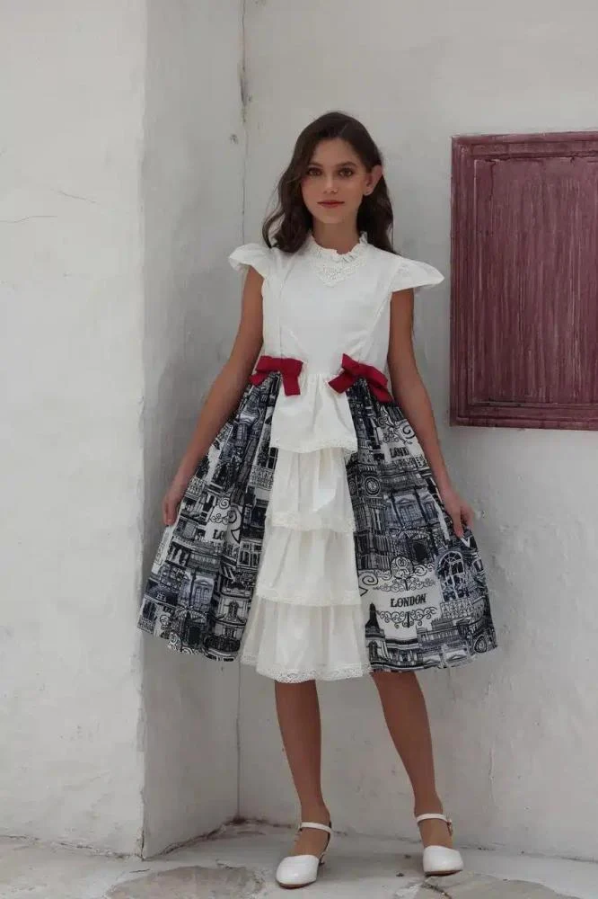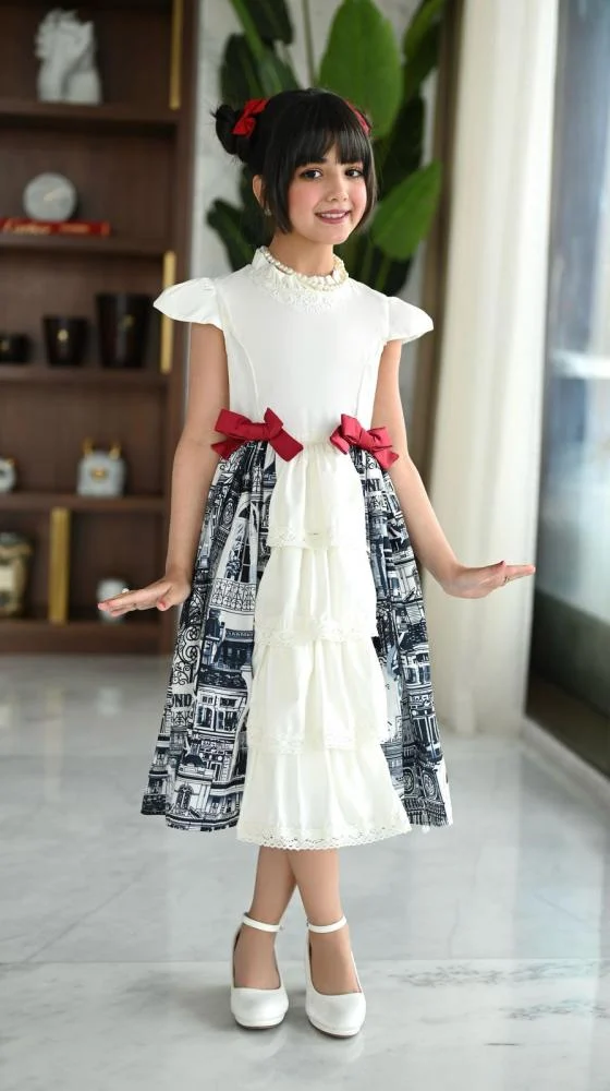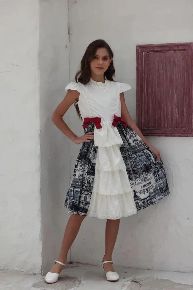 التصميم: كلوش بطبقات، فيونكة حمراء على الخصر، بدون أكمام (كت)، تصميم أنيق وفاخر
