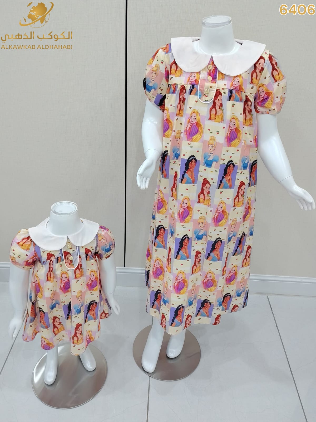فستان بناتي بتصميم كرتوني لطيف، بلون كريمي مزين بطبعات أميرات ملونة، مع ياقة بيتر بان بيضاء وأكمام منفوشة قصيرة تمنح إطلالة مرحة وجميلة للأطفال.