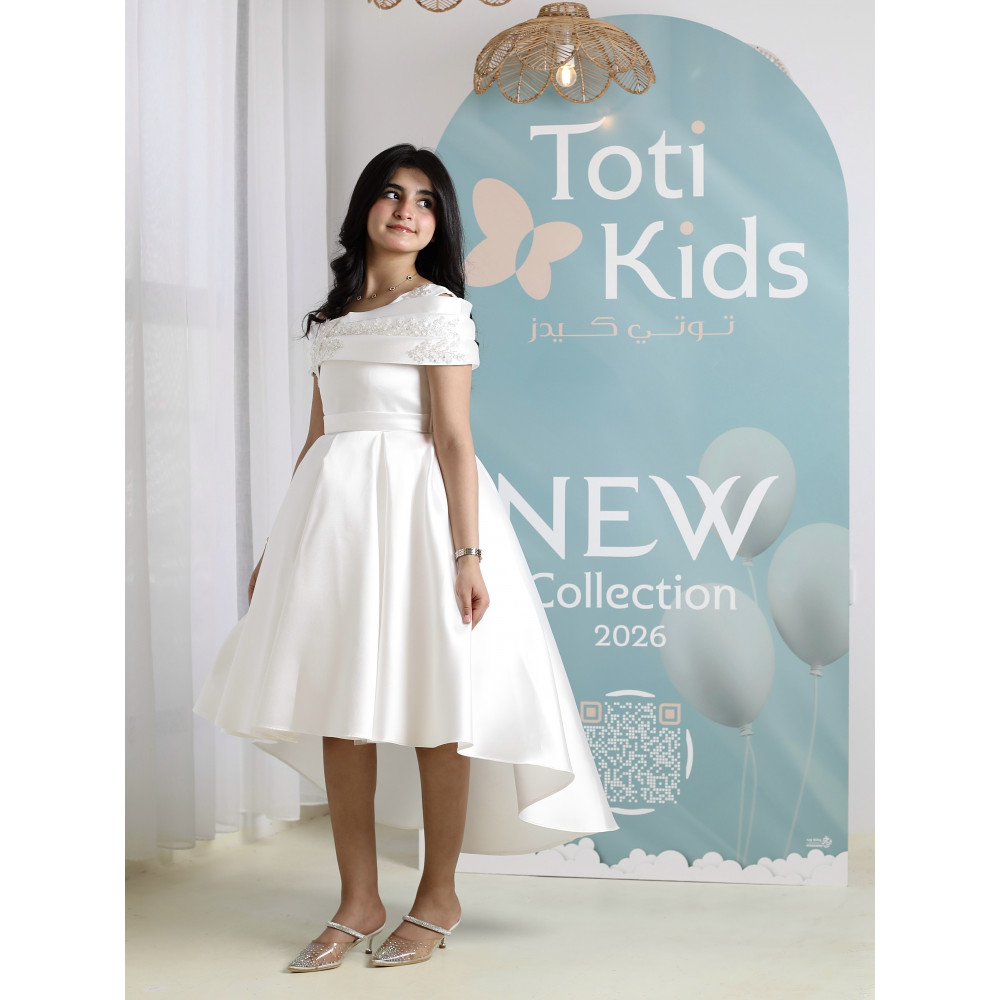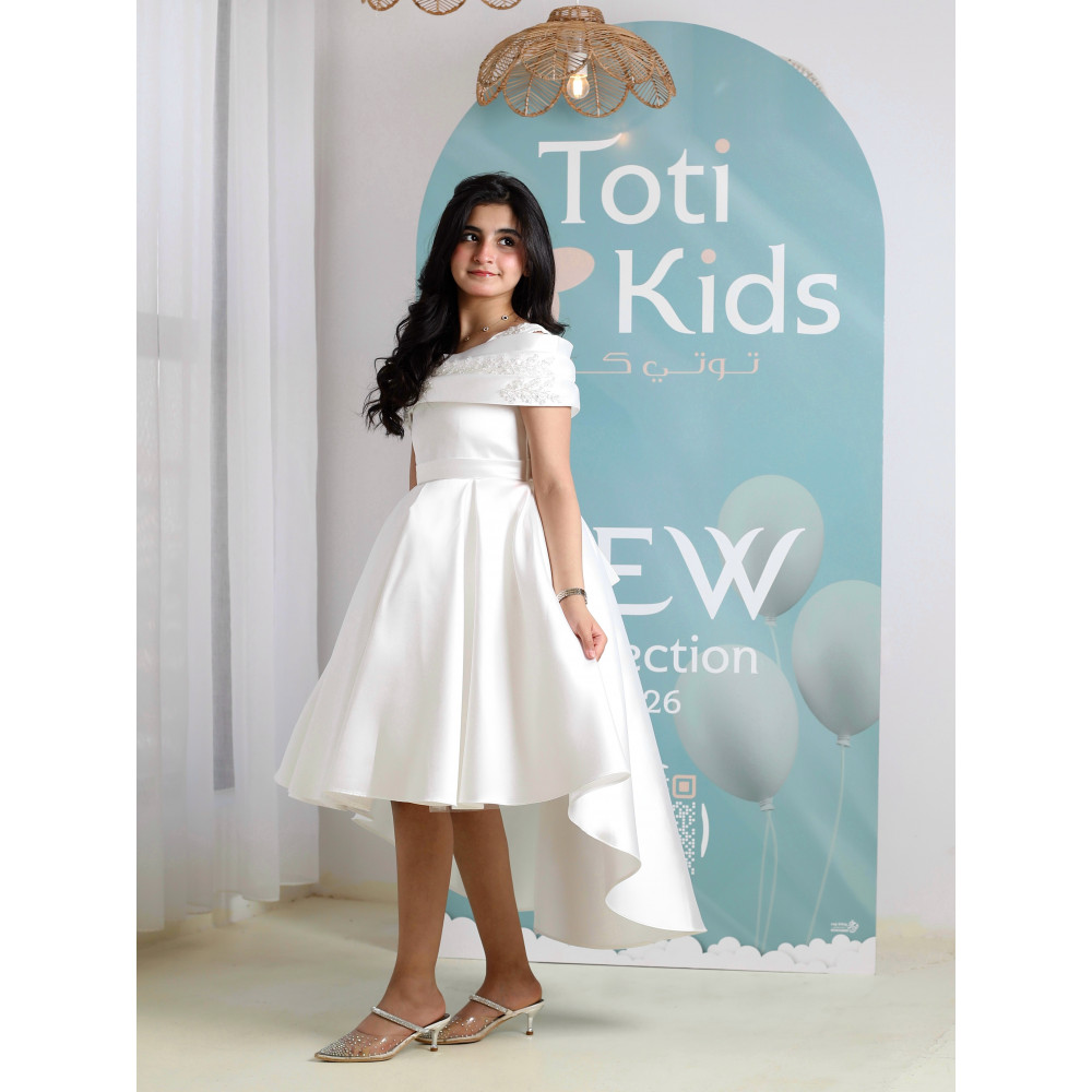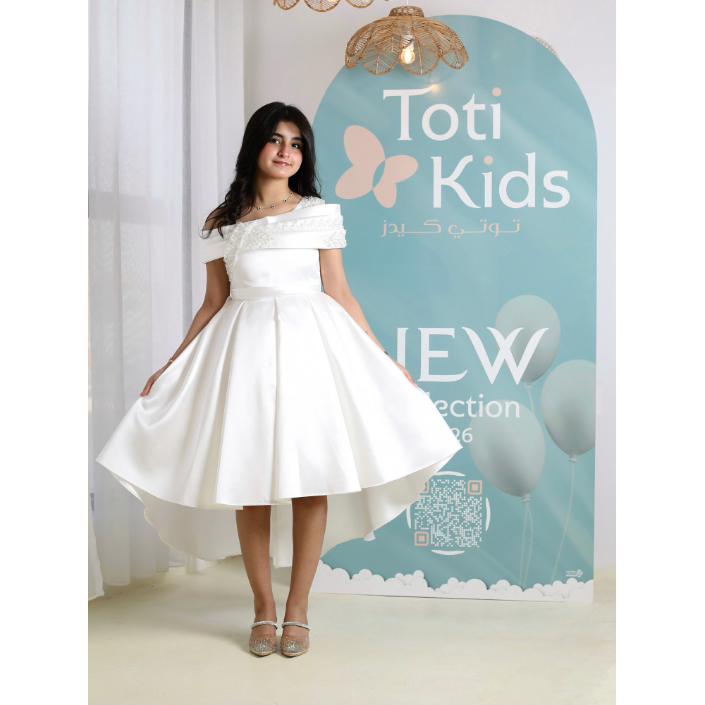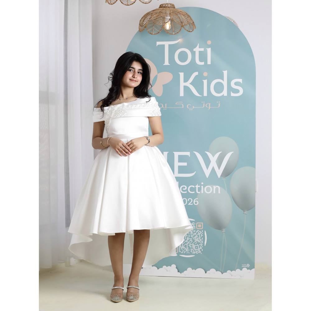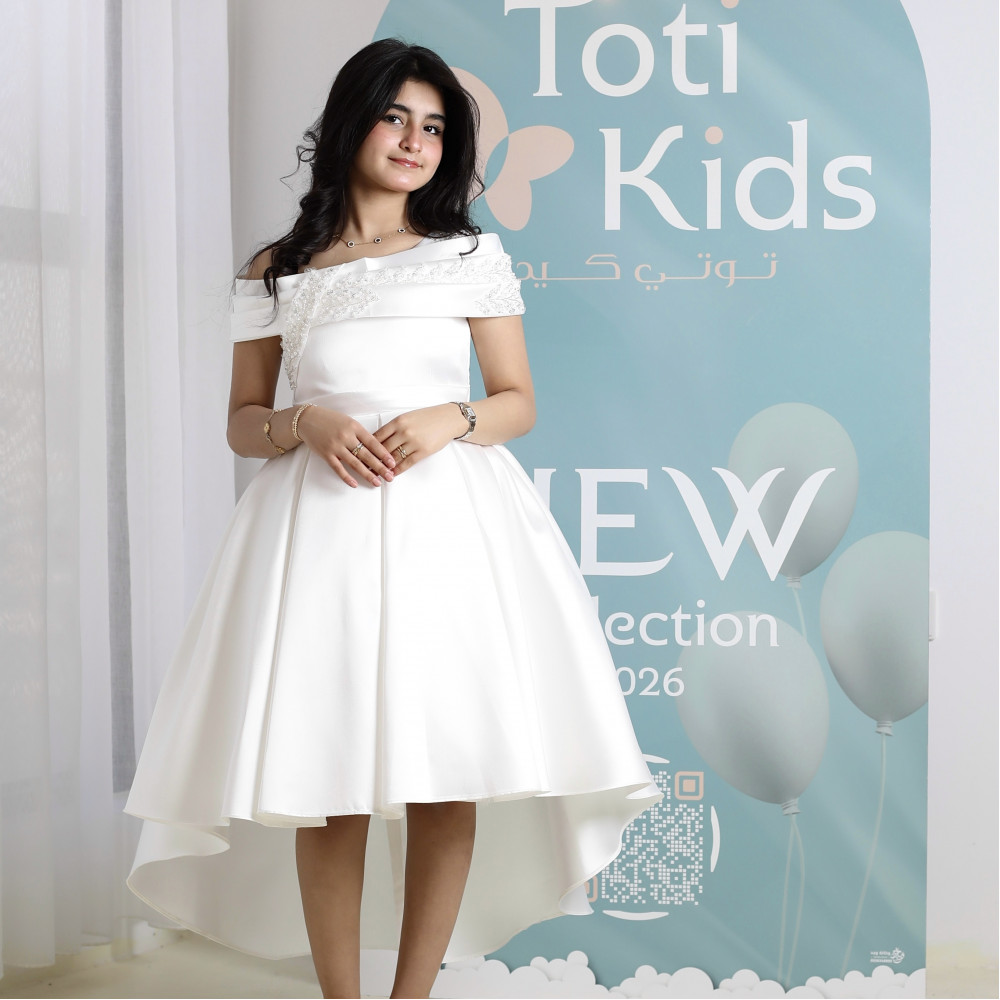 إطلالة ملائكية.. سحرٌ يجمع بين النقاء والجرأةلكل أميرة إطلالة تبرز تفردها، وهذا الفستان صُمم ليحكي قصة من النقاء والأناقة. نقدم لكِ قطعة فنية تجمع بين البياض الملائكي، والجرأة الراقية لقصة الأكتاف المكشوفة، والفخامة العصرية لتصميم الهاي-لو. كل تفصيلة في هذا الفستان، من الكريستال اللامع على الصدر إلى طيات الساتان الغنية، صُنعت لتمنح أميرتك إطلالة استثنائية تجعلها محط الأنظار في كل مناسبة كبرى، خاصة كـ فستان مثالي لفتيات الزهور (Flower Girl). لماذا هذا الفستان هو إطلالة الأميرات العصرية؟لأنه يجمع بين التصميم الجريء، فخامة الساتان، وتفاصيل تخطف الأنظار.تصميم أوف شولدر راقٍ: يتميز الفستان بقصة "أوف شولدر" (Off-shoulder) أنيقة، مع صدر مرصع بالكريستال البراق الذي يضفي لمسة من الفخامة والجاذبية.قصة هاي لو (High-low) عصرية: يأتي الفستان بقصة "هاي لو" مميزة، قصيرة من الأمام وطويلة من الخلف، مما يمنح إطلالة درامية وعصرية تبرز جمال التصميم.قماش ساتان فاخر (أبيض نقي): صُنع هذا الفستان البناتي الأبيض الفاخر من أجود أنواع قماش الساتان المتماسك، الذي يمنح التنورة قصتها المنفوشة بكسرات غنية.تفاصيل خلفية أنيقة: يكتمل التصميم من الخلف بفيونكة ناعمة أعلى السحاب، تضيف لمسة من الرقة المتكاملة.مثالي للأفراح والمناسبات الكبرى: هذا الفستان الأبيض للأفراح هو الخيار الأول لحفلات الزفاف، والأعياد، والمناسبات التي تتطلب إطلالة عصرية وفاخرة. جودة تليق بأميرتكعند البحث عن فستان سهرة بناتي فاخر، فإن هذا التصميم يقدم كل ما تبحثين عنه من فخامة وجودة. مصنوع بحرفية عالية ليدوم طويلاً ويبقى ذكرى لأجمل اللحظات. ✨ اطلبيه الآن لتتألق بإطلالة ملائكية لا تُنسى! ✨