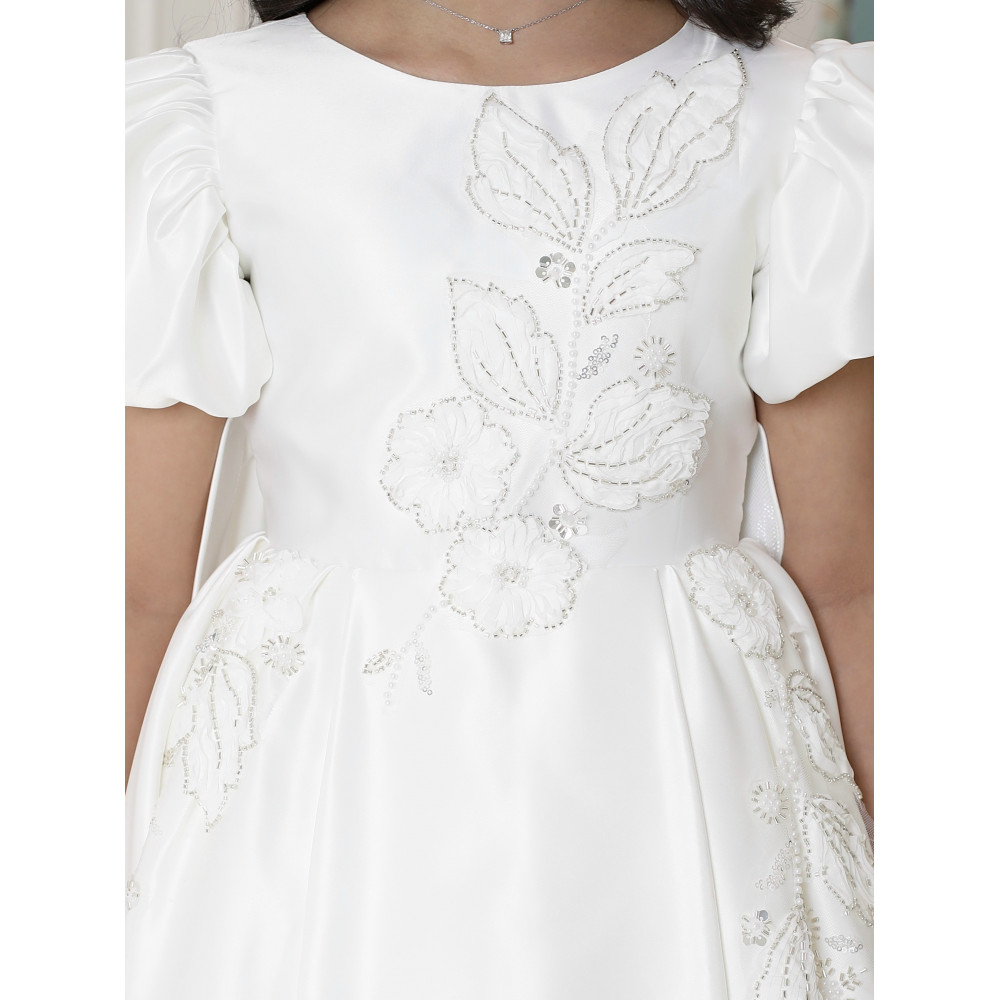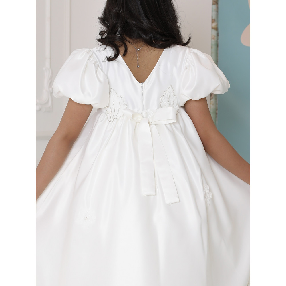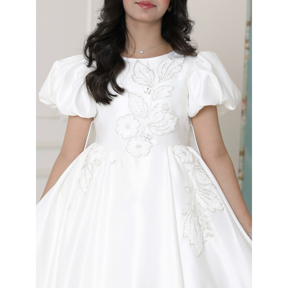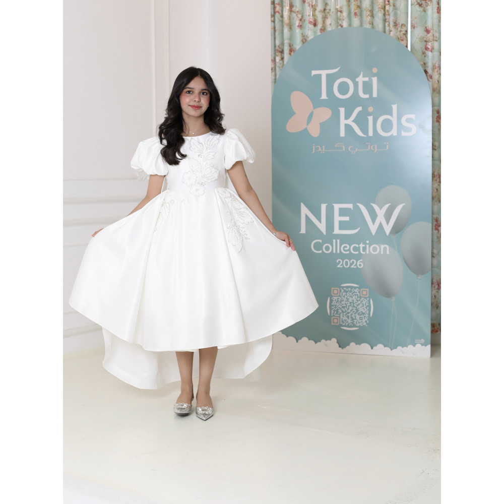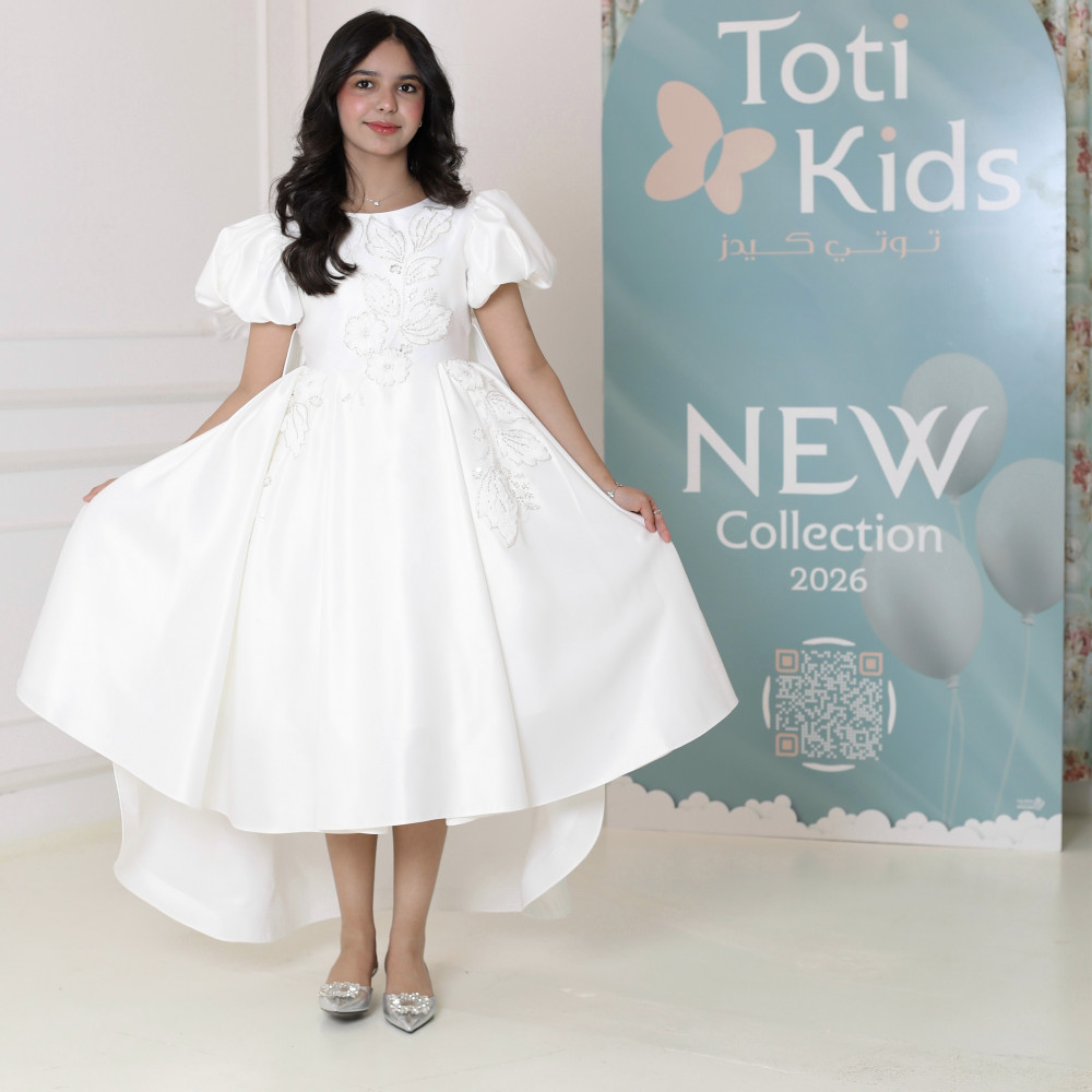 إطلالة ملائكية.. تصميم يجمع الفخامة والبراءةلكل أميرة إطلالة تروي قصة أحلامها، وهذا الفستان هو حكاية من الفخامة والرقي. نقدم لكِ تحفة فنية مصممة لتتويج طفلتك كنجمة الحفل، حيث تجتمع الأكمام الملكية المنفوشة التي تضفي هيبة، مع التطريزات البيضاء الفاخرة التي تنسدل كالأغصان المزهرة. بلونه الأبيض النقي وقصته العصرية، صُنع هذا الفستان ليكون القطعة الأيقونية في أهم مناسباتها، ليمنحها إطلالة لا تُنسى تجمع بين فخامة الأميرات وبراءة الطفولة. لماذا هذا الفستان هو قطعة ملكية بامتياز؟لأنه يجمع بين تصميم درامي، فخامة الأقمشة، وتفاصيل تخطف الأنظار.أكمام ملكية منفوشة: يتميز الفستان بأكمام قصيرة منفوشة (Puff Sleeves) بتصميم ملكي، تضفي لمسة من الفخامة والتميز على الإطلالة.تطريز يدوي فاخر: يزدان الفستان بتطريزات يدوية نافرة باللون الأبيض، تنسدل بأناقة من الصدر إلى جانب التنورة، مما يخلق تباينًا ساحرًا وجذابًا.قصة هاي لو (High-low) عصرية: يأتي الفستان بقصة "هاي لو" مميزة، قصيرة من الأمام وطويلة من الخلف، مما يمنح إطلالة درامية وعصرية تبرز جمال التصميم.قماش ساتان فاخر (ميكادو): صُنع هذا الفستان البناتي الأبيض الفاخر من أجود أنواع قماش الساتان المتماسك (ميكادو)، الذي يمنح التنورة قصتها المنفوشة بكسرات غنية.مثالي للمناسبات الكبرى: هذا الفستان الأبيض للأفراح هو الخيار الأول لحفلات الزفاف، والأعياد، والمناسبات التي تتطلب إطلالة ملكية استثنائية.جودة تليق بإطلالة لا تُنسى عند البحث عن فستان سهرة بناتي فاخر، فإن هذا التصميم يقدم كل ما تبحثين عنه من فخامة وجودة. مصنوع بحرفية عالية ليدوم طويلاً ويبقى ذكرى لأجمل اللحظات.✨ اطلبيه الآن لتتألق بإطلالة ملائكية استثنائية! ✨