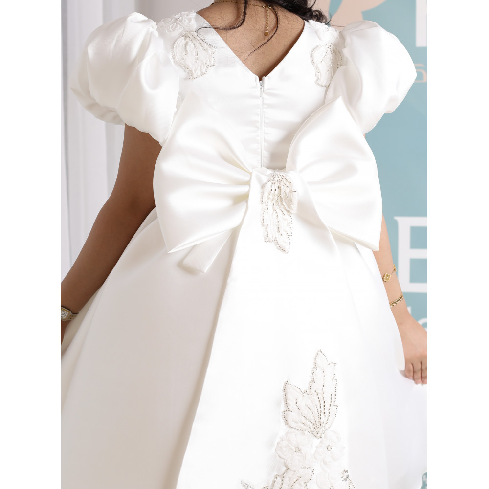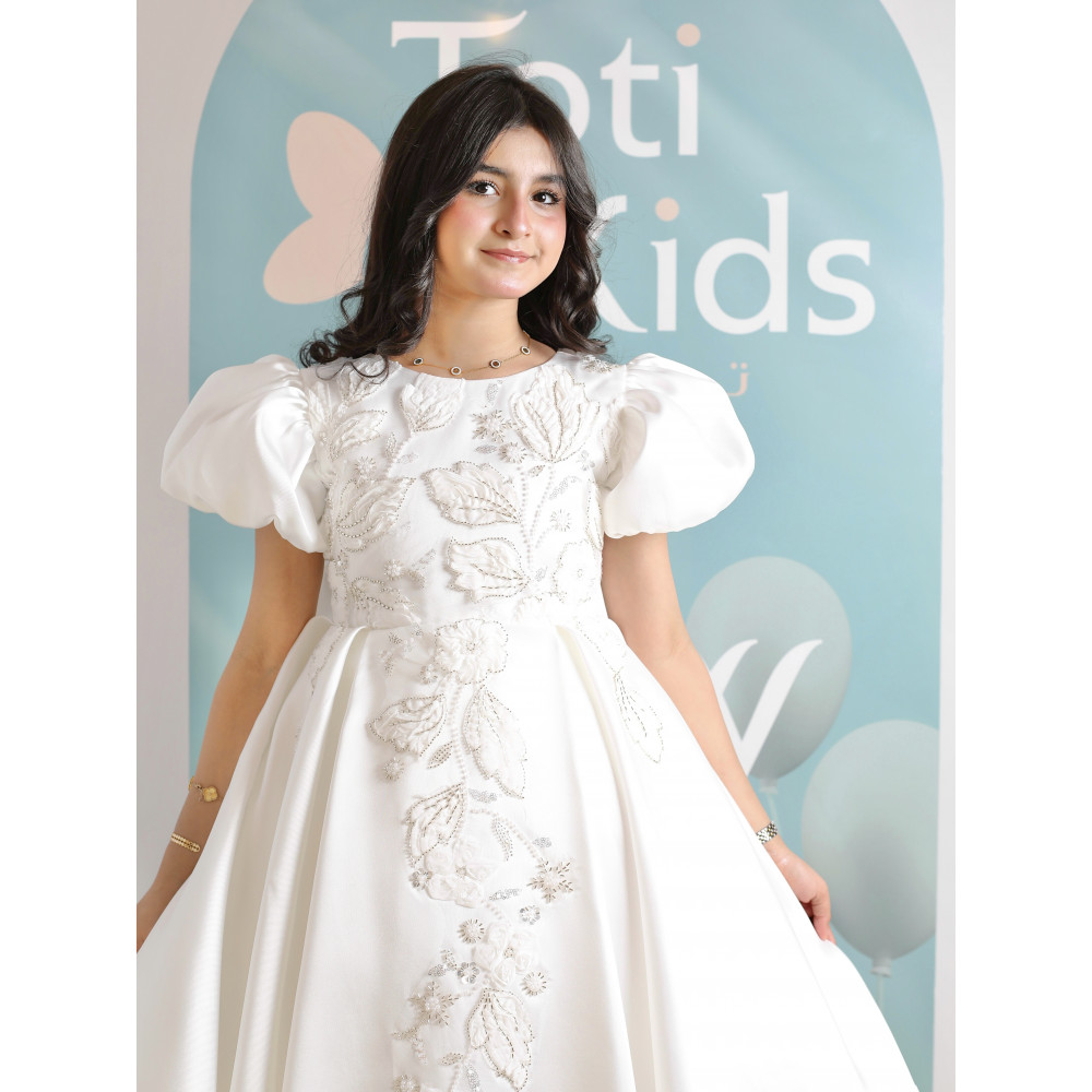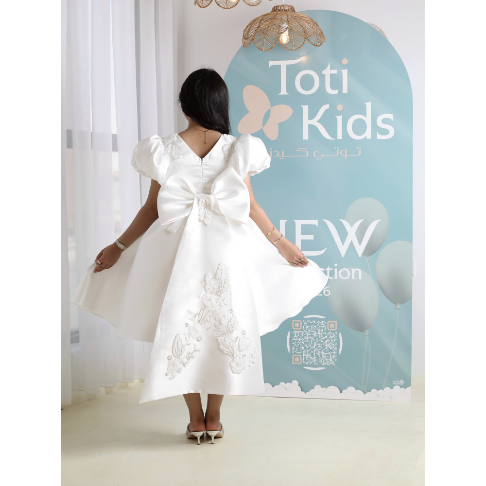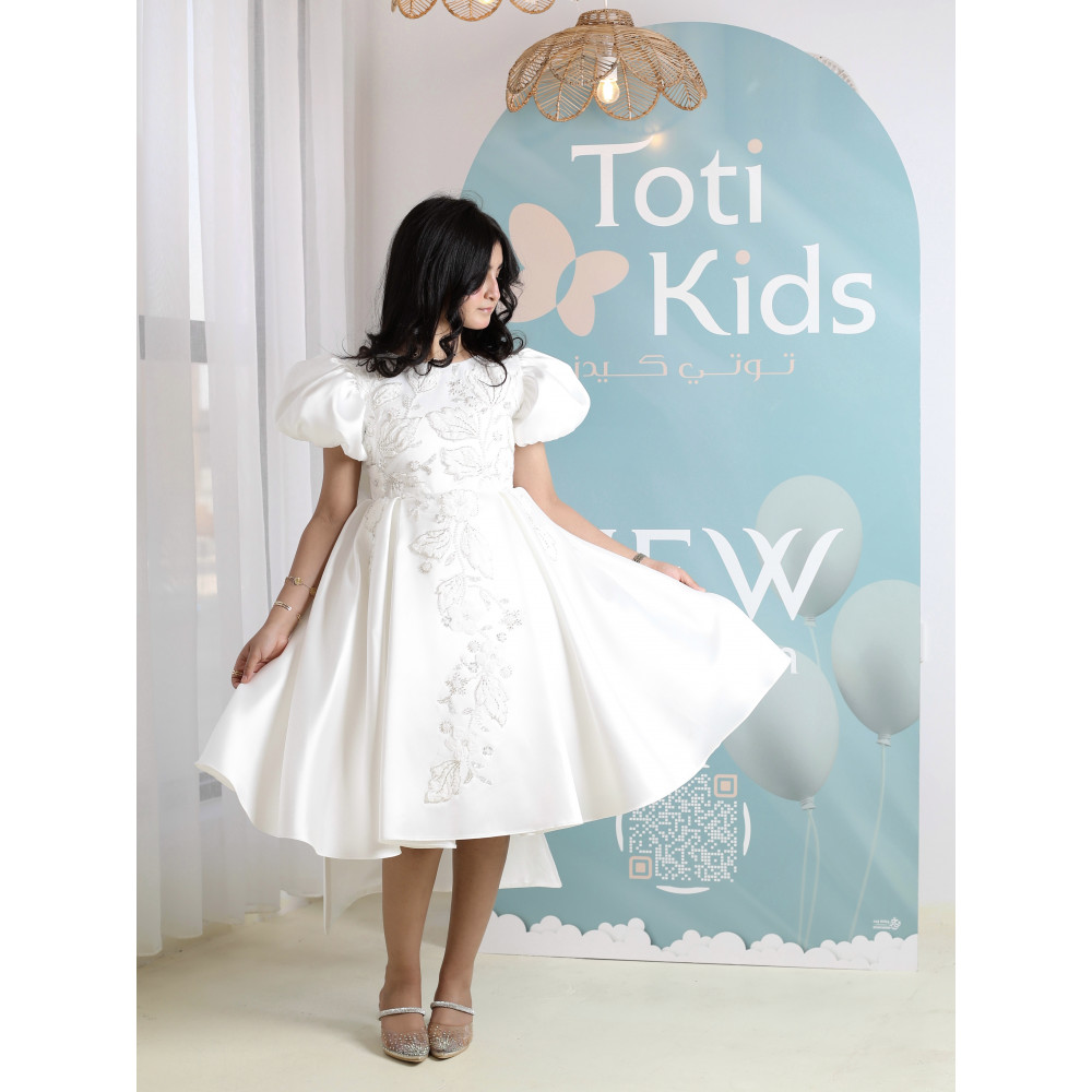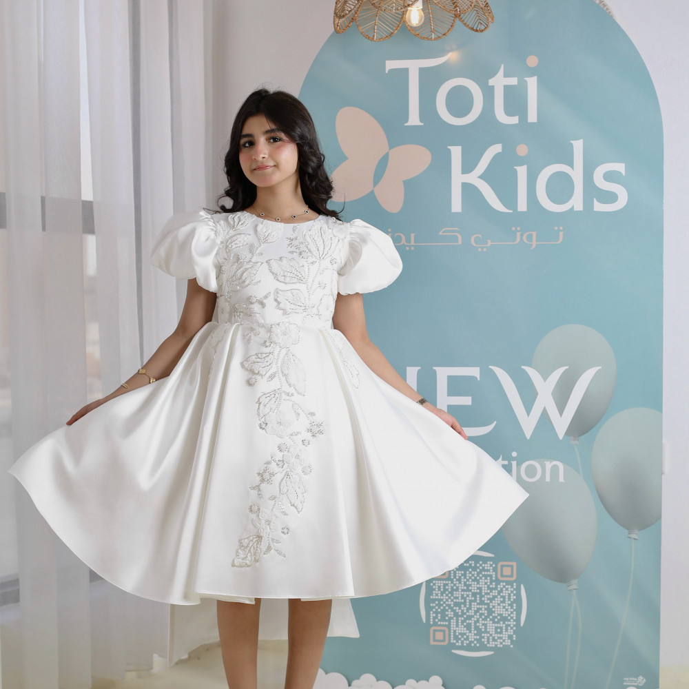 إطلالة ملائكية.. قطعة منسوجة من الفخامة والنورهناك فساتين مصممة لتكون جميلة، وهناك فساتين مصممة لتكون أيقونية. هذا الفستان ينتمي للفئة الثانية. نقدم لكِ تحفة فنية ملكية، مصممة لتتويج أميرتك كنجمة الحفل بإطلالة نقية تخطف الأنفاس. يجمع هذا التصميم بين فخامة التطريز الذي يغطي الصدر بالكامل، والأكمام المنفوشة التي تضفي هيبة ملكية، ومفاجأة خلفية ساحرة. إنه ليس مجرد فستان، بل هو قطعة استثنائية مصممة لأهم لحظات العمر. لماذا هذا الفستان هو قطعة ملكية بامتياز؟لأنه يجمع بين تصميم درامي فاخر، جودة لا تضاهى، وتفاصيل تخطف الأنظار من كل زاوية.تطريز فاخر ومتكامل: يتميز الفستان بصدرية مطرزة بالكامل بتطريزات يدوية نافرة، تنسدل بأناقة على التنورة لتخلق لوحة فنية متكاملة من الرقي.أكمام ملكية منفوشة: تضفي الأكمام القصيرة المنفوشة (Puff Sleeves) لمسة من الفخامة المستوحاة من إطلالات الأميرات، مما يمنح التصميم طابعًا فريدًا.فيونكة خلفية ضخمة: يكتمل السحر من الخلف بفيونكة ضخمة الحجم، تضفي لمسة درامية وتجعل الإطلالة لا تُنسى من كل الزوايا.قصة هاي لو (High-low) عصرية: يأتي الفستان بقصة "هاي لو" مميزة، قصيرة من الأمام وطويلة من الخلف، مما يمنح إطلالة عصرية تبرز جمال التصميم وتفاصيله.مثالي لأهم المناسبات: هذا الفستان الأبيض للأفراح هو الخيار الأمثل لفتيات الزهور (Flower Girl)، والأعياد، والمناسبات التي تتطلب إطلالة ملائكية استثنائية.جودة تليق بإطلالة العمر عند البحث عن فستان سهرة بناتي أبيض فاخر، فإن هذا التصميم يقدم كل ما تبحثين عنه. مصنوع من أجود أنواع قماش الساتان المتماسك الذي يمنح التنورة قصتها المنفوشة، مع بطانة ناعمة لراحة تامة.✨ اطلبيه الآن لتتألق بإطلالة ملكية لا تُنسى! ✨