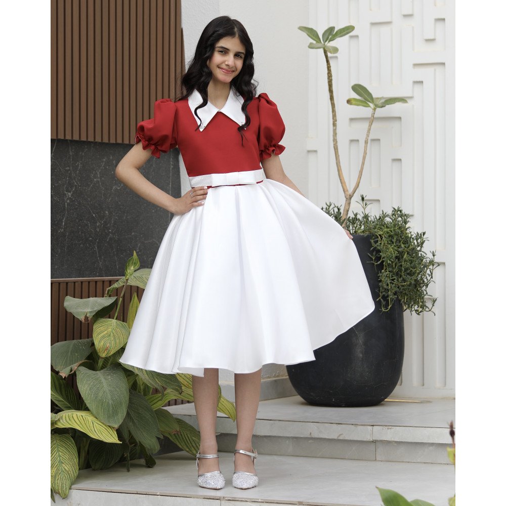 فستان بناتي أحمر بتنورة بيضاء مدمجة | تصميم ياقة "دلعة" مرصعة - 1162