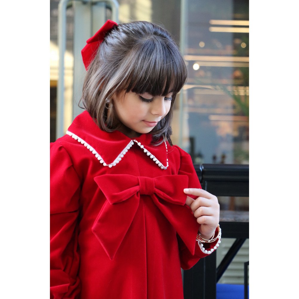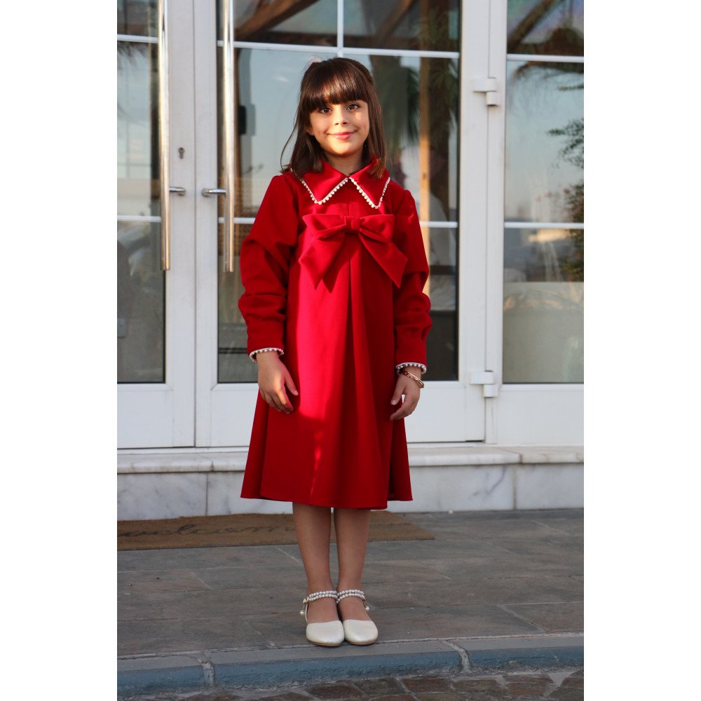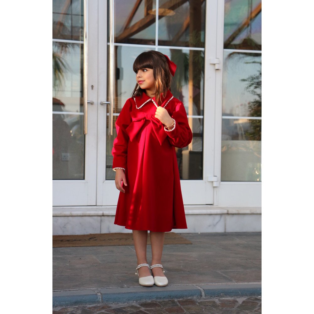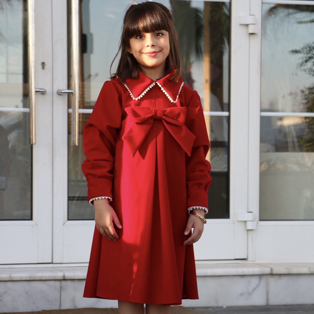 سحر اللون الأحمر.. وأناقة التفاصيل الكلاسيكيةهناك إطلالات تصنع البهجة بمجرد رؤيتها، وهذا الفستان الأحمر هو عنوان للفرح والأناقة الخالدة. نقدم لكِ قطعة فنية مستوحاة من جمال الزمن الجميل، تجمع بين دفء اللون الأحمر وجاذبية التفاصيل الدقيقة. بفيونكته الكبيرة التي تتوسط التصميم وياقته المرصعة بحبات اللؤلؤ، يمنح هذا الفستان طفلتك إطلالة "الدمية" الساحرة، لتكون محط الأنظار ومصدر البهجة في كل تجمع عائلي أو مناسبة احتفالية. لماذا هذا الفستان هو الخيار الأمثل للعيد والمناسبات؟لأنه يجمع بين التصميم المميز، فخامة التفاصيل، والراحة المطلقة.فيونكة أمامية كبيرة: يتميز الفستان بفيونكة ضخمة وأنيقة تتوسط الصدر، تضفي لمسة من البراءة والتميز وتجعل من الفستان قطعة فريدة لا تشبه غيرها.ياقة وأساور مرصعة باللؤلؤ: يزدان الفستان بياقة كلاسيكية وأطراف أكمام مزينة بصف من اللؤلؤ الأبيض الناعم، مما يضفي لمسة من الفخامة والرقي الكلاسيكي.لون أحمر نابض بالحياة: يأتي الفستان بلون أحمر غني وجذاب، وهو اللون المفضل للاحتفالات والأعياد، ليمنح طفلتك حضورًا مشرقًا ومبهجًا.قصة مريحة وأنيقة: مصمم بقصة واسعة قليلاً (A-line) مع كسرات ناعمة، ليضمن لأميرتك حرية الحركة واللعب مع الحفاظ على مظهرها الأنيق والمرتب.مثالي لكل الأوقات: هذا الفستان الأحمر الكلاسيكي هو الخيار الأول لملابس العيد، جلسات التصوير، والحفلات المدرسية والعائلية. جودة تليق بجمال طفلتكعند البحث عن فستان بناتي أحمر فخم، فإن الجودة هي المعيار الأول. هذا الفستان مصنوع من خامات عالية الجودة، ناعمة على البشرة ومصممة لتدوم وتحتفظ برونقها مناسبة بعد مناسبة. ✨ اطلبيه الآن لتتألق بإطلالة كلاسيكية تخطف القلوب! ✨