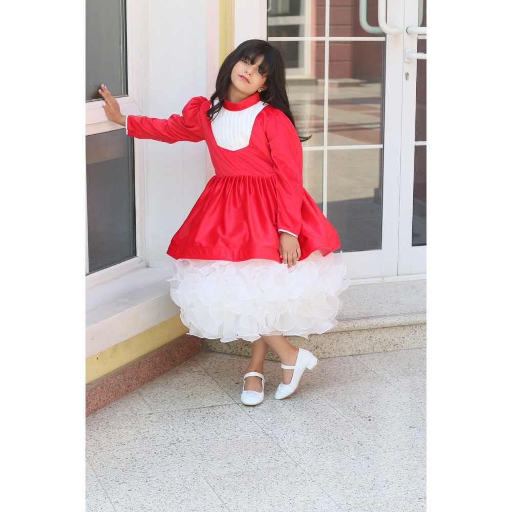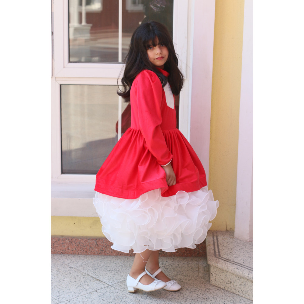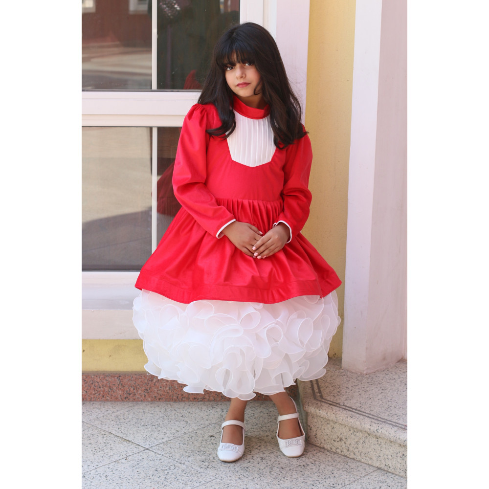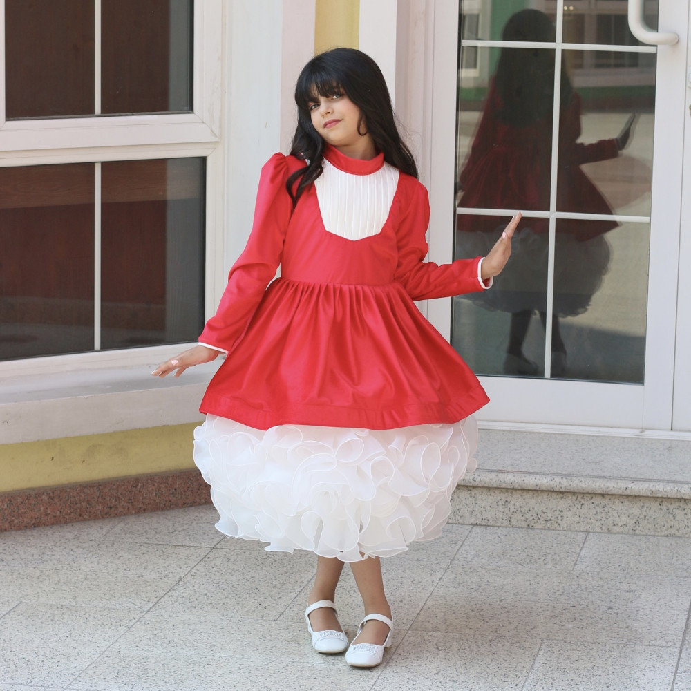 إطلالة احتفالية.. تصميم يخطف الأنظارهناك فساتين مصممة لتكون حديث الجميع، وهذا الفستان هو واحد منها. نقدم لكِ قطعة فنية تجمع بين اللون الأحمر الاحتفالي الجريء وتصميم "الكب كيك" الأبيض المنفوش، ليمنح أميرتك إطلالة استثنائية لا مثيل لها. صُمم هذا الفستان ليكون نجم المناسبات الشتوية، بتفاصيله الكلاسيكية في الأعلى وقصته الدرامية والمرحة في الأسفل. إنه ليس مجرد فستان، بل هو قطعة أيقونية مصممة للفتاة التي تحب أن تكون محط الأنظار. لماذا هذا الفستان هو قطعة الشتاء الاحتفالية؟لأنه يجمع بين التصميم الدرامي، الأقمشة الدافئة، والتفاصيل الراقية.تصميم "كب كيك" فريد: يتميز الفستان بتنورة بيضاء منفوشة من طبقات التل (أو الأورجانزا) المكشكشة، تظهر أسفل الفستان الأحمر لتمنحها حجمًا غنيًا ومظهرًا احتفاليًا فريدًا.فخامة اللون الأحمر: صُنع الجزء العلوي من الفستان البناتي الأحمر من قماش فاخر (قد يكون مخمل أو ساتان ثقيل)، ليوفر دفئًا ومظهرًا ملكيًا.تفاصيل كلاسيكية راقية: يأتي الفستان بصدرية بيضاء ذات كسرات ناعمة (Pleated bib)، وياقة كلاسيكية، مما يضفي لمسة من الرقي والفخامة على التصميم.دفء وراحة: يأتي الفستان بأكمام طويلة ليضمن لأميرتك الدفء الكامل، مع قصة مريحة تسمح لها باللعب والحركة بحرية.مثالي للأعياد: هذا الفستان الشتوي الفاخر هو الخيار الأول لحفلات رأس السنة، الأعياد، والزيارات العائلية الرسمية.جودة تليق بليالي الشتاء الفاخرة عند البحث عن ملابس شتوية للمناسبات، فإن هذا التصميم يقدم مزيجًا مثاليًا من الدفء والأناقة الاستعراضية. مصنوع بحرفية عالية ليدوم طويلاً ويحافظ على رونقه.✨ اطلبيه الآن لتتألق أميرتك بإطلالة احتفالية تخطف الأنظار! ✨