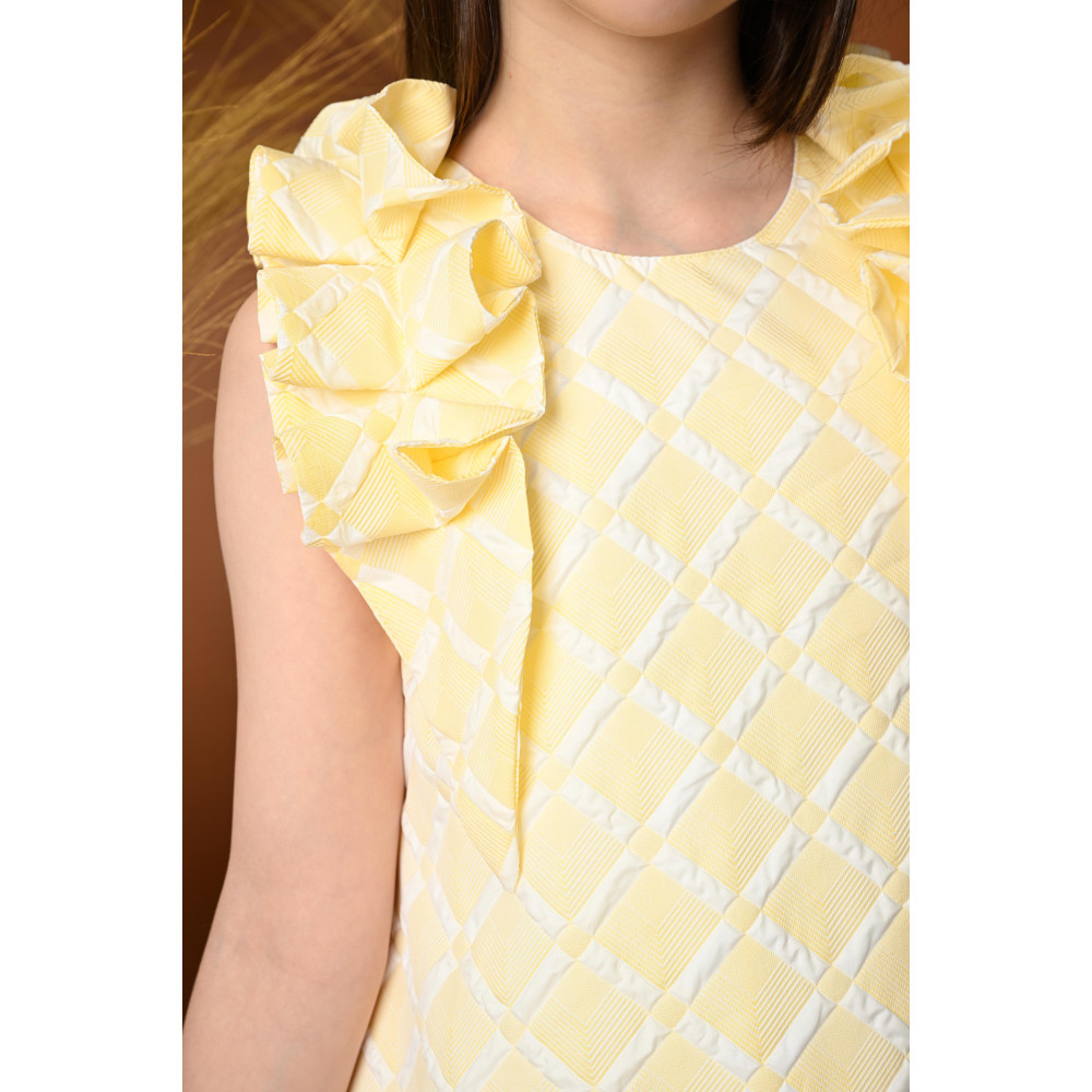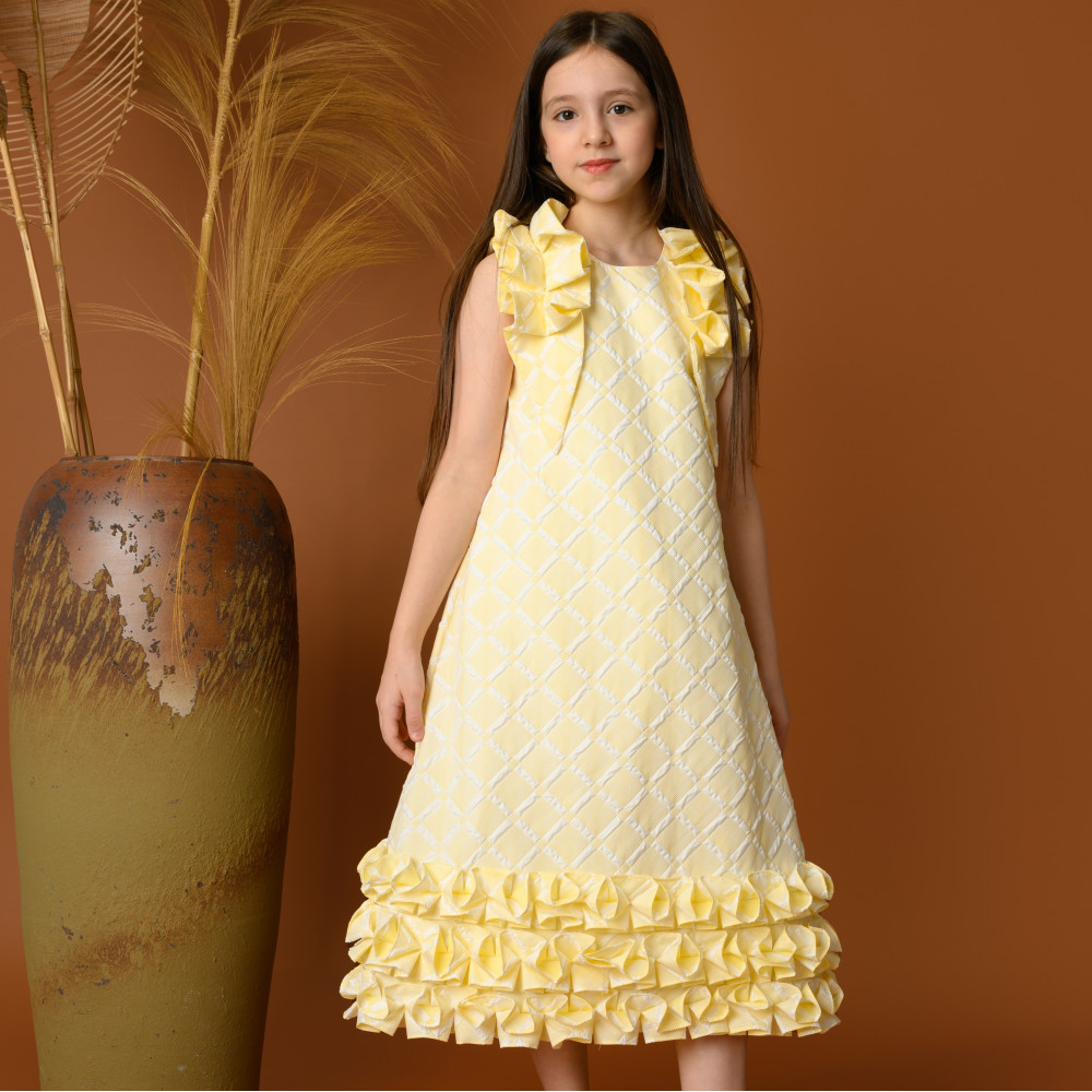 تألقي مع فستان بناتي أصفر أنيق من توتي كيدز Totikids! يتميز بتصميم عصري جذاب بقماش مزخرف بنقشات هندسية، مع تفاصيل بارزة عند الأكتاف تضيف لمسة فريدة من الأنوثة. الحافة السفلية مزينة بكشكشات متناسقة تمنح الفستان لمسة ساحرة ومثالية للمناسبات الخاصة. خاماته الناعمة والمريحة تجعل صغيرتك تتألق براحة وأناقة طوال اليوم.اختيار مثالي لإطلالة مشرقة ومميزة في كل مناسبة!