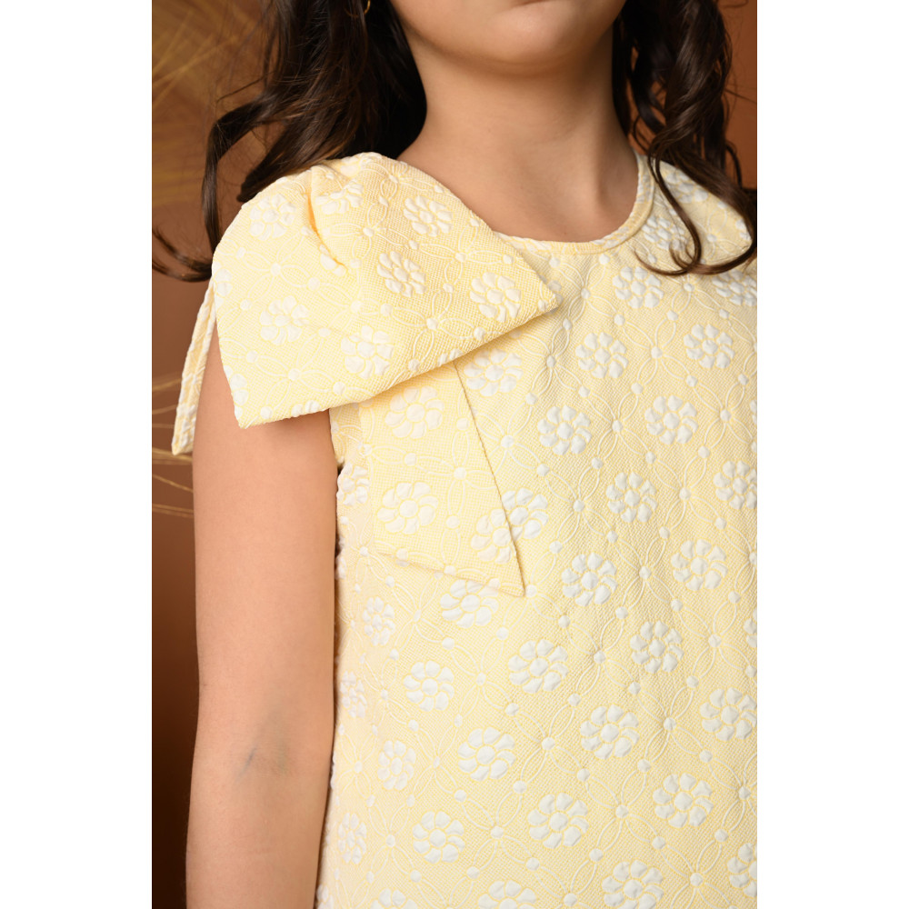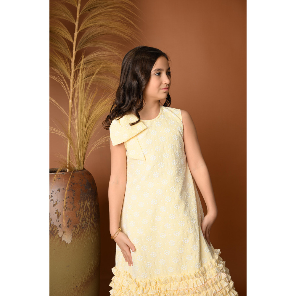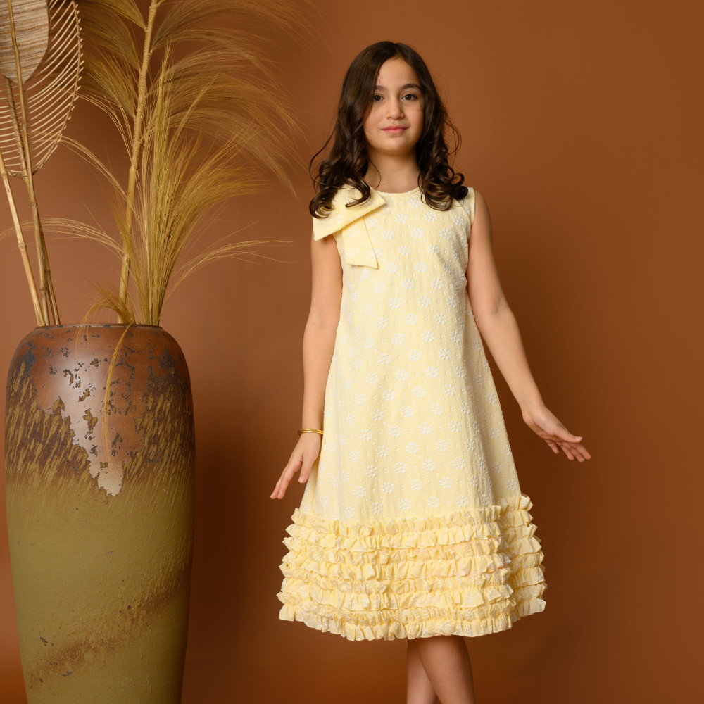 فستان بناتي من توتي كيدز يتميز بلونه الأصفر الناعم ونقشة الأزهار الدقيقة التي تضفي عليه لمسة من الحيوية والبهجة. يأتي التصميم بدون أكمام مع فيونكة جانبية أنيقة عند الكتف تضيف لمسة جذابة. الجزء السفلي من الفستان مزين بطبقات من الكشكش التي تعزز من جماله وتعطيه مظهراً ممتلئاً وحيوياً. مثالي للمناسبات الصيفية والحفلات بتصميمه العصري والمريح.