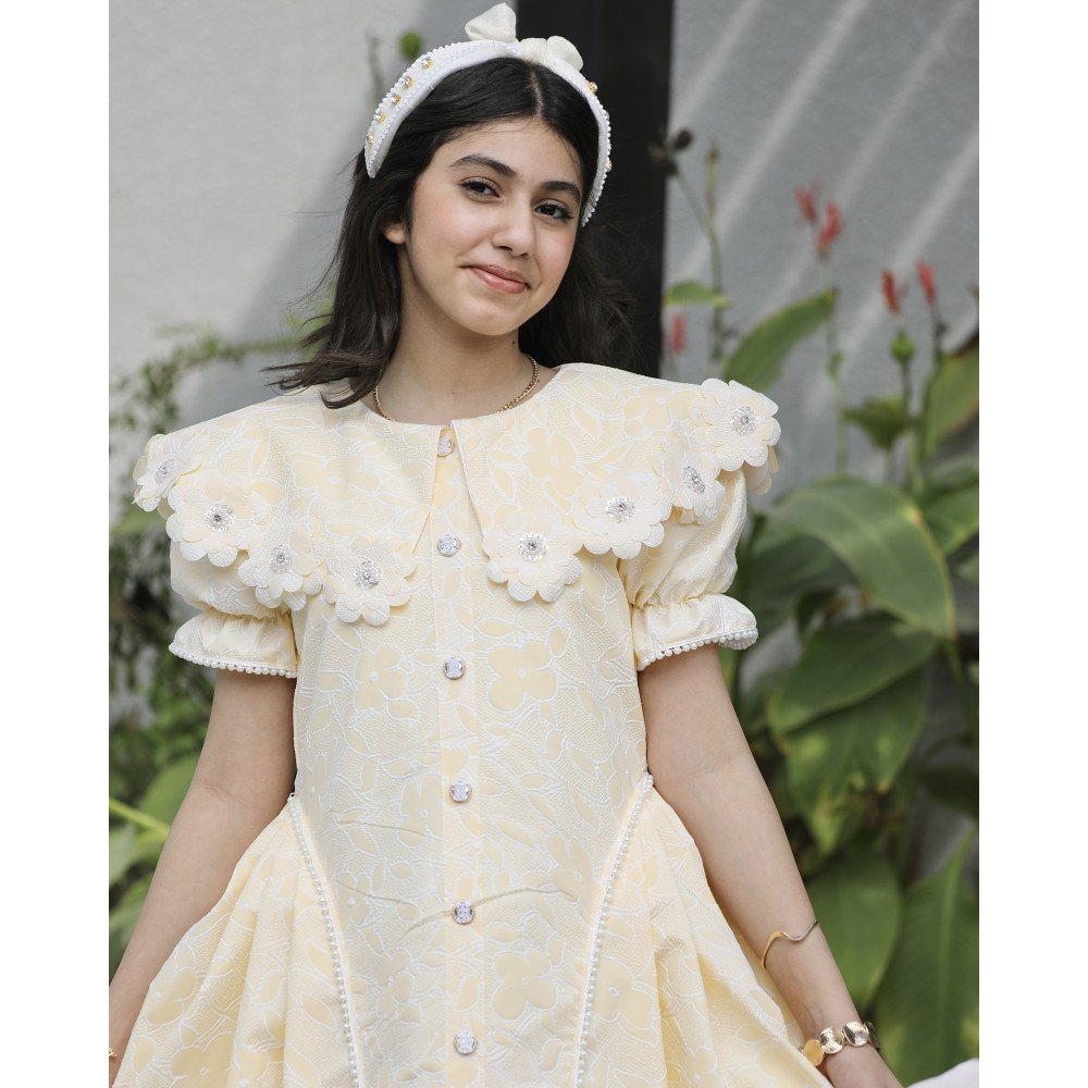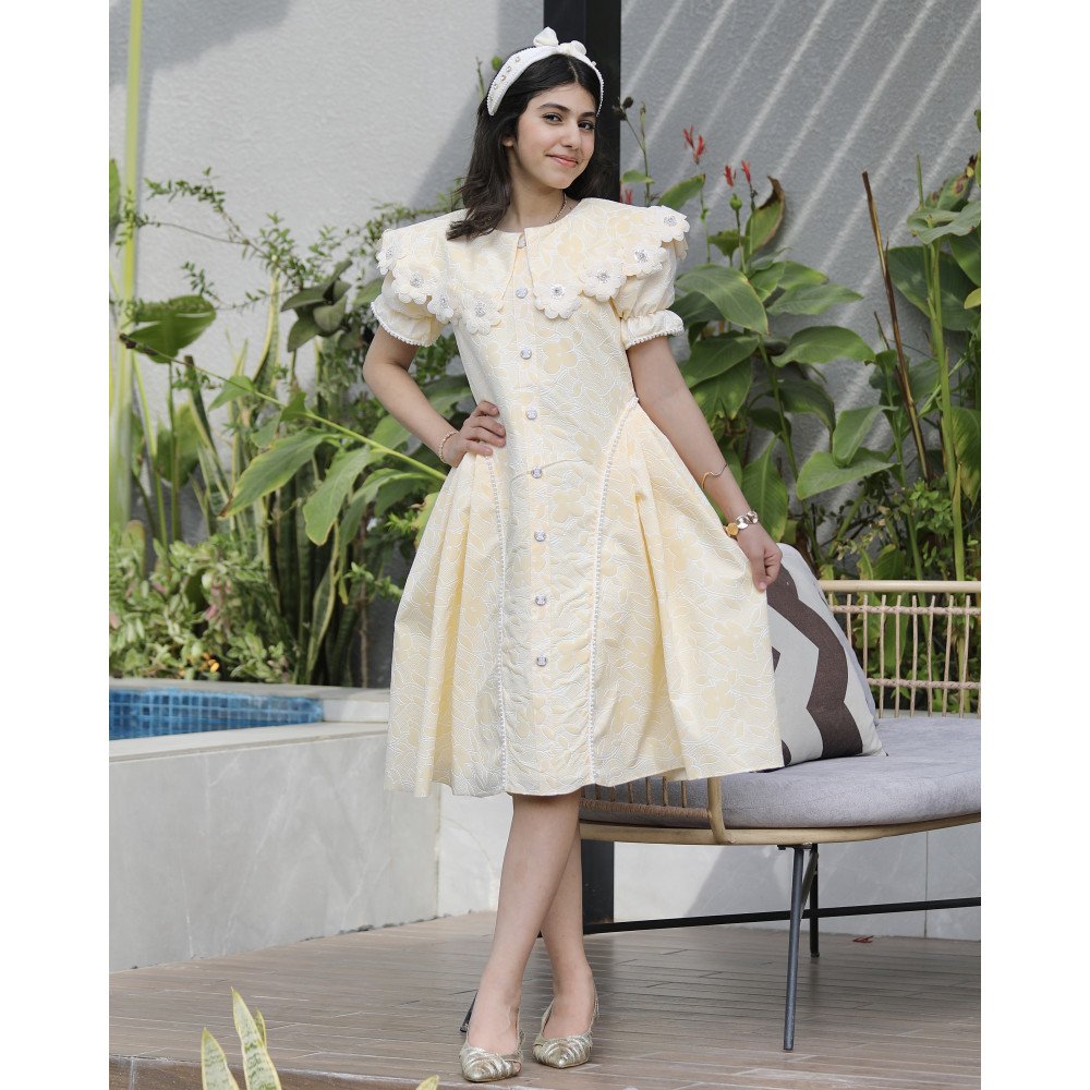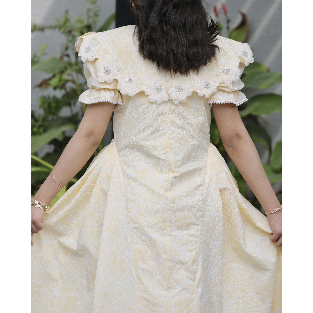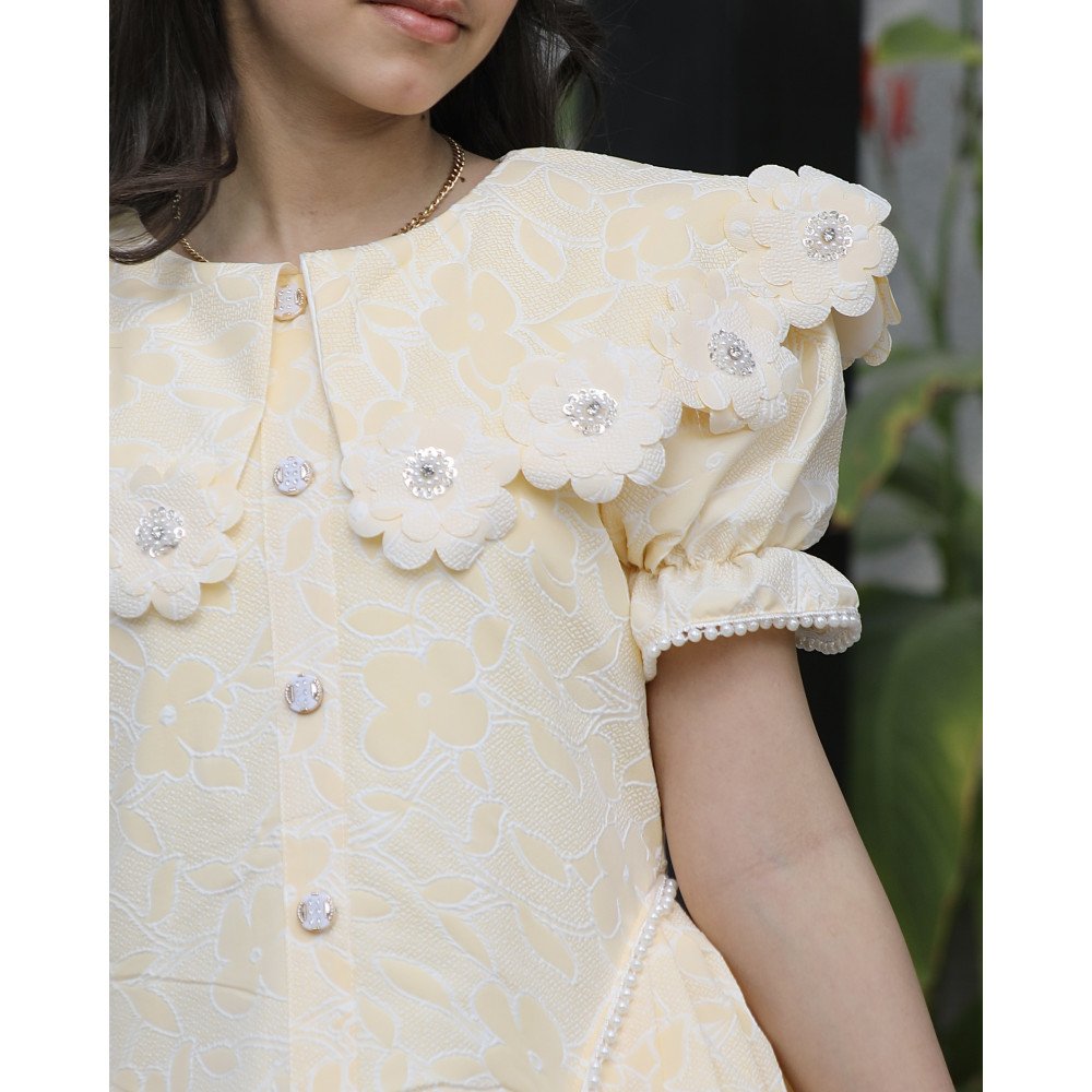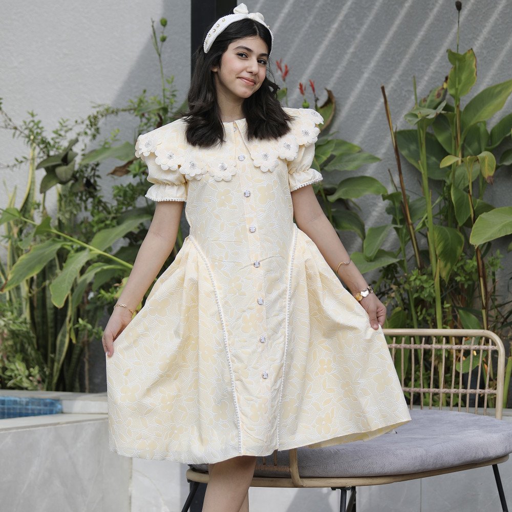 إشراقة الشمس.. حين يعانق البريق سحر الطبيعةهناك إطلالات تُصمم لتخطف الأنظار من الوهلة الأولى، وهذا الفستان الأصفر هو تجسيد حي لتلك الجاذبية. نقدم لكِ الموديل 1136، تحفة فنية تجمع بين حيوية اللون الأصفر المشرق ونعومة الطبعات المشجرة التي تروي حكاية حديقة غنّاء. صُمم هذا الفستان ليمنح أميرتك حضوراً طاغياً يفيض بالترف، حيث تزدان الياقة والأكمام ببريق الفصوص التي تلمع كالنجوم، بينما تضفي الأزرار الأمامية المرصعة لمسة أرستقراطية لا تُنسى. إنه ليس مجرد فستان، بل هو قطعة من الضوء صُممت لتجعل طفلتك تتألق كأميرة في يومٍ صيفي مشرق. لماذا هذا الفستان هو قطعة الاستثناء في خزانة أميرتك؟لأنه يجمع بين التصميم الكلاسيكي الغني وأدق التفاصيل الجمالية:نقشة مشجرة مبهجة: يتميز الفستان بقماش فاخر منقوش بزهور وأوراق شجر رقيقة تتناغم مع اللون الأصفر، مما يمنح طفلتك إشراقة طبيعية ومنعشة.رقبة "دلعة" مرصعة بالبريق: تأتي الرقبة بتصميم "دلعة" أنيق ومحدد بالكامل بـ الفصوص اللامعة التي تضفي بريقاً ساحراً حول الوجه وتغنيكِ عن إضافة إكسسوارات إضافية.تفاصيل الأكمام الفاخرة: تنتهي الأكمام بلمسة من الفصوص المتراصة، مما يعطي تناغماً مذهلاً مع الياقة ويبرز دقة الشغل اليدوي في القطعة.أزرار أمامية بلمسة ملكية: يمتد على كامل الفستان من الأمام صف من الأزرار الأنيقة، والمميز هو تحديد جوانب الأزرار بالفصوص اللامعة، مما يعطي انطباعاً بالفخامة والتميز في أدق التفاصيل.قصة واسعة ومريحة: يجمع التصميم بين المظهر الفخم والراحة المطلقة، مع تنورة منسدلة تتيح لأميرتك الحركة واللعب بكل ثقة وأناقة.جودة تليق بلحظات لا تُنسى نحن في "توتي كيدز" نؤمن أن التميز يبدأ من جودة التنفيذ. هذا الفستان مصنوع بحرفية عالية من أقمشة باردة وناعمة تسمح لبشرة طفلتك بالتنفس، مع تقنيات تثبيت متطورة للفصوص تضمن بقاءها ساطعة ومثبتة بإتقان حتى مع الاستخدام المتكرر، ليبقى الفستان ذكرى جميلة لأجمل الأوقات. امنحيها إطلالة تشرق بـسحر الأصفر والبريق!اجعلي من مناسبتها القادمة ذكرى لا تُمحى بقطعة تجمع بين الفن والفخامة.✨ اطلبيه الآن (موديل 1136) ودعي أميرتك الصغيرة تشرق ببريق لا يقاوم! ✨ شاركينا إطلالتها الساحرة!يسعدنا دائماً رؤية أميراتكم يتألقن بتصاميمنا التي تعكس ذوقكم الرفيع. ندعوكِ لمشاركة صورها وتقييمك للمنتج، فرأيك هو مصدر إلهامنا الدائم لنقدم الأفضل.خدماتنا: نقدم لكِ تجربة تسوق ممتعة مع شحن سريع وموثوق، وسياسة استبدال واسترجاع مرنة لضمان رضاكِ الكامل.