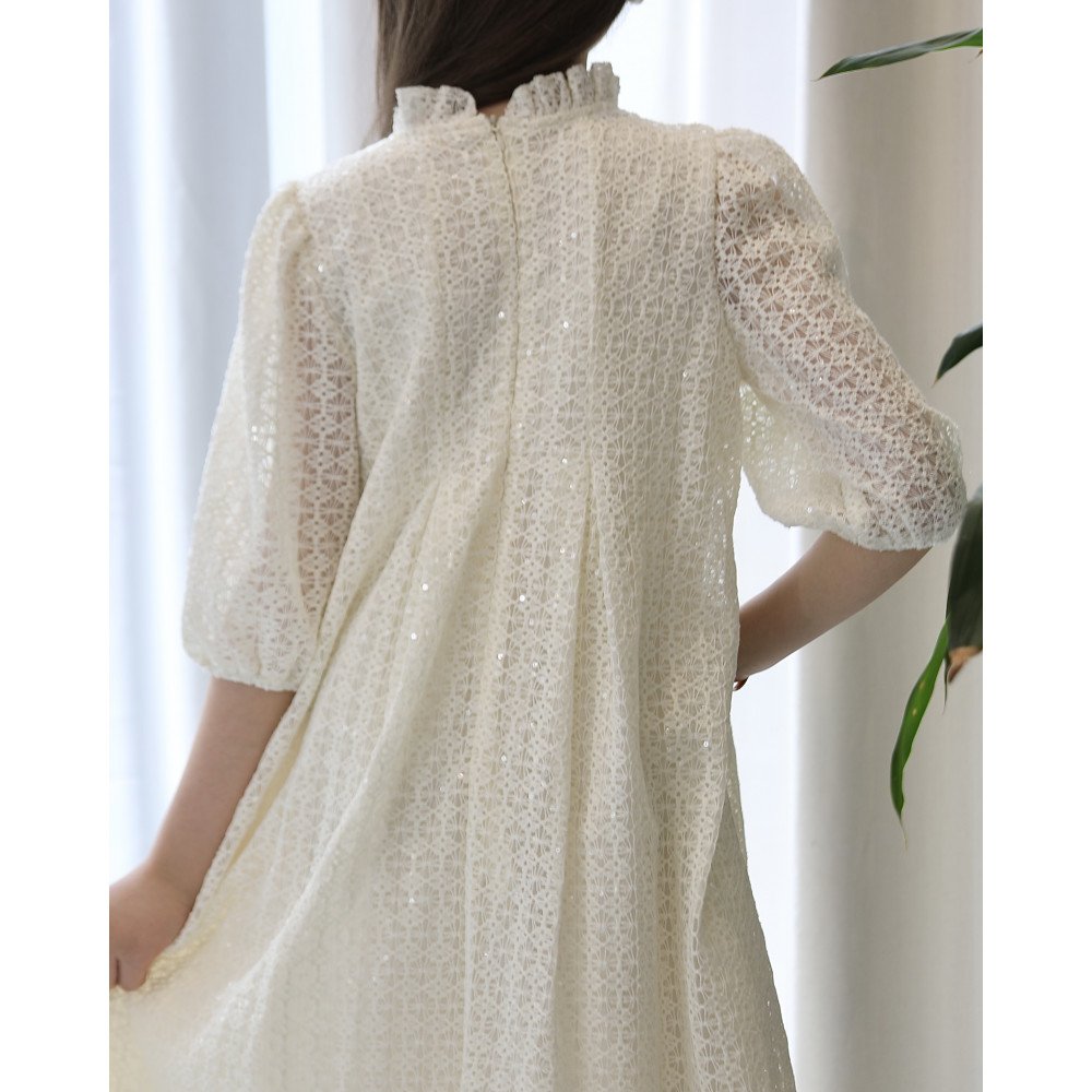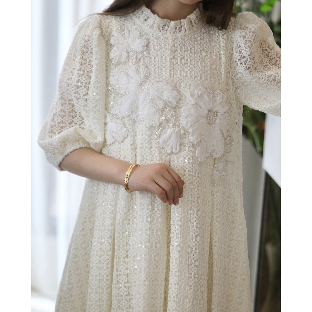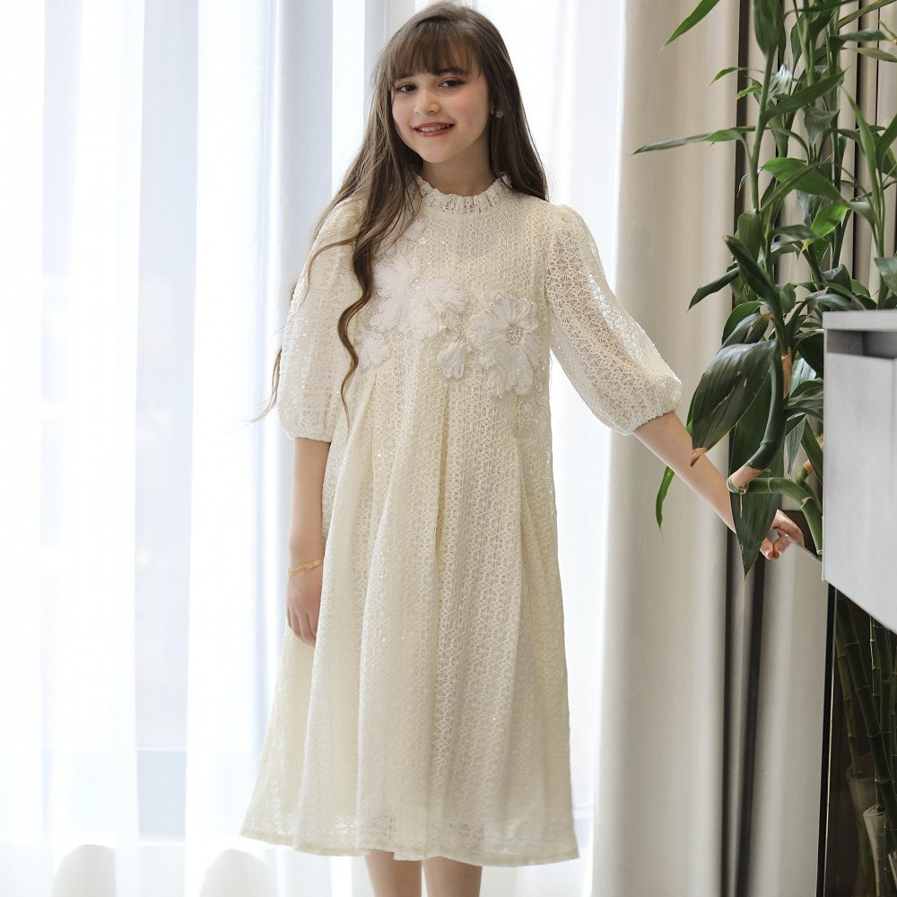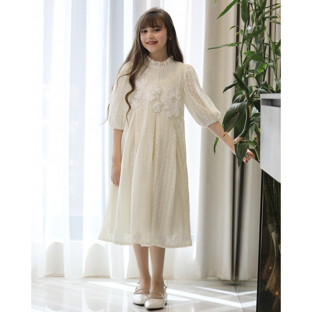 نقاء الأوف وايت.. حين يتعانق سحر الشبك مع رقة الزهورفي "توتي كيدز"، نؤمن أن البساطة هي قمة الفخامة، وهذا الفستان هو التجسيد الحي للجمال الملائكي. نقدم لكِ الموديل kj2106، تحفة فنية بلون الأوف وايت (السكري) الفاخر، صُممت لتجعل من أميرتك الصغيرة أيقونة للرقة والجمال. يبرز تميز هذا التصميم في قماشه الفريد المكون من "نقوش الشبك" المطرزة بلمعة خفيفة، والتي تتوج بزهور بارزة (3D) تفيض بالأنوثة، لتكتمل اللوحة بياقة الكشكشة وقصة الكلوش التي تمنحها حضوراً ملكياً في كل خطوة. لماذا هذا الفستان هو قطعة الاستثناء في خزانة أميرتك؟لأنه يجمع بين هندسة التصميم الدقيقة وأرقى أنواع الأقمشة:قماش شبكي مطرز (Mesh Embroidery): يتميز الفستان بنسيج شبكي فاخر مشغولة عليه نقوش فنية غنية، مما يضفي عمقاً بصرياً وفخامة تليق بأهم المناسبات.زهور بارزة (3D Floral): يزدان الصدر بزهور بيضاء كبيرة وبارزة، مرصعة بتفاصيل رقيقة تبرز دقة العمل اليدوي وتعطي انطباعاً بـ "الكوتور" الراقي.رقبة كشكشة ملكية: تأتي الياقة بتصميم كشكشة عالية وناعمة، تضفي لمسة أرستقراطية وتبرز جمال الوجه بأسلوب ملائكي رقيق يغنيكِ عن القلائد.تنورة كلوش بطبقات: يبدأ سحر القصة من الخصر، حيث ينسدل الفستان بتصميم "كلوش" واسع مع طبقات خفيفة تعطي حجماً ملكياً وحركة انسيابية مهيبة مع كل خطوة.أكمام شفافة ومرتبة: تأتي الأكمام بطول متوسط وتصميم مريح يبرز جمال نقوش الشبك المطرز، لتكتمل الأناقة المتكاملة.مثالي لجميع المناسبات الكبرى: هذا الفستان هو الخيار الأول للأعياد، حفلات الزفاف (لفتيات الزهور)، وجلسات التصوير الاستثنائية.جودة تليق بلحظات لا تُنسى نحن نضع الجودة في مقدمة أولوياتنا. هذا الفستان مصنوع بحرفية عالية جداً، مع بطانة داخلية ناعمة تضمن عدم ملامسة الشبك لبشرة طفلتك، وتقنيات تثبيت متطورة للزهور والنقوش لضمان بقائها محافظة على رونقها الملكي مهما تعددت مرات الارتداء.امنحيها إطلالة تشرق بـنقاء الأوف وايت وسحر الزهور! اجعلي من إطلالة أميرتك في المناسبة القادمة ذكرى لا تُمحى بقطعة تجمع بين الفن والترف.✨ اطلبيه الآن (موديل kj2106) ودعي أميرتك الصغيرة تتألق بجمالٍ لا يقاوم! ✨ شاركينا إطلالتها الساحرة!يسعدنا دائماً رؤية أميراتكم يتألقن بتصاميمنا التي تعكس ذوقكم الرفيع. ندعوكِ لمشاركة صورها وتقييمك للمنتج، فرأيك هو مصدر إلهامنا الدائم.خدماتنا: نقدم لكِ تجربة تسوق ممتعة مع شحن سريع وموثوق لجميع المناطق، وسياسة استبدال واسترجاع مرنة لضمان رضاكِ الكامل.