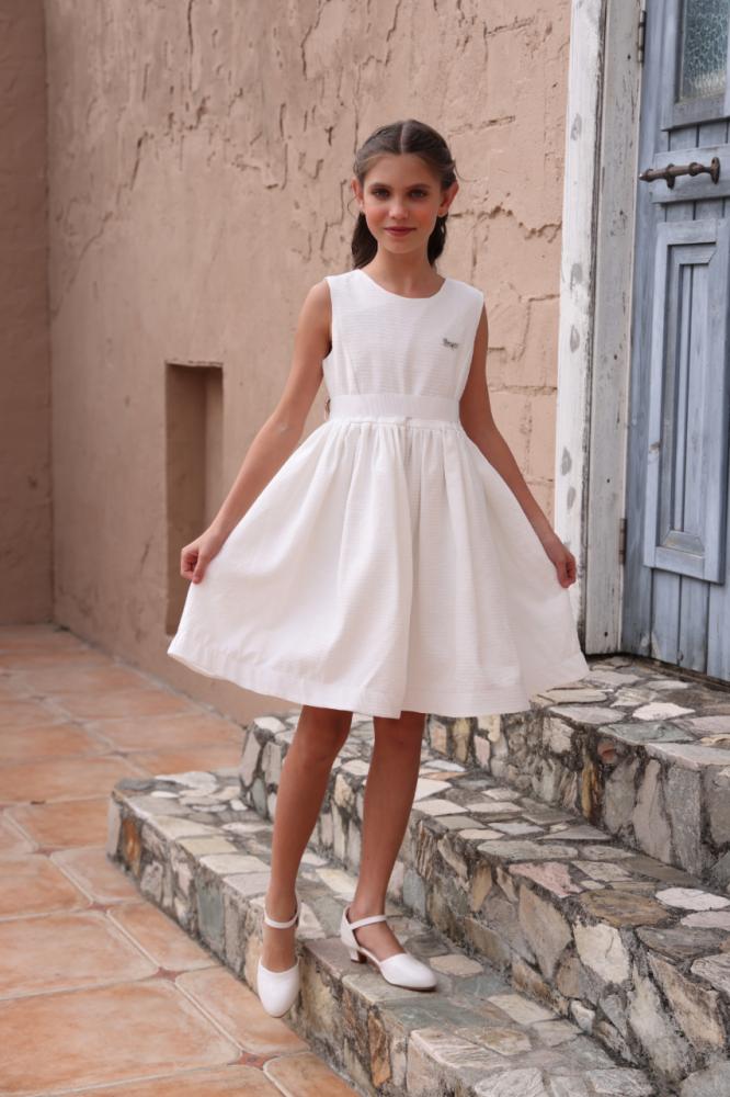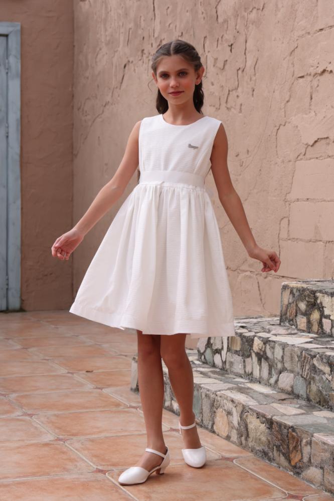 فستان بناتي كلاسيكي من تصميم العيسائي للأطفال، يناسب الفتيات من عمر 2 إلى 12 سنة. يتميز بتصميم بسيط وأنيق بالكامل باللون الأبيض الناصع. الفستان بلا أكمام مع قصة مستديرة عند العنق وربطة بيضاء أنيقة عند الخصر تضيف لمسة رقيقة. التنورة واسعة ومنسدلة بخفة، مما يجعل الفستان خيارًا مثاليًا للمناسبات الرسمية.