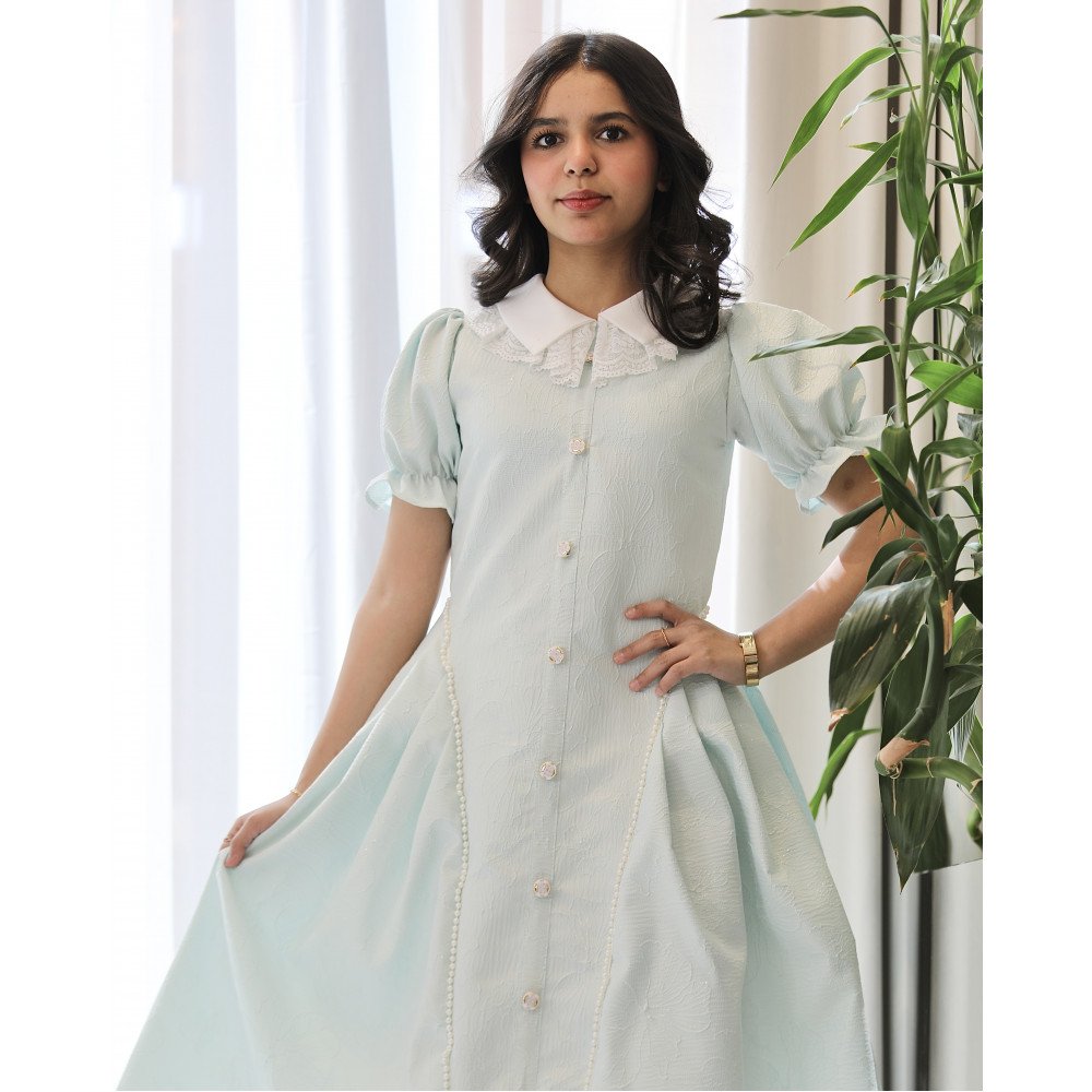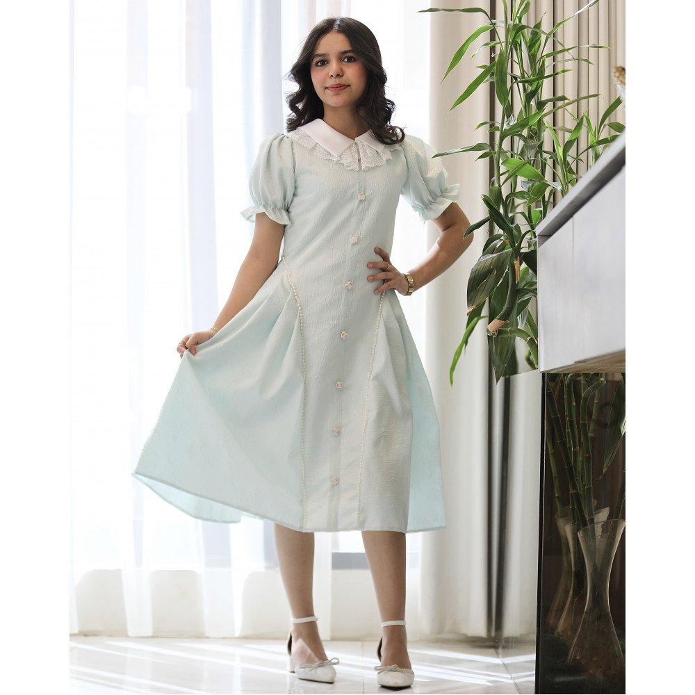 سماويٌ كالأحلام.. حين يعانق اللؤلؤ نقاء الكلفة الملكيةفي "توتي كيدز"، نؤمن أن الأناقة تكمن في التفاصيل التي تروي حكايات الرقي، وهذا الفستان هو القصيدة الأجمل لربيع دائم. نقدم لكِ الموديل 1223، تحفة فنية تجمع بين هدوء اللون السماوي الصافي وبريق اللؤلؤ الأبيض الذي ينثر سحره على التصميم. يبرز جمال هذا الفستان في ياقته "الدلعة" الانسيابية التي تم تصميمها بحرفية لتبرز جمال العنق، محلاة بـ "كلفة" فاخرة تضفي لمسة أرستقراطية لا تُنسى. إنه ليس مجرد فستان، بل هو إعلان عن حضور ملكي يفيض بالبراءة والتميز في كل محفل. لماذا هذا الفستان هو قطعة الاستثناء في خزانة أميرتك؟لأنه يجمع بين التصميم الانسيابي الفاخر وأدق التفاصيل الجمالية اليدوية:لون سماوي ملائكي: تم اختيار درجة السماوي (Sky Blue) بعناية لتناسب جميع ألوان البشرة وتمنح طفلتك إشراقة فورية وهدوءاً يعكس نقاء الطفولة.تطريز اللؤلؤ المتكامل: يتميز الفستان بتوزيع فني لـ حبات اللؤلؤ الأبيض التي تضفي بريقاً يشبه المجوهرات، مما يمنح الإطلالة فخامة يدوية (Handmade feel) مذهلة.رقبة "دلعة" بالكلفة الراقية: تأتي الياقة بتصميم انسيابي يبرز جمال العنق، ومحددة بـ كلفة (دانتيل) متقنة تزيد من رقي التصميم وتغنيكِ تماماً عن إضافة أي إكسسوارات.أزرار أمامية فاخرة: يزدان منتصف الفستان بصف من الأزرار الفاخرة المنسقة بإتقان، مما يعزز الطابع الكلاسيكي المرتب ويمنح الفستان لمسة من الهيبة الملكية.قصة انسيابية مريحة: يجمع التصميم بين المظهر الرسمي والراحة المطلقة، مما يتيح لأميرتك الحركة واللعب بكل خفة مع الحفاظ على مظهرها المنفوش والراقي طوال وقت الاحتفال.جودة تليق بلحظات لا تُنسى نحن في "توتي كيدز" نضع الجودة في مقدمة أولوياتنا. هذا الفستان مصنوع بحرفية عالية جداً، من أقمشة باردة وناعمة تسمح لبشرة طفلتك بالتنفس، مع تقنيات تثبيت متطورة للؤلؤ وخياطة متقنة تضمن بقاء الكلفة والأزرار محافظة على شكلها الفخم ورونقها مهما تعددت مرات الارتداء.امنحيها إطلالة تشرق بـسحر السماوي وبريق اللؤلؤ! اجعلي من إطلالة أميرتك في المناسبة القادمة ذكرى لا تُمحى بقطعة تجمع بين الفن والترف.✨ اطلبيه الآن (موديل 1223) ودعي أميرتك الصغيرة تشرق بجمال لا يقاوم! ✨ شاركينا إطلالتها الساحرة!يسعدنا دائماً رؤية أميراتكم يتألقن بتصاميمنا التي تعكس ذوقكم الرفيع. ندعوكِ لمشاركة صورها وتقييمك للمنتج، فرأيك هو مصدر إلهامنا الدائم لنقدم الأفضل دائماً.خدماتنا: نقدم لكِ تجربة تسوق ممتعة مع شحن سريع وموثوق، وسياسة استبدال واسترجاع مرنة لضمان رضاكِ الكامل.