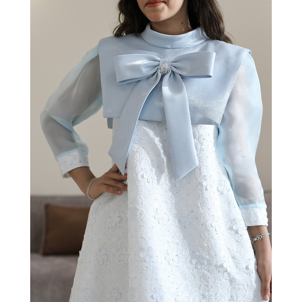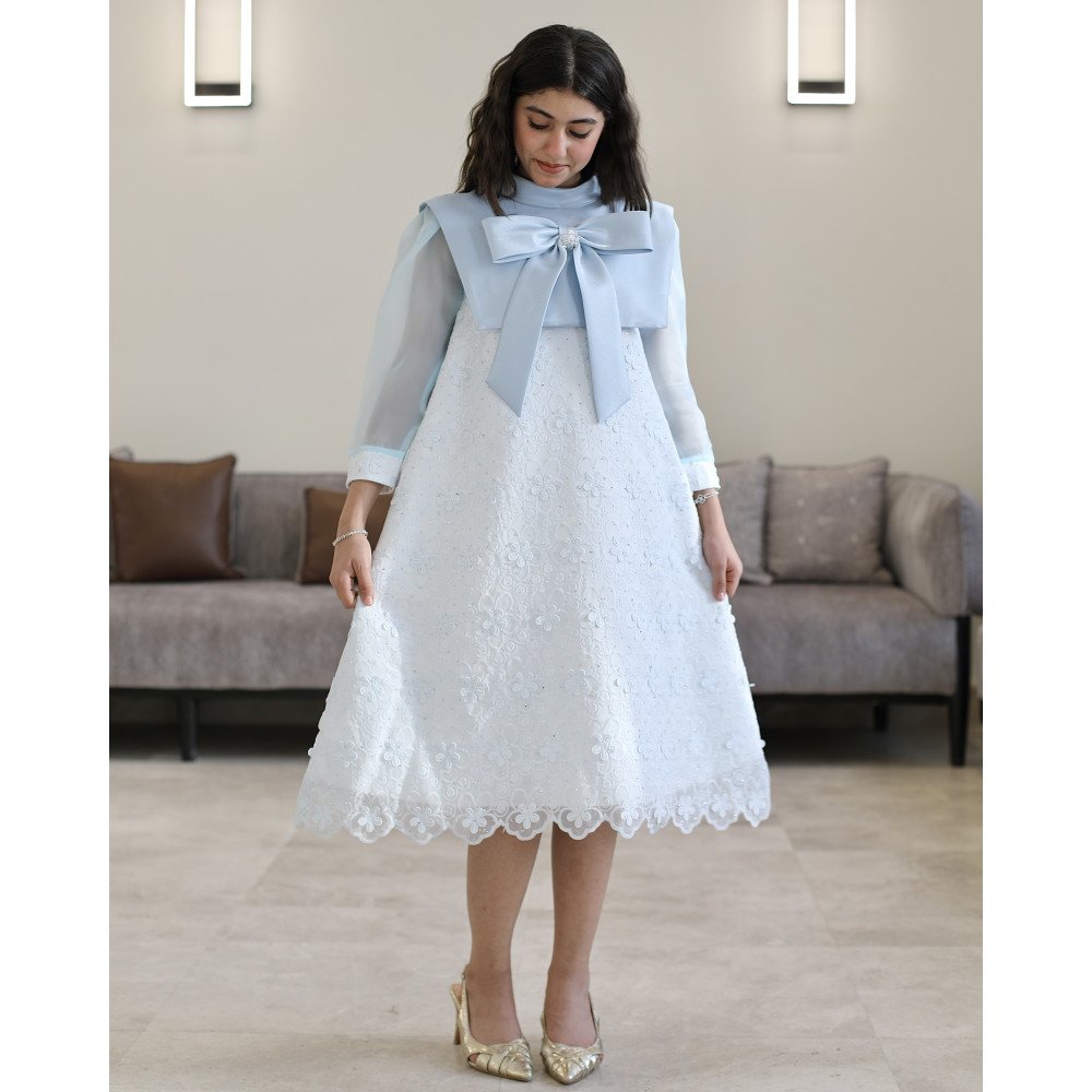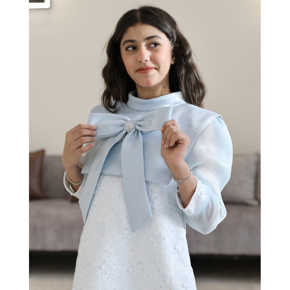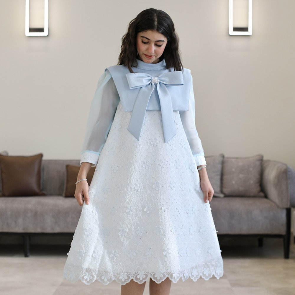 سحر السماوي.. حين تلتقي فخامة التطريز بجرأة الفيونكة الملكيةفي "توتي كيدز"، نعيد صياغة مفهوم الأناقة من خلال تفاصيل تسبق الموضة، وهذا الفستان هو التجسيد الحي للفخامة "المودرن". نقدم لكِ الموديل 1199، تحفة فنية بلون السماء الصافية، مغطاة بالكامل بتطريزات مشجرة (Floral Embossed) تمنح القماش عمقاً بصرياً مذهلاً. يبرز تميز هذا التصميم في الفيونكة الملكية الضخمة التي تتصدر منطقة الرقبة، لتعطي انطباعاً أرستقراطياً يخطف الأنظار في كل محفل. إنه ليس مجرد فستان، بل هو قطعة "كوتور" صُممت لتجعل من أميرتك الصغيرة أيقونة للجمال والرقي. لماذا هذا الفستان هو قطعة الاستثناء في خزانة أميرتك؟لأنه يجمع بين هندسة القماش المبتكرة وأحدث صيحات التصميم العالمية:نسيج مشجر مطرز (Textured Floral Embroidery): يتميز الفستان بقماش فاخر بنقوش زهور نافرة ومطرزة بدقة متناهية، مما يضفي ملمساً غنياً وفخامة بصرية لا تضاهى تحت الأضواء.فيونكة الرقبة الأيقونية: يزدان العنق بفيونكة ضخمة ومنسدلة بأسلوب فني، يتوسطها إكسسوار مرصع يضيف لمسة من البريق ويغنيكِ تماماً عن إضافة أي مجوهرات حول العنق.أكمام شفافة حالمة: تأتي الأكمام بتصميم من القماش الشفاف (أورجانزا أو تل راقٍ)، مما يمنح الفستان طابعاً أنثوياً رقيقاً ويوازن بين فخامة التطريز ونعومة التصميم.قصة "نص كلوش" انسيابية: ينسدل الفستان بقصة نص كلوش مفتوحة، تمنح الفستان حجماً جمالياً وحركة ملكية متزنة تتيح لأميرتك الحركة واللعب بكل خفة وأناقة.حواف "ليزر كت" فنية: ينتهي ذيل الفستان بحواف دائرية مطرزة بعناية (Scalloped edge)، مما يبرز دقة العمل اليدوي والاهتمام بالتفاصيل النهائية.مثالي للمناسبات الكبرى: هذا الفستان هو الخيار الأول للأعياد، حفلات الزفاف، وجلسات التصوير الاستثنائية التي تتطلب إطلالة تبقى محفورة في الذاكرة.جودة تليق بلحظات لا تُنسى نحن نضع الجودة في مقدمة أولوياتنا. هذا الفستان مصنوع بحرفية عالية جداً، مع بطانة داخلية ناعمة تضمن راحة بشرة طفلتك، وتقنيات تثبيت متطورة للتطريز والفيونكة لضمان بقائها محافظة على رونقها وشكلها الفخم مهما تعددت مرات الارتداء.امنحيها إطلالة تشرق بـسحر السماوي والتميز! اجعلي من إطلالة أميرتك في المناسبة القادمة مهرجاناً للأناقة والجمال بقطعة تجمع بين الفن والترف.✨ اطلبيه الآن (موديل 1199) ودعي أميرتك الصغيرة تتألق بجمالٍ لا يقاوم! ✨ شاركينا إطلالتها الساحرة!يسعدنا دائماً رؤية أميراتكم يتألقن بتصاميمنا التي تعكس ذوقكم الرفيع. ندعوكِ لمشاركة صورها وتقييمك للمنتج، فرأيك هو مصدر إلهامنا الدائم لنقدم الأفضل دائماً.خدماتنا: نقدم لكِ تجربة تسوق ممتعة مع شحن سريع وموثوق لجميع المناطق، وسياسة استبدال واسترجاع مرنة لضمان رضاكِ الكامل.