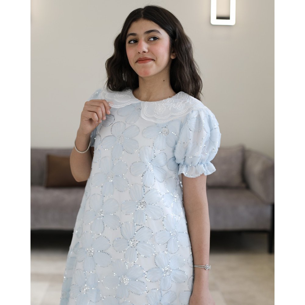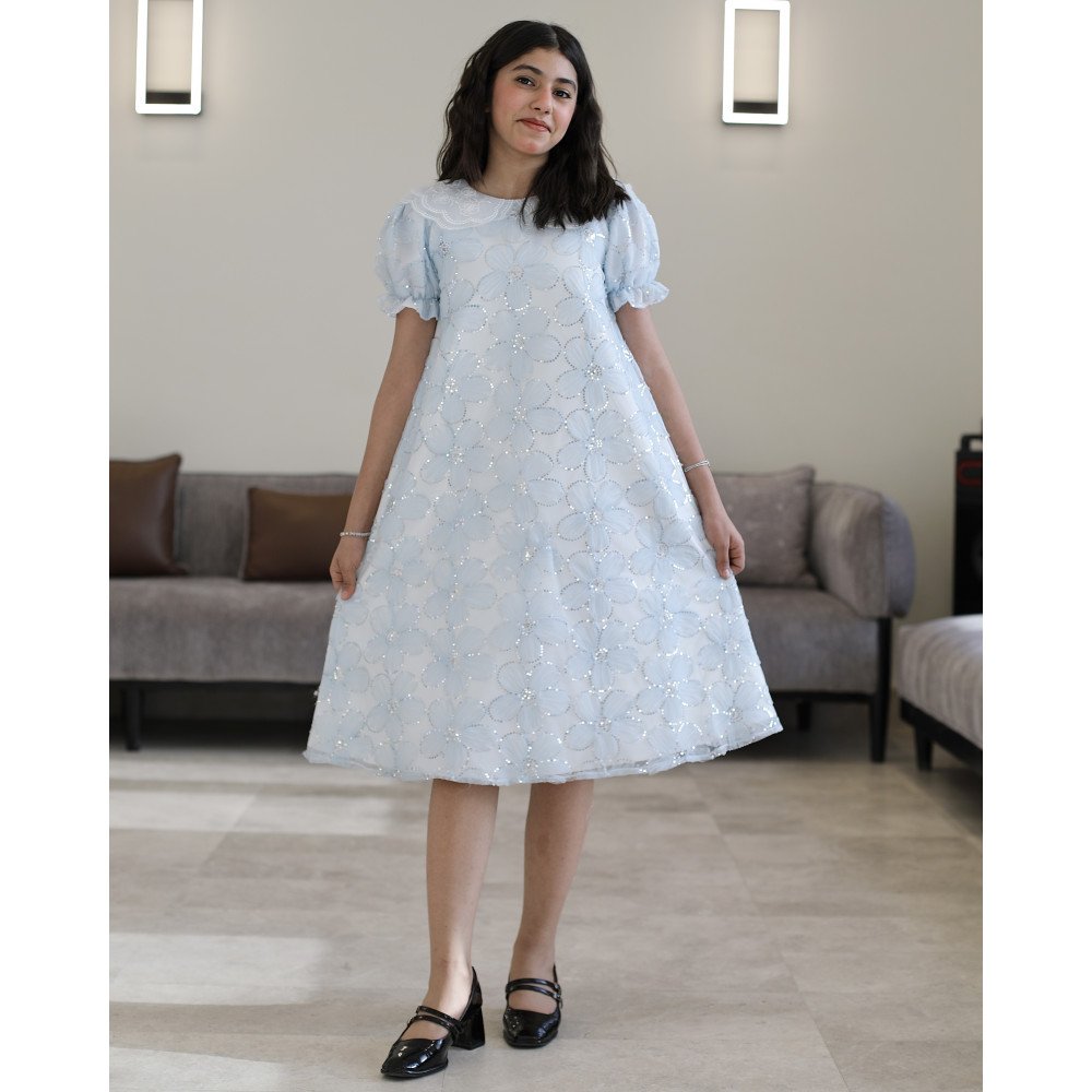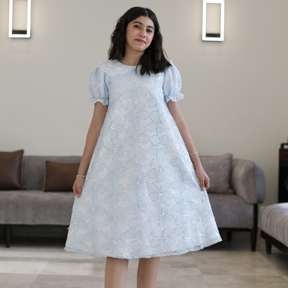 فستان بناتي سماوي مطرز ورود ببريق لامع وقصة نص كلوش - 1225