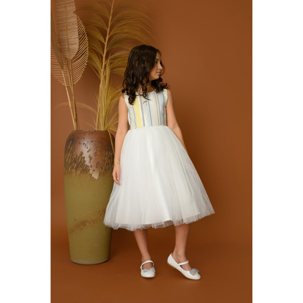 فستان سهرة أنيق من توتي كيدز مصمم بأسلوب كلاسيكي يجمع بين البساطة والرقي. يتميز بقصة بدون أكمام وصدرية مخططة بألوان الباستيل الهادئة من الأصفر والأزرق، مما يضفي لمسة من النعومة والانتعاش. القماش الراقي والمظهر العمودي يعززان من الأناقة العامة للفستان، مع جاكيت متناسق لإطلالة متكاملة تناسب المناسبات الرسمية والحفلات