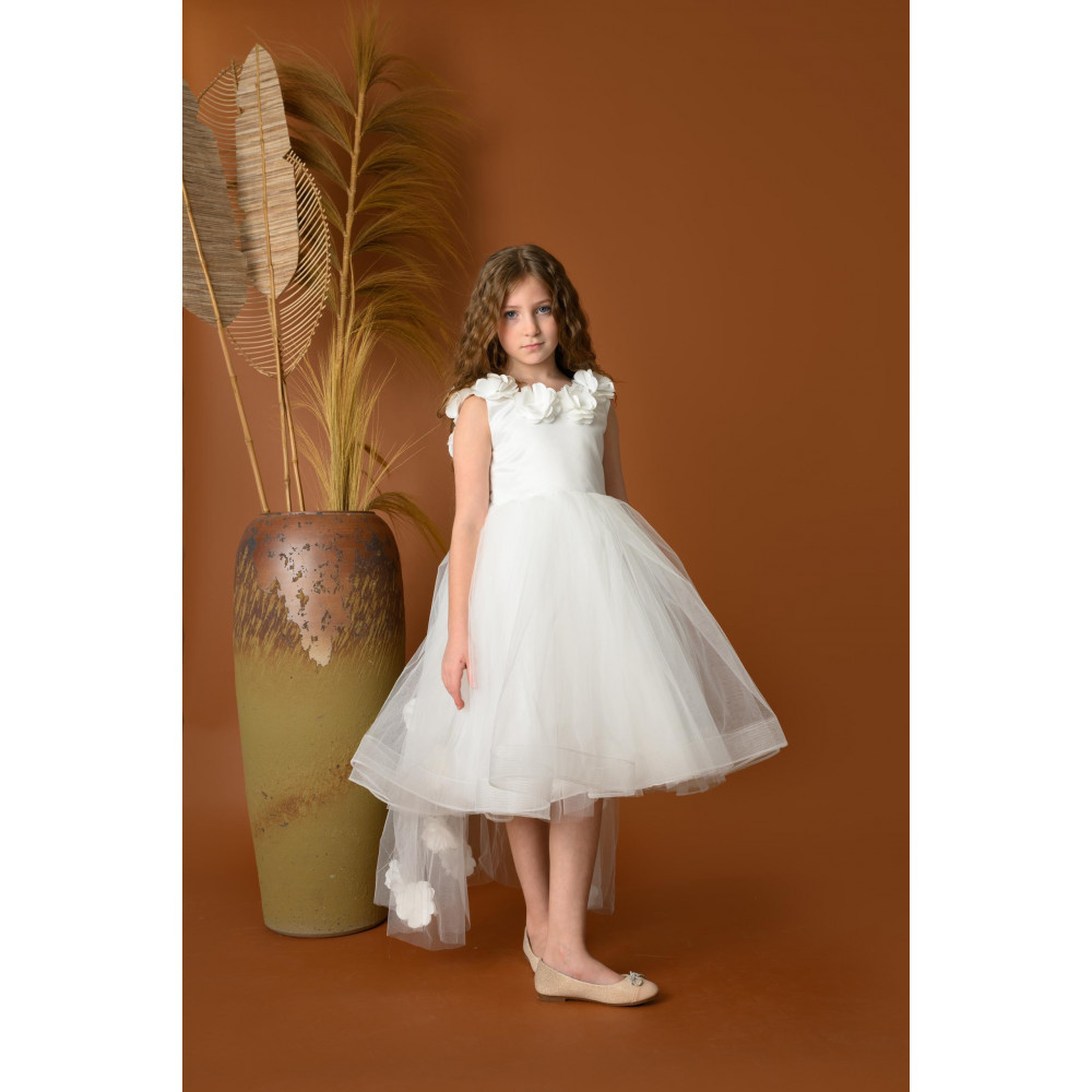 أضيفي لمسة من الجمال والرقي لإطلالة طفلتك مع هذا الفستان الأبيض الفاخر من ماركة ميدي كيدز Midikids. يتميز الفستان بتصميم منفوش مفعم بالأنوثة مع تفاصيل زهرية رائعة على الكتف والصدر، بالإضافة إلى ذيل من التول الشفاف المزخرف بالزهور لإضفاء مظهر مميز. مثالي للمناسبات الخاصة مثل حفلات الزفاف وأعياد الميل..