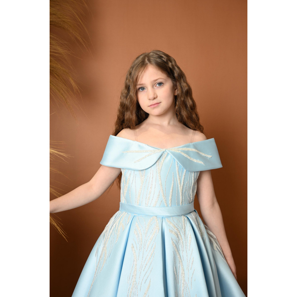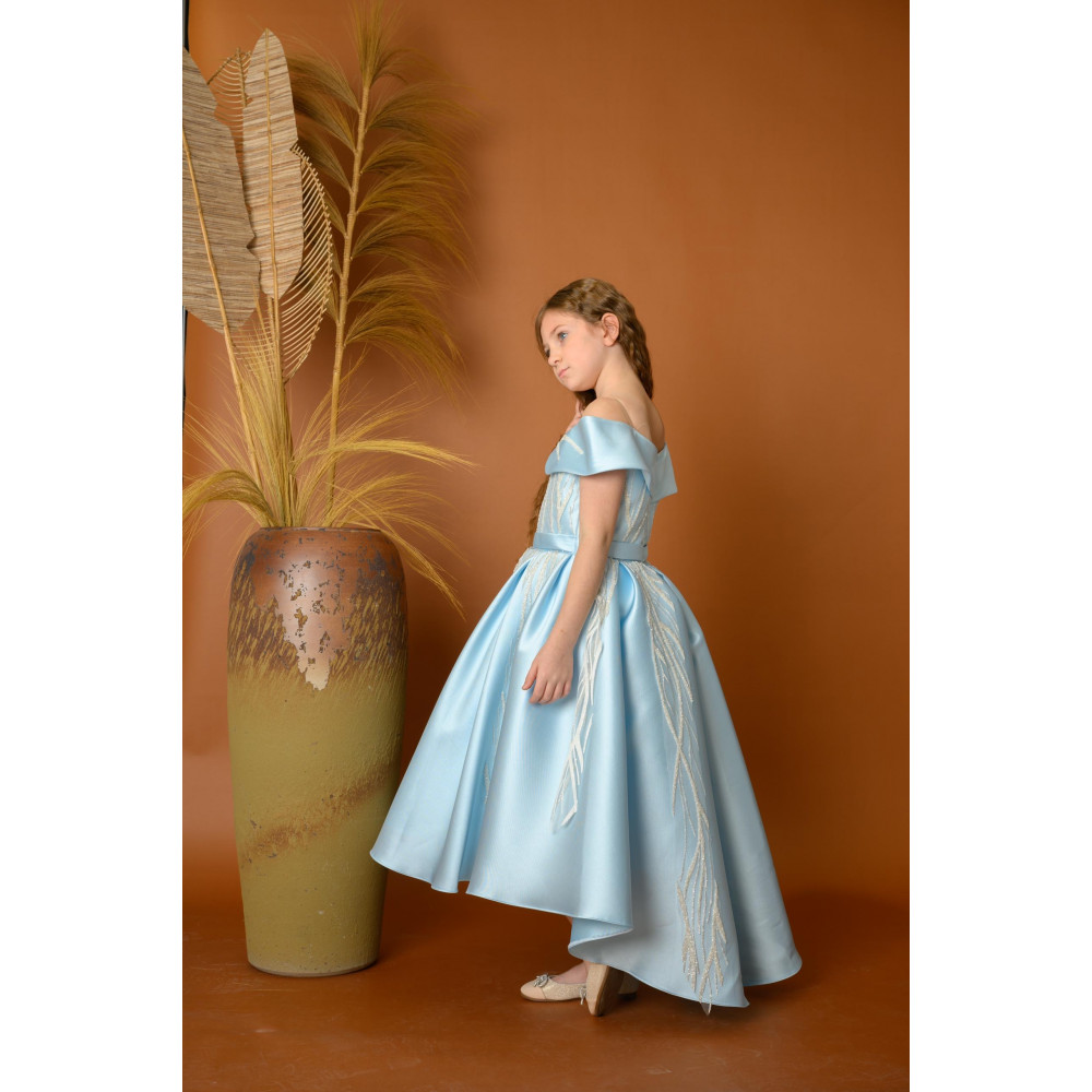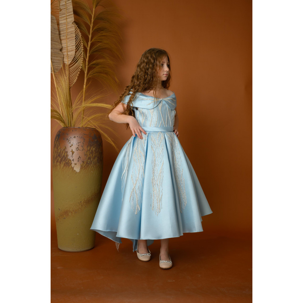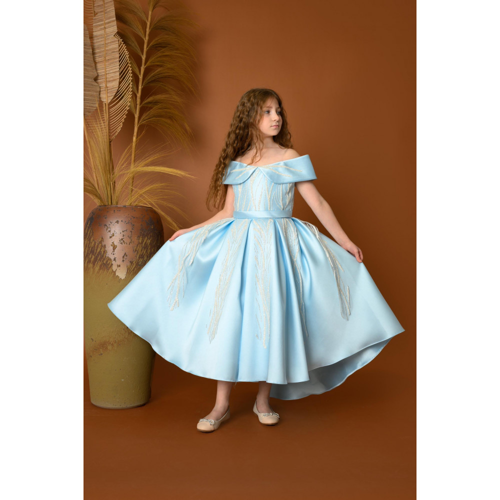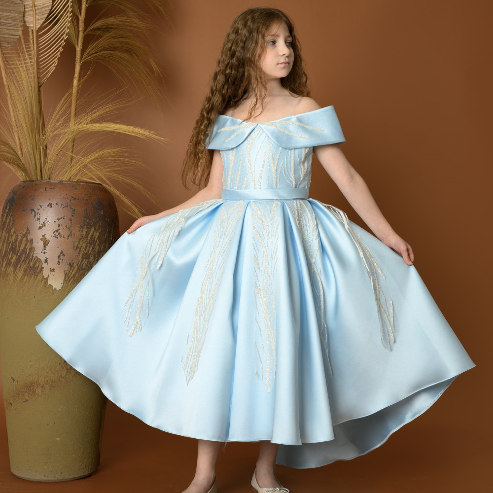 اجعلي طفلتك تتألق بإطلالة ملكية مع هذا الفستان الفاخر من ماركة ميدي كيدز Midikids. يتميز بتصميمه الرائع بأكتاف مكشوفة تضيف لمسة أنثوية راقية، مع تطريزات ناعمة تمتد على القماش الأزرق السماوي لتعزز من فخامته. القصة الواسعة والذيل الخلفي غير المتساوي يمنحان الفستان مظهراً ساحراً ومميزاً، مما يجعله مثالياً للمناسبات الفاخرة مثل حفلات الزفاف والحفلات الرسمية. مصنوع من أجود الخامات لضمان الراحة والأناقة لطفلتك. اختاري علامة ميدي كيدز Midikids لإطلالة لا تُنسى