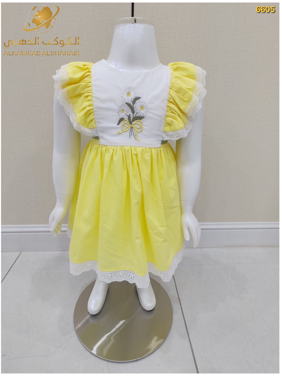 أضيفي لمظهر طفلتك لمسة من البهجة والنعومة مع هذا الفستان البناتي الرائع موديل 6605. يتميز الفستان بتصميم صيفي أنيق يجمع بين اللون الأصفر الحيوي والقماش الأبيض المطرّز على منطقة الصدر بنقشة زهور جميلة مع ربطة صغيرة أنثوية. يأتي الفستان بكشكش على الأكتاف يضفي لمسة جذابة، بينما تمنح الحافة السفلية المزينة بالدانتيل الأبيض مظهراً راقياً يليق بالمناسبات والخروجات. القماش خفيف ومريح، مما يجعل الفستان مناسباً للّبس اليومي، المشاوير العائلية، المناسبات الهادئة، وحتى جلسات التصوير. مميزات المنتج: تصميم صيفي بلون أصفر مبهج تطريز زهور جميل على منطقة الصدر كشكش أنيق على الأكتاف دنتيل أبيض على الأطراف لإطلالة راقية خامة مريحة وخفيفة مناسبة للجو الحار مثالي للبس اليومي والمناسبات البسيطة