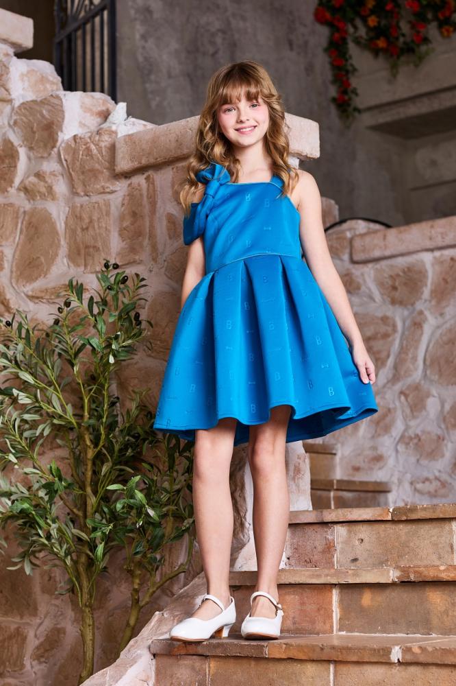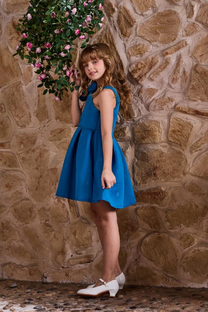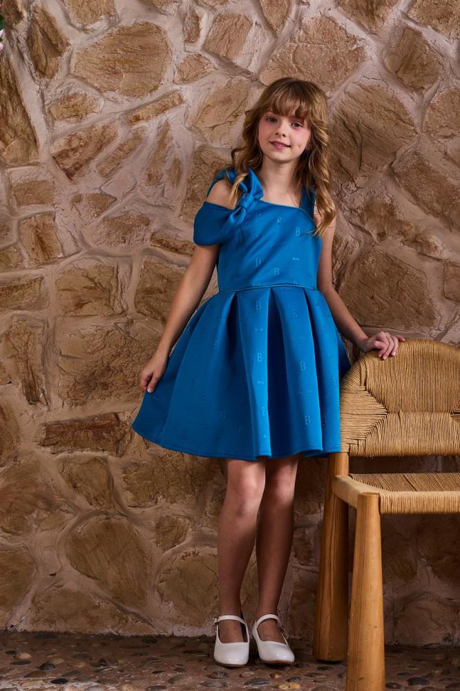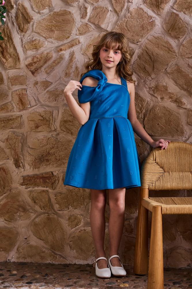فستان بناتي أزرق بتصميم فيونكة جانبية - من عمر 2 إلى 12 سنة
