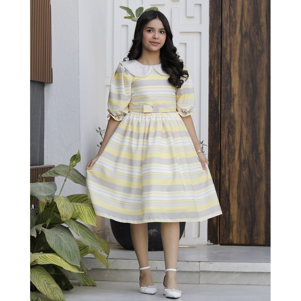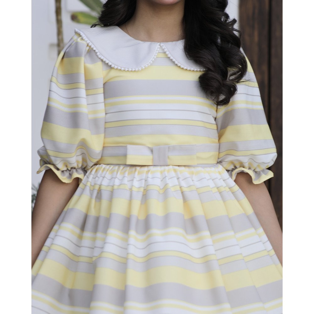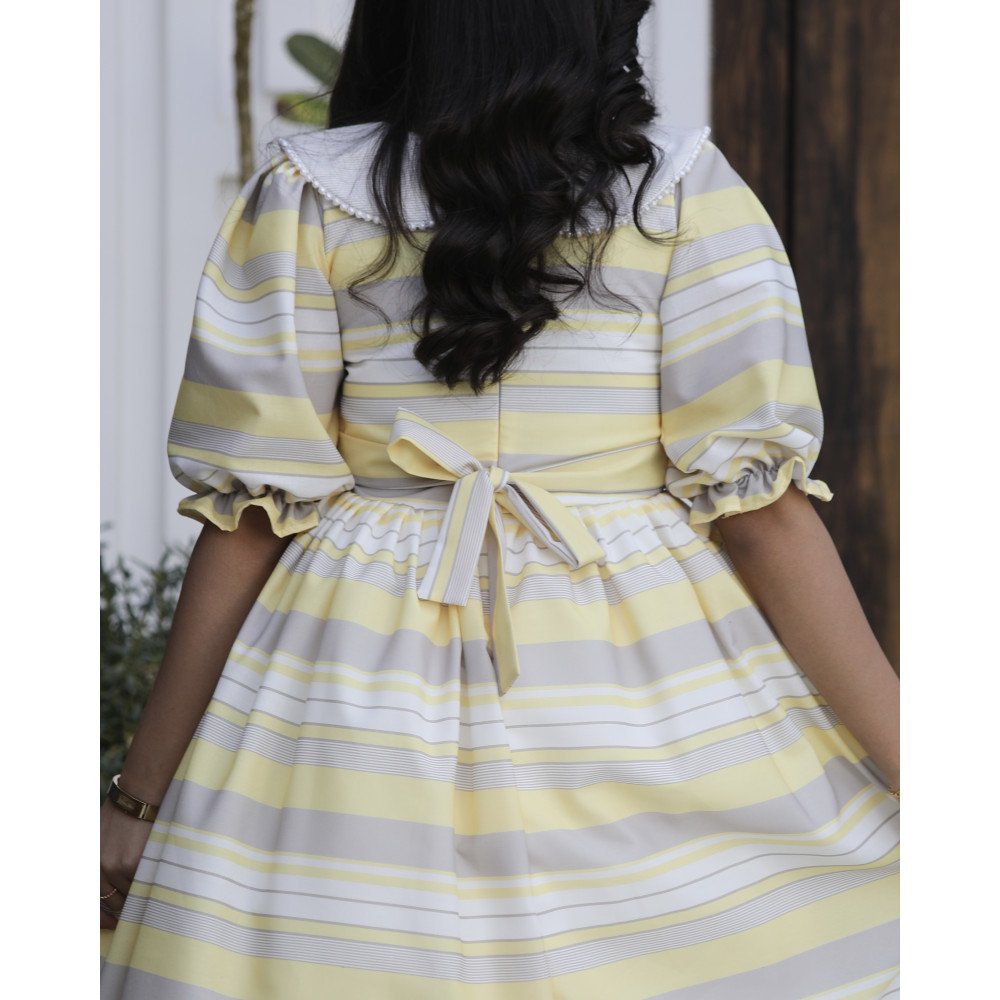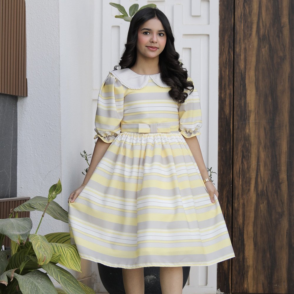 تناغم الألوان.. حين تلتقي حيوية الأصفر بهدوء الرماديفي عالم الأناقة، التميز يكمن في اختيار الألوان غير التقليدية، وهذا الفستان هو المزيج المثالي بين الطاقة والهدوء. نقدم لكِ الموديل 1149، قطعة فنية تجمع بين إشراقة اللون الأصفر وصفاء اللون الرمادي في خطوط عرضية هندسية تمنح أميرتك حضوراً ملفتاً. صُمم هذا الفستان ليمنح طفلتك إطلالة عصرية "مودرن"، حيث تتوج الياقة ببريق اللؤلؤ الصافي، وتزدان منطقة الخصر بلمسة إبداعية تحاكي أناقة "الكرفتة" بأسلوب طفولي ساحر. إنه ليس مجرد فستان، بل هو قطعة من الضوء صُممت لتجعل من كل مناسبة احتفالاً بالجمال. لماذا هذا الفستان هو قطعة التميز في خزانة أميرتك؟لأنه يجمع بين التصميم العصري الجريء وأدق التفاصيل الجمالية:خطوط هندسية متناسقة: يتميز الفستان بنقشة الخطوط المتوازنة بالأصفر والرمادي واللحمي، مما يعطي أبعاداً جمالية رائعة ويناسب مختلف ألوان البشرة، ويمنح طفلتك إطلالة ربيعية منعشة.ياقة ملكية باللؤلؤ: تبرز الياقة الدائرية "بيتر بان" باللون الأبيض، والمحددة بالكامل بـ صف من اللؤلؤ الأبيض اللامع، مما يضفي لمسة أرستقراطية تغني عن ارتداء المجوهرات.خصر بلمسة "الكرفتة" المبتكرة: يتميز منتصف الخصر بقطعة مثبتة بتصميم أنيق يشبه "الكرفتة" أو الفيونكة الصغيرة المستطيلة، مما يمنح الفستان طابعاً رسمياً وراقياً يكسر نمط التصاميم التقليدية.حزام خلفي لأناقة متكاملة: يكتمل السحر من الخلف بـ حزام أنيق يتيح لكِ ضبط المقاس بدقة، ويمنح الفستان فيونكة خلفية ساحرة تكتمل بها الإطلالة من كل الزوايا.أكمام منفوشة عصرية: تأتي الأكمام بتصميم "الباف" (Puff Sleeves) المريح الذي يضفي حجماً ملكياً عند الكتفين ويزيد من جاذبية التصميم العام.قصة انسيابية مريحة: يجمع التصميم بين المظهر المرتب والراحة المطلقة، بفضل القماش البارد الذي يسمح بالحركة واللعب بكل ثقة.جودة تليق بلحظات لا تُنسى نحن في "توتي كيدز" نؤمن أن التميز يبدأ من جودة التنفيذ. هذا الفستان مصنوع بحرفية عالية جداً، من أقمشة باردة وناعمة تسمح لبشرة طفلتك بالتنفس، مع خياطة متقنة تضمن ثبات اللؤلؤ وتفاصيل الخصر محافظة على شكلها الفخم مهما تعددت مرات الارتداء.امنحيها إطلالة تشرق بـبهجة الألوان وبريق اللؤلؤ! اجعلي من إطلالة أميرتك في المناسبة القادمة ذكرى لا تُمحى بقطعة تجمع بين الفن والتميز العصري.✨ اطلبيه الآن (موديل 1149) ودعي أميرتك الصغيرة تشرق بجمال لا يقاوم! ✨ شاركينا إطلالتها الساحرة!يسعدنا دائماً رؤية أميراتكم يتألقن بتصاميمنا التي تعكس ذوقكم الرفيع. ندعوكِ لمشاركة صورها وتقييمك للمنتج، فرأيك هو مصدر إلهامنا الدائم لنقدم الأفضل.خدماتنا: نقدم لكِ تجربة تسوق ممتعة مع شحن سريع وموثوق، وسياسة استبدال واسترجاع مرنة لضمان رضاكِ الكامل.