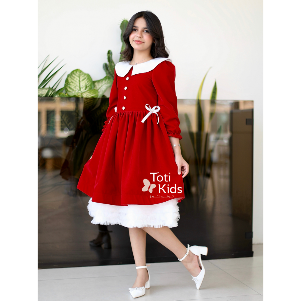 فستان بناتي مخمل أحمر بياقة بيضاء | فستان شتوي بطبقات تل - 1124