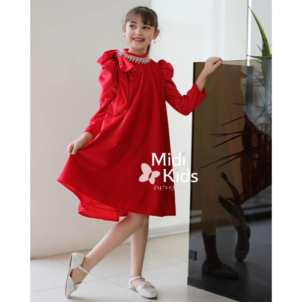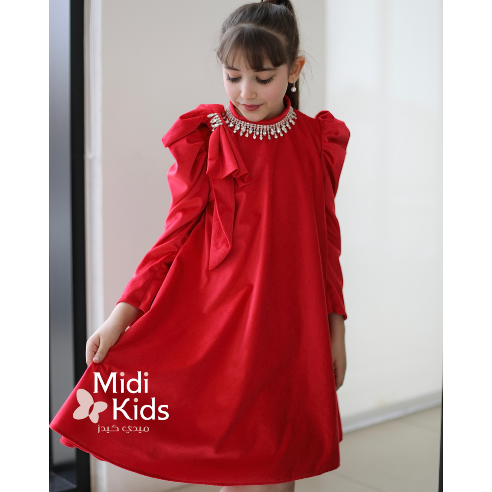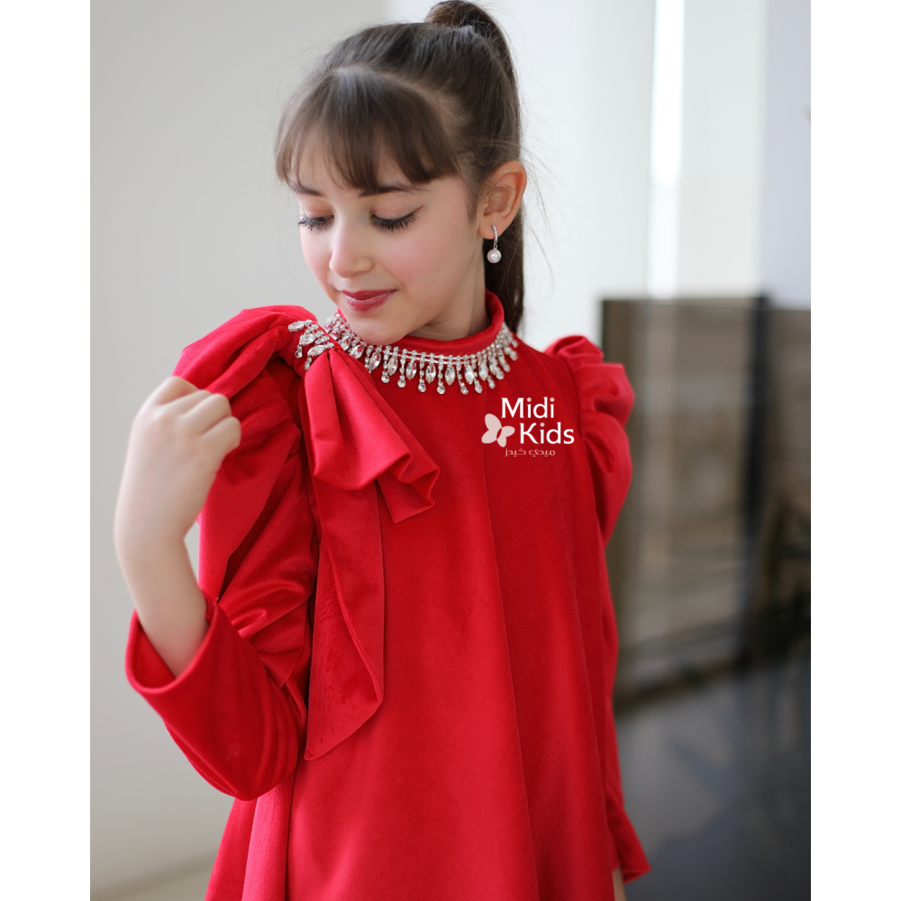 أحمر ملكي.. وتفاصيل تلمع كالذهبلأن طفلتك تستحق التفرد، نقدم لكِ هذا التصميم الذي يعيد تعريف فساتين المخمل الكلاسيكية. فستان أحمر من أجود خامات المخمل التي تلمع بفخامة تحت الأضواء، تم تنسيقه بلمسات إكسسوار فاخرة تغنيكِ عن البحث عن مجوهرات إضافية. إنه التجسيد الحقيقي للأناقة الملكية الحديثة، مصمم ليخطف الأنظار في أرقى المناسبات والحفلات. لماذا هذا الفستان هو أيقونة الفخامة؟لأنه يجمع بين جودة القماش العالية والإكسسوارات المدمجة بذكاء:إكسسوار الرقبة الفاخر: يغني هذا الفستان عن القلائد؛ حيث يأتي مزيناً بإكسسوار راقٍ يلتف حول الرقبة (Neckpiece)، ليمنح الوجه إشراقة فورية ومظهراً في غاية الترتيب.فيونكة الكتف المميزة: لمسة درامية ساحرة تكمن في الفيونكة الكبيرة التي تستقر على أحد الأكتاف، مما يضيف حركة وحيوية للتصميم.بروش الإكسسوار اللامع: لا تكتفي الفيونكة بجمالها، بل تتوسطها قطعة إكسسوار (بروش/كريستال) تزيدها بريقاً وتجعل الفستان يبدو كقطعة مجوهرات ثمينة.مخمل من الدرجة الأولى: تم استخدام أفخم أنواع المخمل الثقيل والناعم جداً على البشرة، ليضمن انسيابية الفستان ومظهره الغني الذي لا يبهت.قصة مريحة وملكية: رغم فخامة التفاصيل، يظل الفستان مريحاً في الارتداء، ليسمح لأميرتك بالتحرك بحرية وثقة.جودة صُنعت لتدومعندما نقول "أجود أنواع المخمل"، فنحن نعني خامة تعيش طويلاً وتحتفظ برونقها. الإكسسوارات مثبتة بعناية فائقة لضمان الأمان والثبات، مع بطانة داخلية ناعمة. امنحيها إطلالة النجمات!اجعلي هذا الفستان خيارك الأول لمناسبة لا تُنسى.✨ اطلبيه الآن.. فالقطع المميزة تنفد سريعاً! ✨