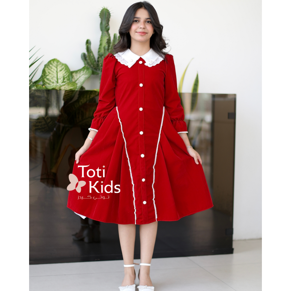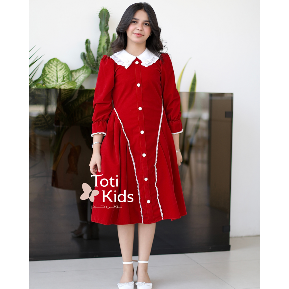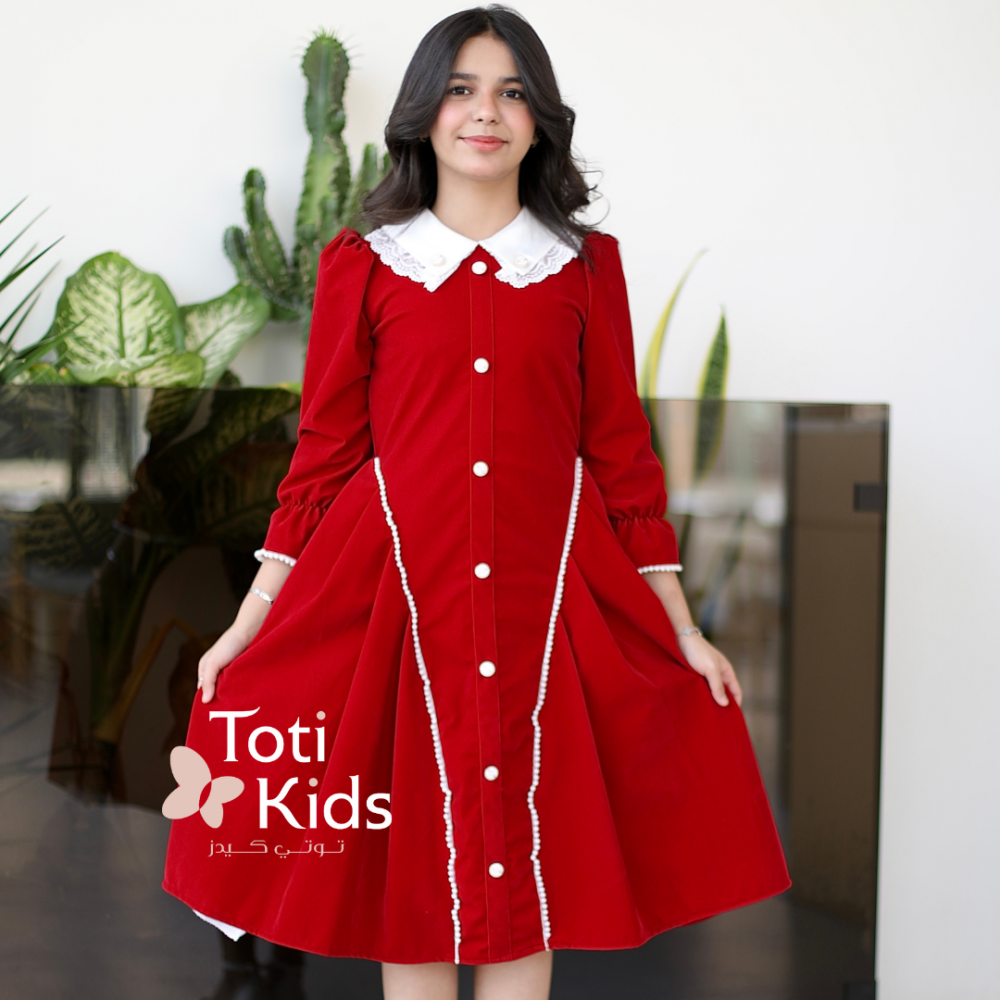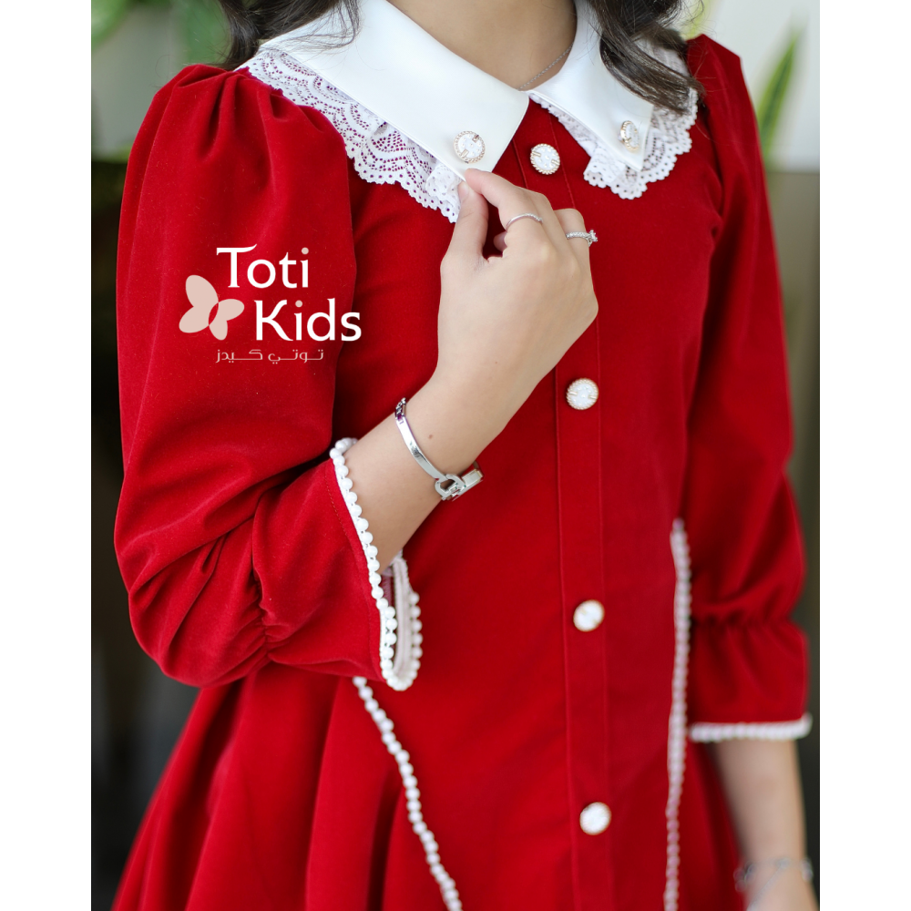بريق التفاصيل.. فخامة المخمل بلمسات ملكيةفي عالم الأناقة الشتوية، تكمن الفخامة الحقيقية في التفاصيل الدقيقة. نقدم لكِ هذا الفستان الأحمر الساحر، المصنوع من أجود أنواع المخمل الذي يعكس دفء الموسم. ما يميز هذه القطعة هو التناغم الرائع بين الكلاسيكية والعصرية؛ حيث تتزين الواجهة بأزرار أنيقة تضفي طابعاً رسمياً، بينما تتناثر حبات اللؤلؤ لتضيف لمسة من النعومة والرقي، لتمنح طفلتك إطلالة متكاملة تخطف القلوب. لماذا هذا الفستان هو الخيار الأمثل لإطلالة فخمة؟لأنه يجمع بين جودة الخامة وجمال الإكسسوارات المضافة:أزرار الزينة الأنيقة: يتوسط الصدر صف من الأزرار (سواء كانت ذهبية، كريستالية، أو مغلفة) التي تضفي هيكلية وهيبة للتصميم، وتمنحه طابعاً كلاسيكياً فاخراً (Vintage Style).لمسات اللؤلؤ الناعمة: تزدان تفاصيل الفستان (مثل الياقة أو الجيوب أو الأكمام) بحبات اللؤلؤ الأبيض، التي تخلق تباينًا ساحرًا مع اللون الأحمر العميق وتعزز من أنوثة الإطلالة.مخمل أحمر غني: صُنع الفستان من مخمل ثقيل وناعم الملمس، يوفر الدفء اللازم في الأجواء الباردة مع لمعة خفيفة تبرز جمال اللون الأحمر.تصميم مريح وراقٍ: قصة الفستان مصممة لتوفير الراحة وحرية الحركة، مع الحفاظ على المظهر المرتب والأنيق بفضل التفاصيل المدروسة.مثالي للمناسبات: هذا الفستان هو الرفيق المثالي لحفلات الأعياد، جلسات التصوير، والمناسبات العائلية التي تتطلب مظهراً يجمع بين الفخامة والبراءة.جودة تدوم وتفاصيل لا تُنسىعند البحث عن فستان شتوي بناتي بتفاصيل مميزة، فإن هذا التصميم يقدم لكِ الجودة التي تبحثين عنها. الأزرار واللؤلؤ مثبتة بعناية فائقة، والفستان مبطن بالكامل لضمان راحة طفلتك. ✨ اطلبيه الآن ودعيها تتألق بتفاصيل من الجمال والرفاهية! ✨