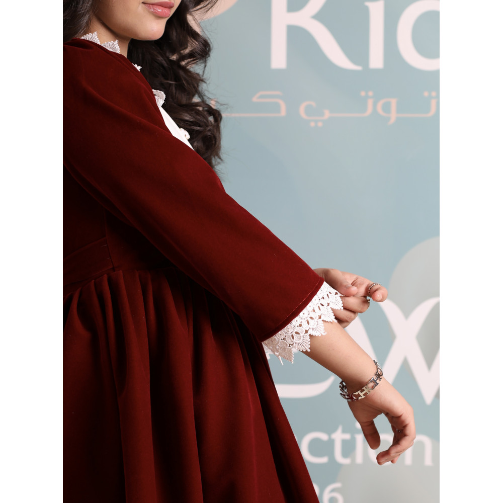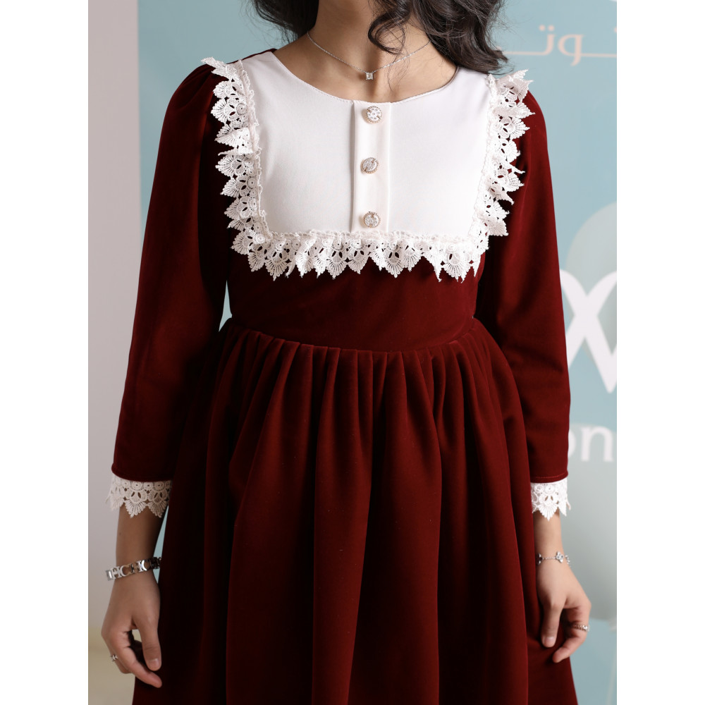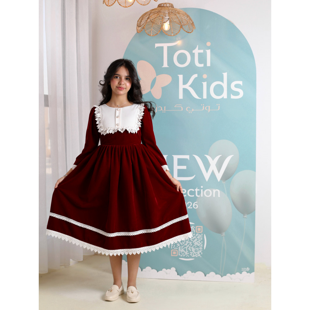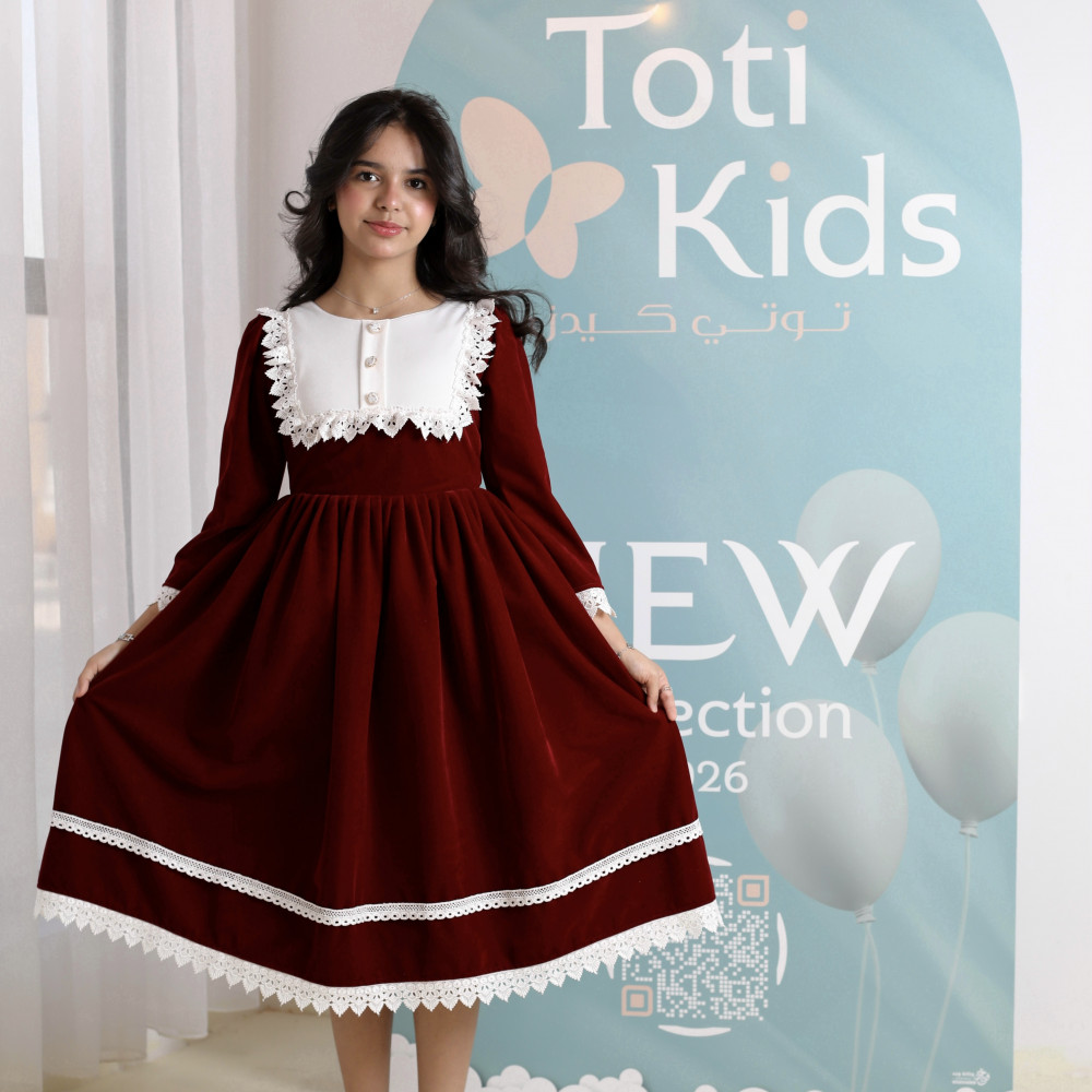 سحر الكلاسيكية.. أناقة خالدة من الزمن الجميلفي ليالي الشتاء الباردة، لا شيء يضاهي فخامة المخمل بلمسته الكلاسيكية الدافئة. نقدم لكِ هذا التصميم الأنيق الذي يجمع بين أصالة الماضي ودفء الحاضر، ليمنح أميرتك إطلالة راقية ومحتشمة. يجمع الفستان بين اللون العنابي الملكي العميق، والبياض الناصع للياقة المطرزة التي تبرز جمال الوجه، مع لمسة نهائية من أشرطة الدانتيل الناعمة. صُمم هذا الفستان ليكون قطعة استثنائية، تجمع بين أناقة التصميم وراحة الارتداء في قطعة واحدة تخطف الأنظار. لماذا هذا الفستان هو قطعة الشتاء الكلاسيكية؟لأنه يجمع بين التصميم الفاخر، الأقمشة الدافئة، والتفاصيل الراقية.فخامة المخمل الشتوي: صُنع هذا الفستان البناتي المخمل من أجود أنواع قماش المخمل الثقيل باللون العنابي، ليوفر دفئًا لا مثيل له ومظهرًا ملكيًا.ياقة بيضاء مطرزة: يتميز الفستان بياقة "بيتر بان" بيضاء عريضة وفاخرة، ذات قماش مطرز بأناقة ومزينة بأزرار لؤلؤية، مما يضفي لمسة كلاسيكية راقية.أشرطة دانتيل ناعمة: تُزين حافة الفستان طبقتان من شريط الدانتيل الأبيض الأنيق، مما يضفي حركة وجمالاً إضافياً على التصميم.تصميم مريح وأنيق: يأتي الفستان بأكمام طويلة وقصة A-line كلاسيكية تضمن الراحة التامة وحرية الحركة، وتسمح للياقة بأن تكون بطلة التصميم.مثالي للأعياد والمناسبات: هذا الفستان الشتوي الفاخر هو الخيار الأمثل لحفلات الأعياد، الزيارات الرسمية، والمناسبات التي تتطلب إطلالة دافئة ومحتشمة. جودة تليق بأناقتها الكلاسيكيةعند البحث عن ملابس شتوية للمناسبات، فإن هذا التصميم يقدم مزيجًا مثاليًا من الدفء والأناقة الخالدة. مصنوع بحرفية عالية ليدوم طويلاً ويحافظ على رونقه. ✨ اطلبيه الآن لتتألق بإطلالة كلاسيكية دافئة لا تُنسى! ✨