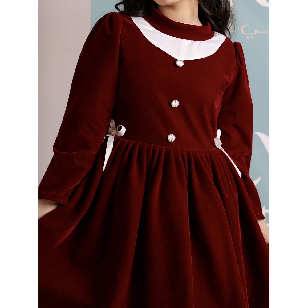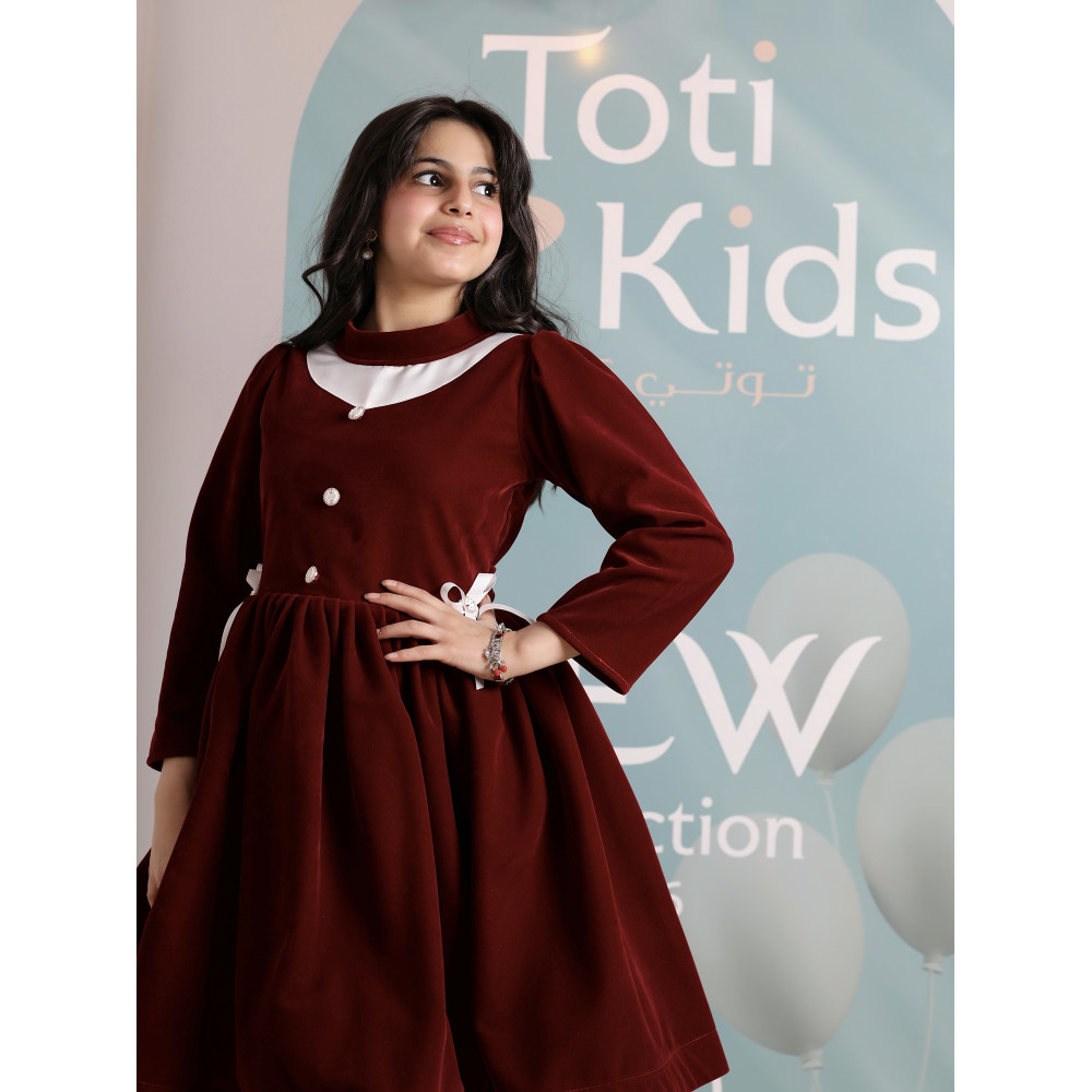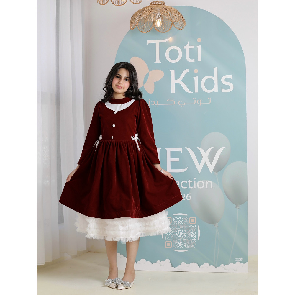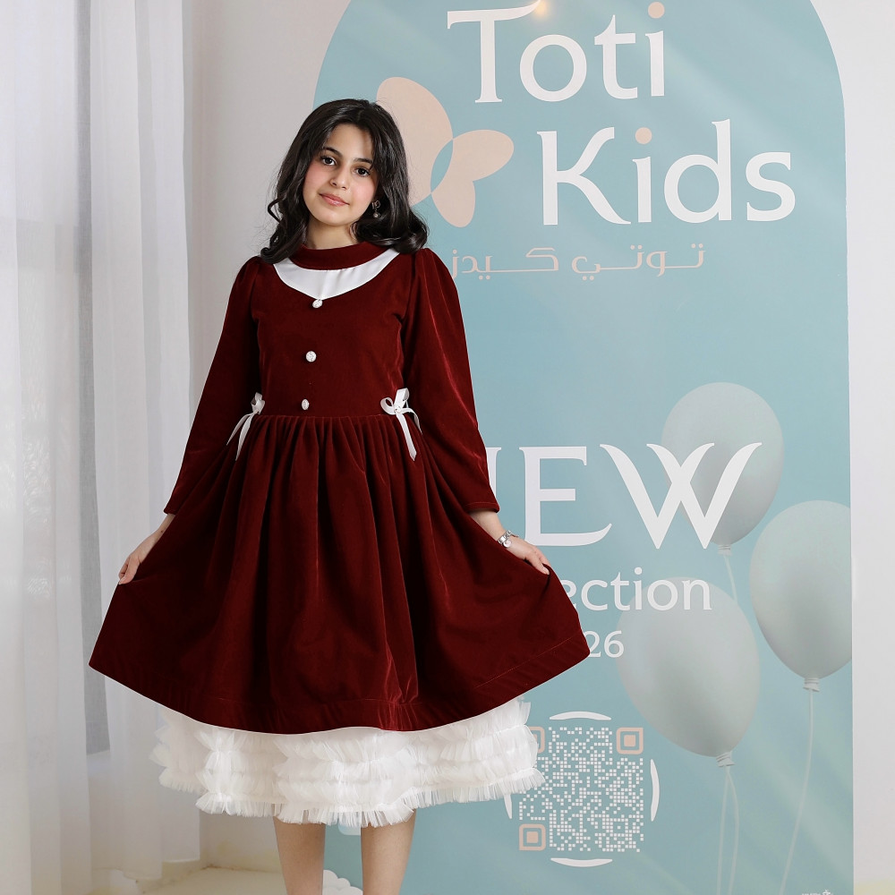 الأناقة الكلاسيكية.. دفء وفخامة لا تُنسىعندما يلتقي المخمل الفاخر بالتصميم الكلاسيكي، تكون النتيجة قطعة أيقونية تسرق القلوب. نقدم لكِ فستان الشتاء الراقي، تحفة فنية باللون العنابي الغني الذي يجسد دفء الموسم وفخامته. صُمم هذا الفستان ليمنح طفلتك إطلالة أرستقراطية ناعمة، بياقته البيضاء التي تضيء الوجه وطبقات التل السفلية التي تضيف لمسة من المرح والحركة. إنه الخيار الأمثل ليالي الشتاء الباردة واحتفالات الأعياد، ليجمع بين الراحة والأناقة في إطلالة واحدة متكاملة. لماذا هذا الفستان هو قطعة الشتاء المفضلة؟لأنه يجمع بين التصميم الراقي، جودة الخامات، والدفء الذي تحتاجه أميرتك.فخامة المخمل الشتوي: صُنع هذا الفستان البناتي المخمل من أجود أنواع قماش المخمل الثقيل، ليوفر دفئًا لا مثيل له ومظهرًا ملكيًا بلونه العنابي الجذاب.تصميم كلاسيكي بلمسة براءة: يتميز الفستان بياقة "بيتر بان" بيضاء أنيقة، مع أزرار أمامية للزينة وفيونكات جانبية ناعمة، مما يضفي لمسة كلاسيكية راقية.طبقات التل المنفوشة: يزدان طرف الفستان بطبقات غنية من التل الأبيض الناعم، تظهر أسفل المخمل لتمنح التنورة حجمًا إضافيًا ومظهرًا احتفاليًا فريدًا.دفء وراحة: يأتي الفستان بأكمام طويلة ليضمن لأميرتك الدفء الكامل، مع قصة مريحة تسمح لها باللعب والحركة بحرية.مثالي للأعياد: هذا الفستان الشتوي الفاخر هو الخيار الأول لحفلات رأس السنة، الأعياد، والزيارات العائلية الرسمية.جودة تليق بليالي الشتاء الفاخرةعند البحث عن ملابس شتوية للمناسبات، فإن الجودة هي ما يضمن الدفء والأناقة. هذا الفستان مصنوع بحرفية عالية ليدوم طويلاً ويحافظ على رونقه.✨ اطلبيه الآن لتتألق أميرتك بدفء وفخامة في كل مناسبة! ✨