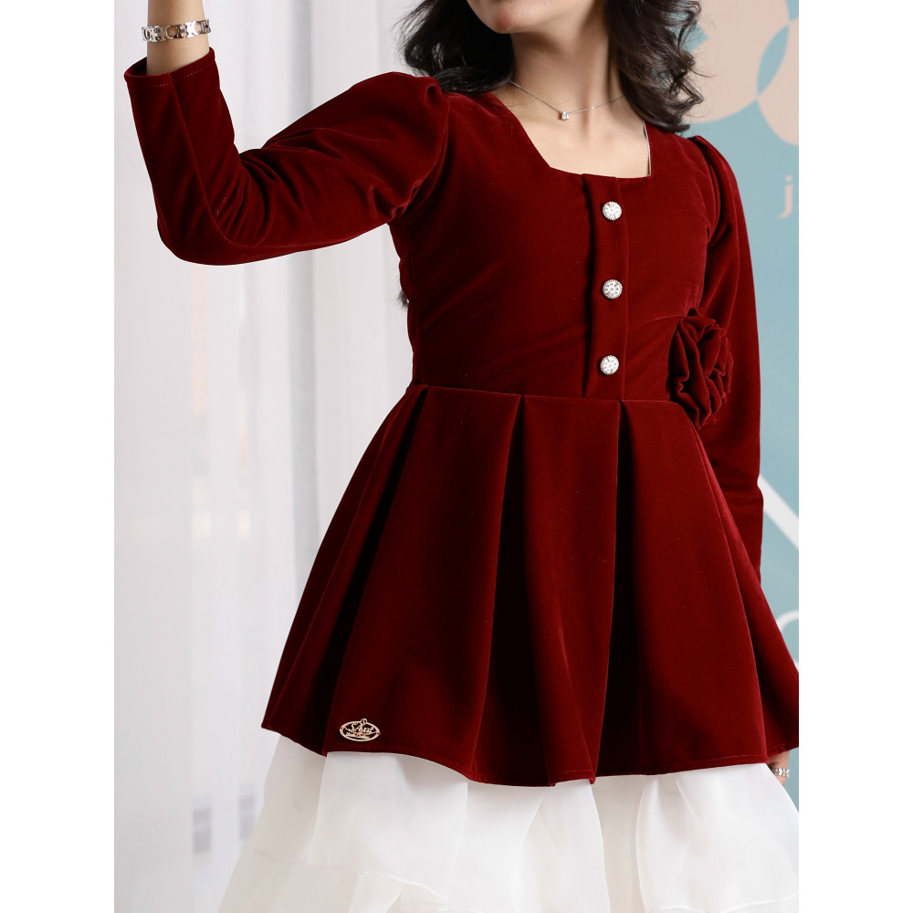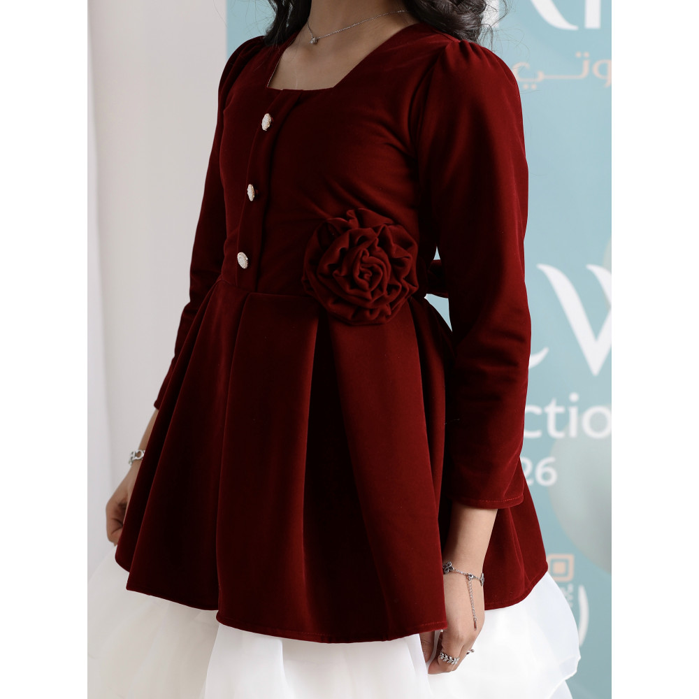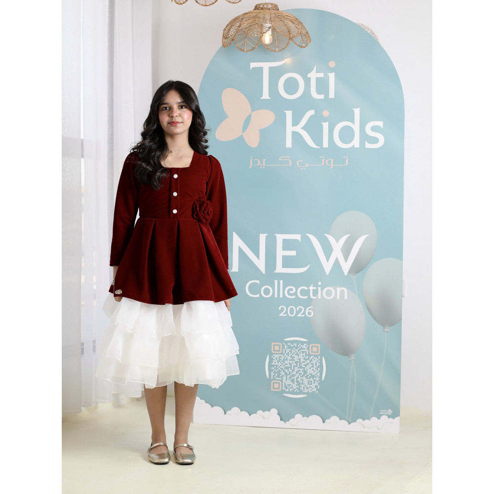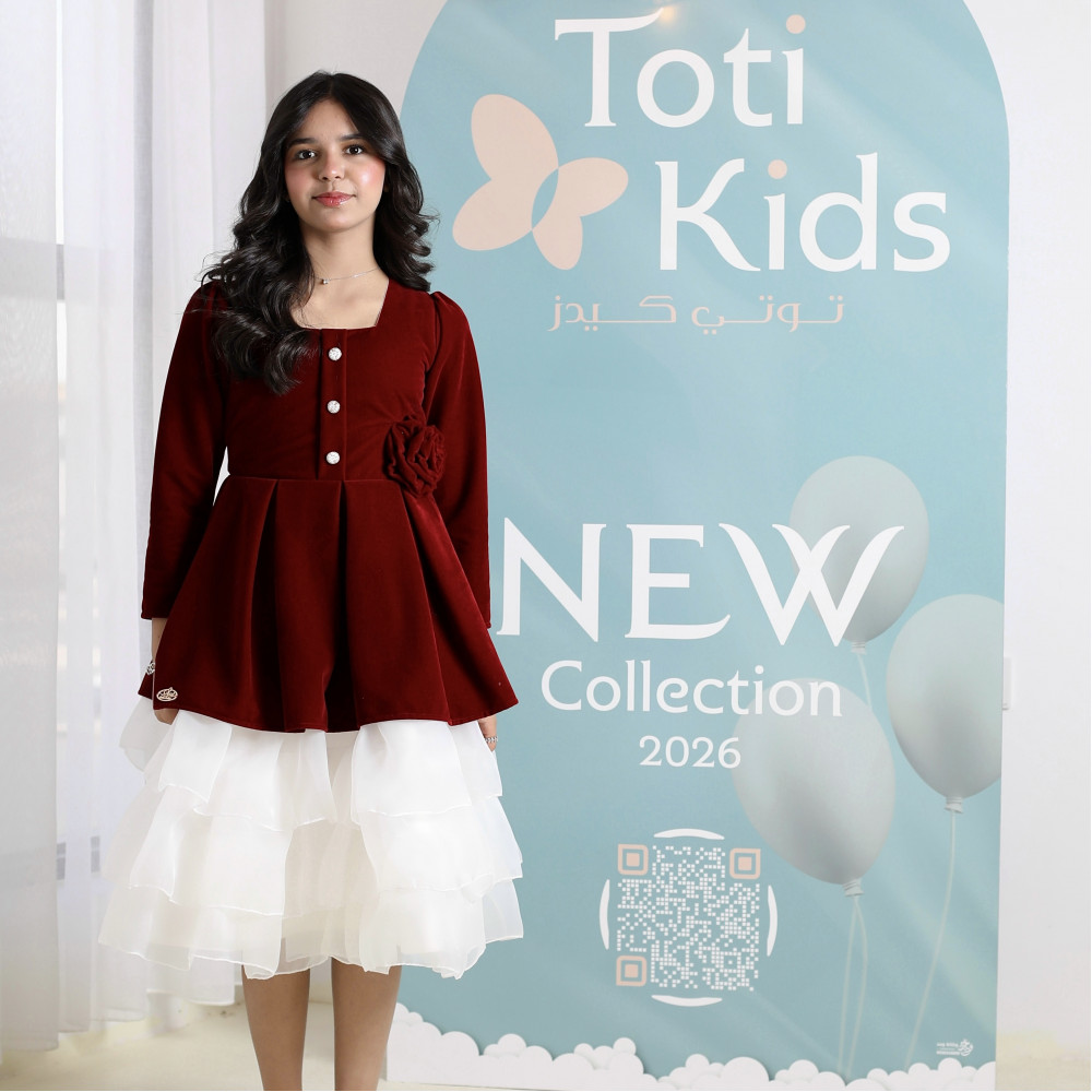 حين يلتقي دفء المخمل.. بخفة التل الأبيضفي ليالي الشتاء الباردة، تبحث كل أم عن إطلالة تمنح طفلتها الدفء والأناقة في آن واحد. نقدم لكِ هذا التصميم الاستثنائي الذي يجمع بين عالمين: الفخامة الملكية للمخمل العنابي في الأعلى، والنعومة الحالمة لطبقات التل البيضاء في الأسفل. يبدو الفستان وكأنه طقم من قطعتين، صُمم ببراعة ليمنح أميرتك إطلالة راقية ومميزة، تجمع بين أناقة الشتاء وبراءة الطفولة في قطعة واحدة تخطف الأنظار. لماذا هذا الفستان هو قطعة الشتاء الاستثنائية؟لأنه يجمع بين التصميم المبتكر، فخامة الأقمشة، والتفاصيل الراقية.فخامة المخمل الشتوي: صُنع الجزء العلوي من الفستان البناتي المخمل من أجود أنواع قماش المخمل الثقيل باللون العنابي، ليوفر دفئًا لا مثيل له ومظهرًا ملكيًا.تنورة تل بطبقات (Ruffles): تتميز التنورة بتصميم منفوش من طبقات التل (الأورجانزا) البيضاء، مما يمنحها حركة انسيابية ومظهرًا غنيًا وحالمًا.تصميم أنيق وراقٍ: يأتي التوب المخملي بأكمام طويلة، وياقة مربعة ناعمة، مع وردة مخملية بارزة وأزرار للزينة، مما يضفي لمسة من الرقي والفخامة.مثالي للأعياد والمناسبات: هذا الفستان الشتوي الفاخر هو الخيار الأمثل لحفلات الأعياد، الزيارات الرسمية، والمناسبات التي تتطلب إطلالة دافئة ومميزة. جودة تليق بأناقتها الاستثنائيةعند البحث عن ملابس شتوية للمناسبات، فإن هذا التصميم يقدم مزيجًا مثاليًا من الدفء والأناقة العصرية. مصنوع بحرفية عالية ليدوم طويلاً ويحافظ على رونقه. ✨ اطلبيه الآن لتتألق بإطلالة شتوية دافئة وناعمة! ✨