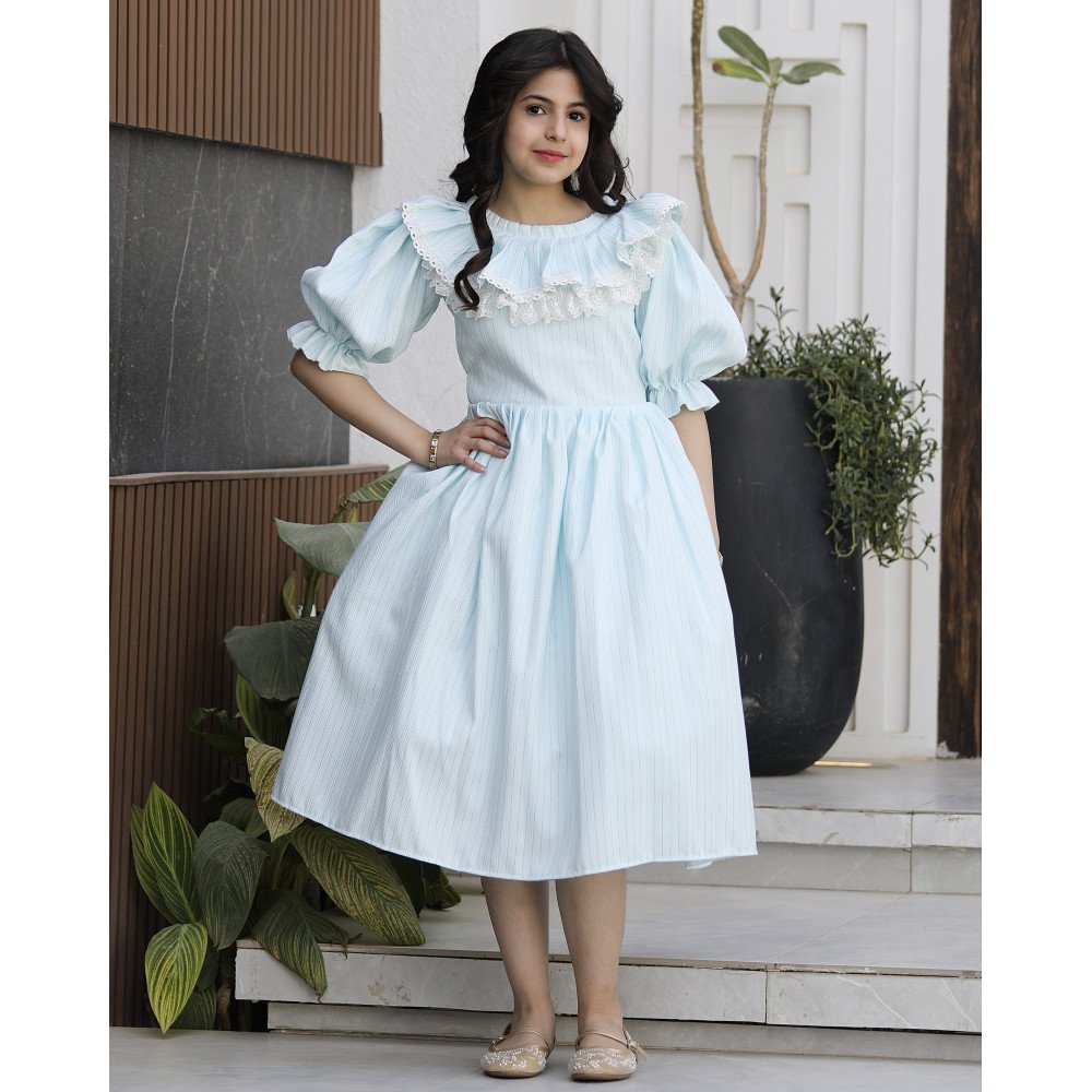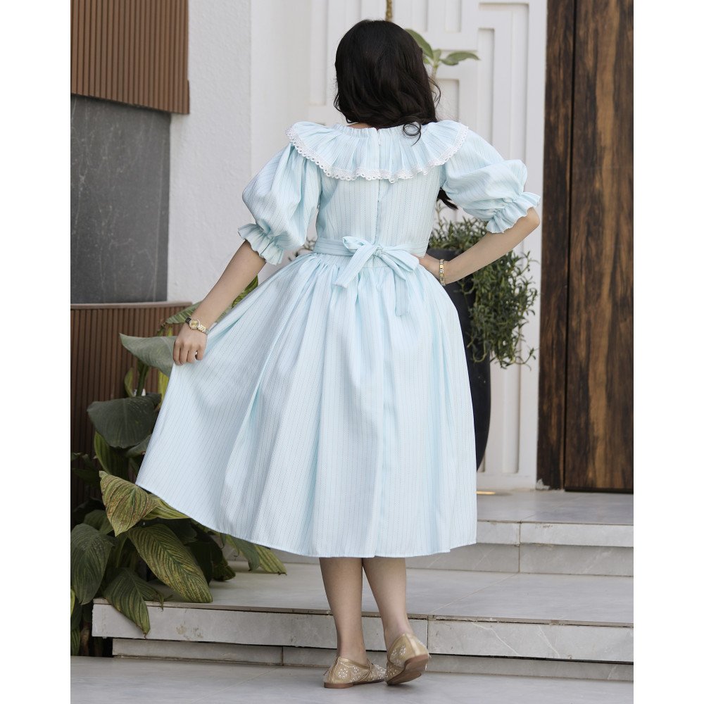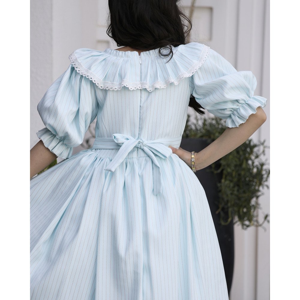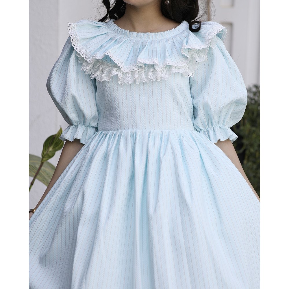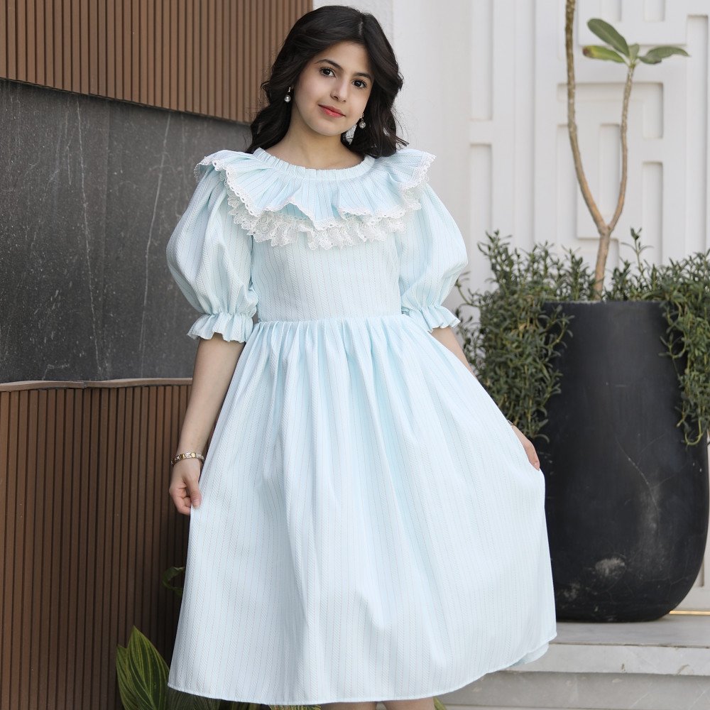 سحر الخطوط.. حين تعانق الكشكشة برودة السماويهناك تصاميم تمنحك شعوراً بالانتعاش بمجرد النظر إليها، وهذا الفستان المقلم هو تجسيد لجمال الصيف الهادئ. نقدم لكِ الموديل 1143، قطعة فنية تجمع بين كلاسيكية الخطوط الطولية ورقة "الكشكشة" التي تنسدل بنعومة ملكية من الرقبة مباشرة. صُمم هذا الفستان ليمنح أميرتك الصغيرة حضوراً يفيض بالنعومة والانطلاق، حيث تتناغم الألوان الهادئة مع القصة الانسيابية لتخلق إطلالة تشبه نسمات الصباح الباكرة. إنه ليس مجرد فستان، بل هو قطعة من الهدوء صُممت لتجعل من طفلتك أيقونة للرقة في كل مناسبة. لماذا هذا الفستان هو قطعة الاستثناء في خزانة أميرتك؟لأنه يجمع بين التصميم العصري الراقي وأدق التفاصيل الجمالية:نقشة مقلمة كلاسيكية: يتميز الفستان بخطوط طولية دقيقة تمنح القوام مظهراً ممشوقاً وأنيقاً، وتعكس ذوقاً رفيعاً يجمع بين البساطة والفخامة.ياقة كشكشة انسيابية: تبرز جمال الفستان ياقته المبتكرة المكونة من طبقات الكشكشة الناعمة التي تنسدل مباشرة من الرقبة لتغطي منطقة الصدر بأسلوب درامي رقيق يغنيكِ عن إضافة أي إكسسوارات.لونان يفيضان بالرقة: اختاري بين السماوي الصافي لإطلالة ملائكية منعشة، أو اللون اللحمي الدافئ لإطلالة أرستقراطية هادئة تناسب جميع ألوان البشرة.قصة مريحة وحالمة: ينسدل الفستان بقصة مريحة تضمن لأميرتك حرية الحركة واللعب مع الحفاظ على مظهرها المرتب والراقي طوال وقت الاحتفال.مثالي للأعياد والمناسبات: سواء كان الاحتفال بعيد أو زيارة عائلية خاصة، فإن الموديل 1143 هو الخيار الذي يضمن لطفلتك التميز والراحة في آن واحد.جودة تليق بلحظات لا تُنسى نحن في "توتي كيدز" نؤمن أن التميز يبدأ من جودة التنفيذ. هذا الفستان مصنوع بحرفية عالية جداً من أقمشة باردة وناعمة تسمح لبشرة طفلتك بالتنفس، مع خياطة متقنة تضمن بقاء طبقات الكشكشة محافظة على شكلها المنفوش والفخم مهما تعددت مرات الارتداء. امنحيها إطلالة تشرق بـسحر الخطوط والجمال!اجعلي من إطلالة أميرتك في المناسبة القادمة ذكرى لا تُمحى بقطعة تجمع بين الابتكار والترف.✨ اطلبيه الآن (موديل 1143) باللون المفضل لأميرتك ودعيها تتألق بجمال لا يقاوم! ✨ شاركينا إطلالتها الساحرة!يسعدنا دائماً رؤية أميراتكم يتألقن بتصاميمنا التي تعكس ذوقكم الرفيع. ندعوكِ لمشاركة صورها وتقييمك للمنتج، فرأيك هو مصدر إلهامنا الدائم لنقدم الأفضل.خدماتنا: نقدم لكِ تجربة تسوق ممتعة مع شحن سريع وموثوق، وسياسة استبدال واسترجاع مرنة لضمان رضاكِ الكامل.