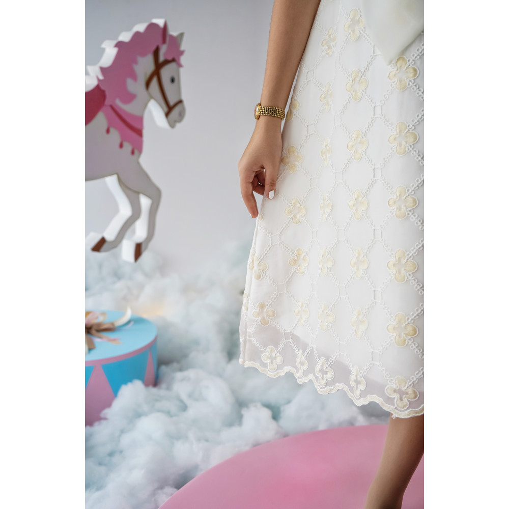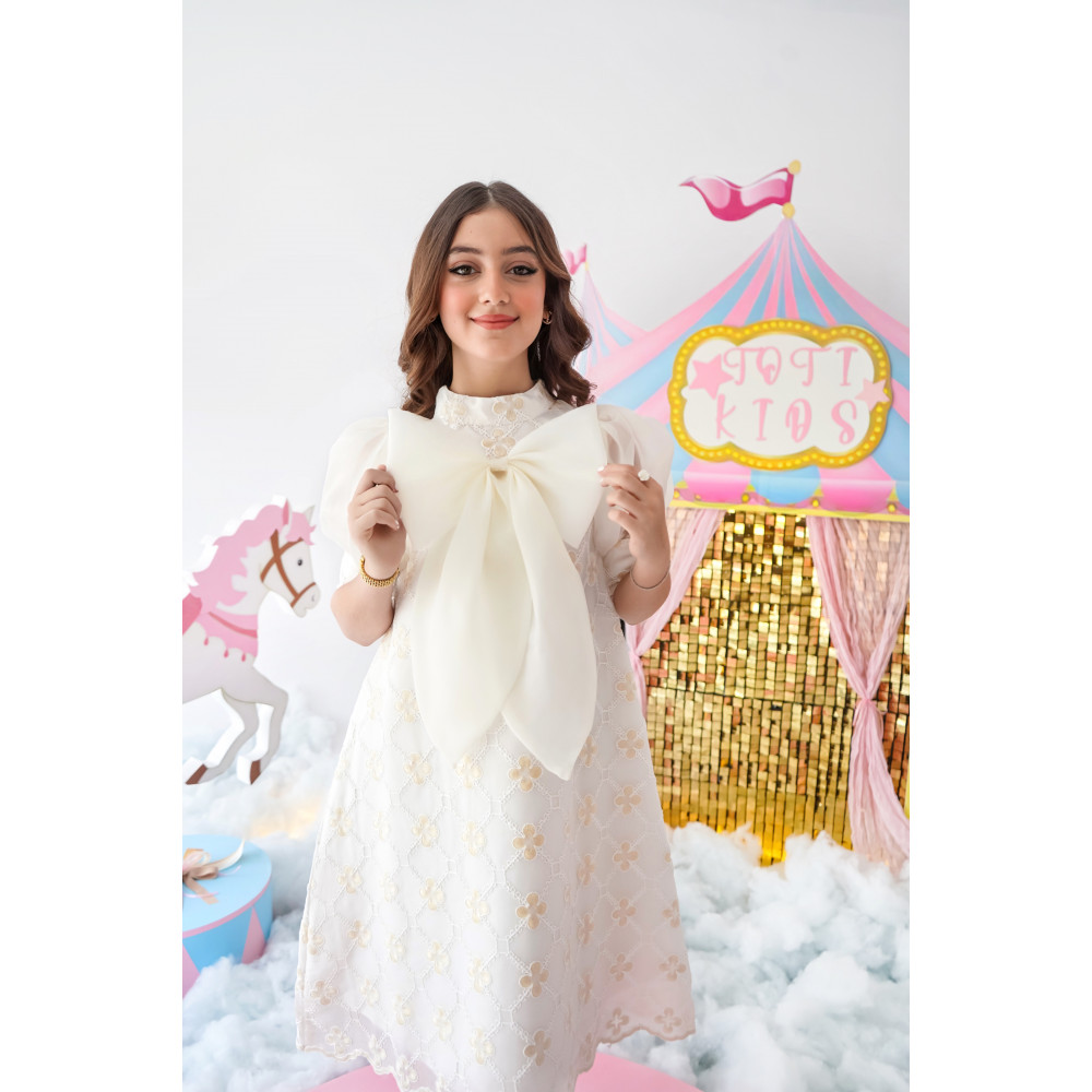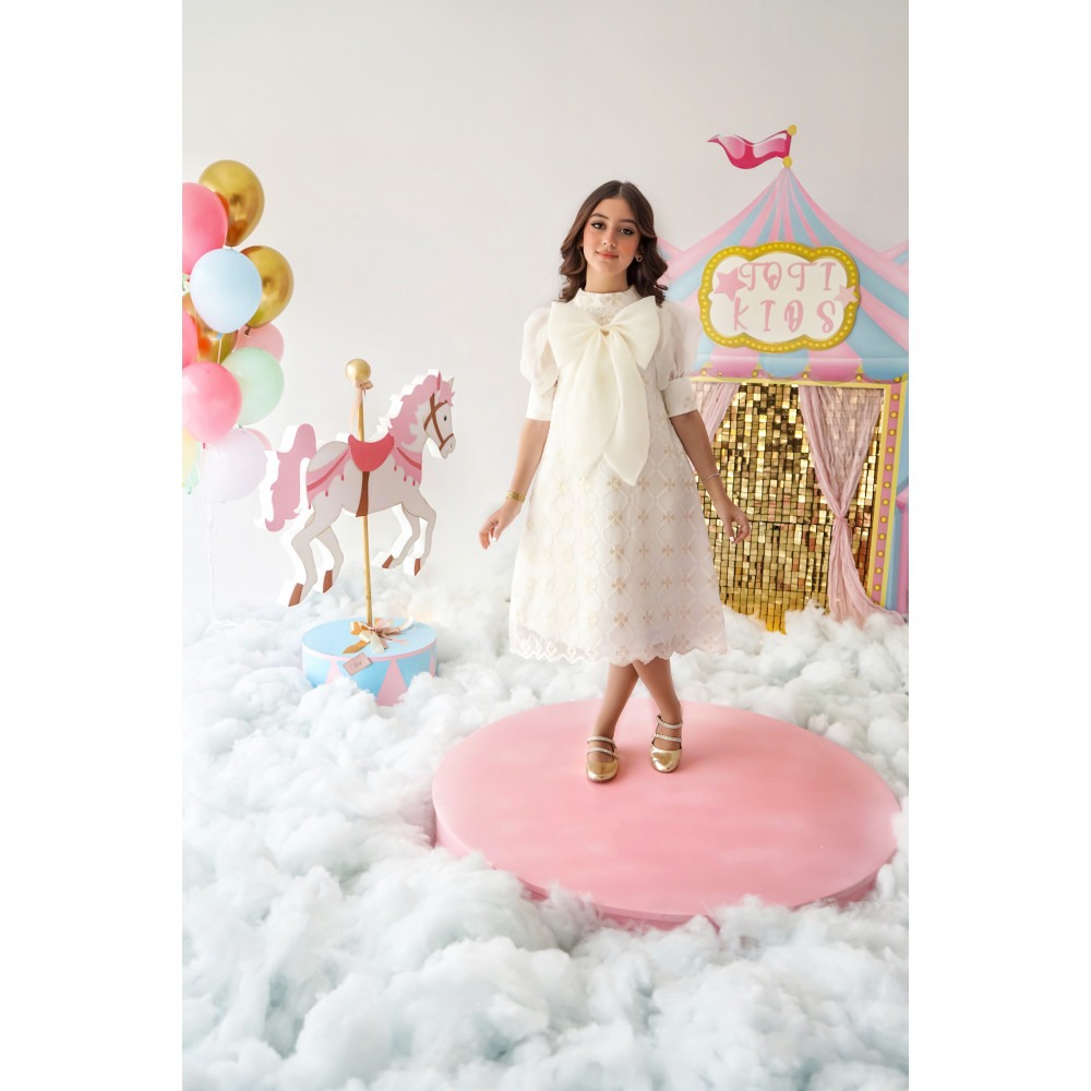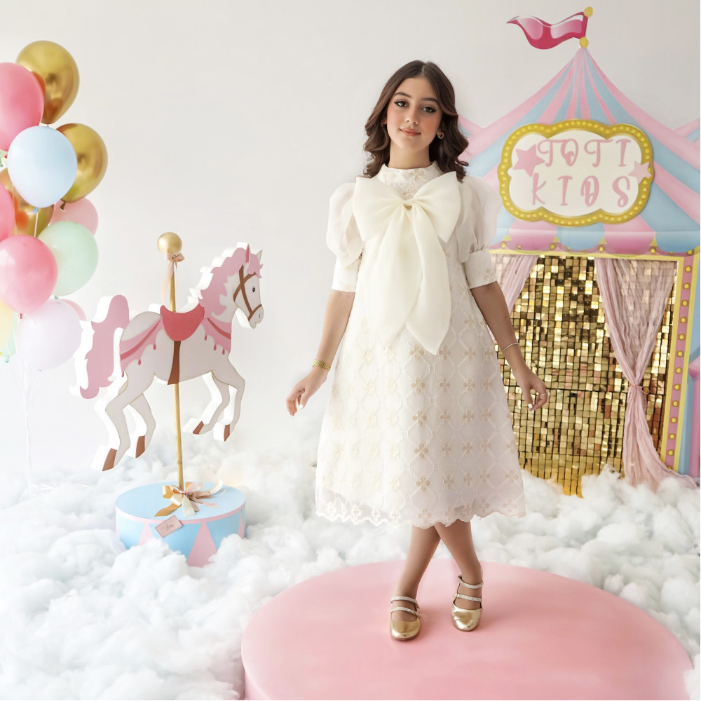 إطلالة ملاك.. قطعة منسوجة من النور هناك فساتين تروي قصصًا من النقاء والسحر، وهذا الفستان هو أجملها. نقدم لكِ قطعة فنية تبدو وكأنها سحابة بيضاء، مصممة لتمنح أميرتك إطلالة ملائكية تخطف القلوب والأنظار. بتصميمه الذي يجمع بين فخامة الدانتيل المطرز ورقة الأورجانزا، يبرز هذا الفستان كتحفة فنية تليق بأهم لحظاتها. إنه ليس مجرد فستان، بل هو تجسيد حي للبراءة والأناقة الراقية. لماذا هذا الفستان هو قطعة استثنائية؟لأنه يجمع بين التصميم الراقي، فخامة الأقمشة، والتفاصيل التي تأسر القلوب.تصميم فاخر ومميز: يتميز الفستان بفيونكة كبيرة من قماش الأورجانزا الشفاف عند الياقة، تضفي لمسة من الدراما والنعومة على التصميم.قماش دانتيل مطرز: صُنع هذا الفستان البناتي الأبيض للمناسبات من قماش الدانتيل الفاخر المطرز بنقوش ذهبية خفيفة، مما يمنحه مظهرًا غنيًا وملمسًا فريدًا.تفاصيل أنثوية رقيقة: يأتي الفستان بأكمام قصيرة منفوشة، وقصة على شكل حرف A (A-line) تضمن راحة تامة وحرية في الحركة.مثالي لأهم المناسبات: سواء كنتِ تبحثين عن فستان بناتي أبيض للأفراح أو لإطلالة مميزة في حفل عيد ميلاد أو مناسبة دينية، هذا التصميم هو خيارك الأمثل. جودة تليق بأميرتك الصغيرةمتوفر بمقاسات من 1 إلى 18 سنة، لأن الأناقة لا عمر لها!