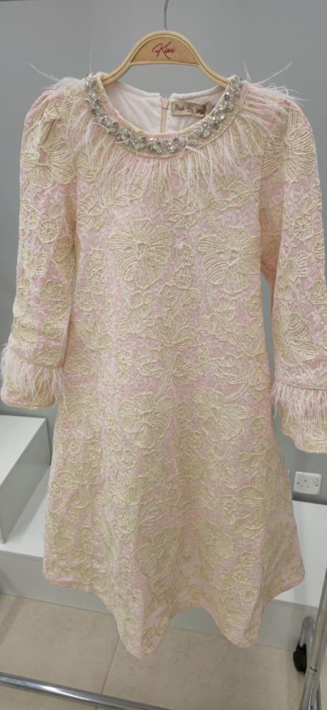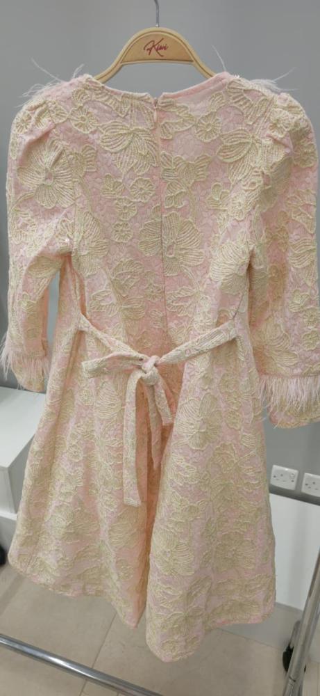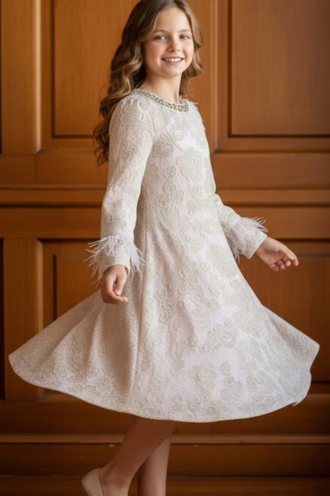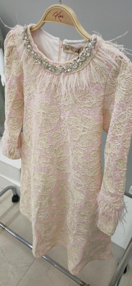 فستان بيج جاكار فاخر بتطريز لؤلؤي وريش ناعم