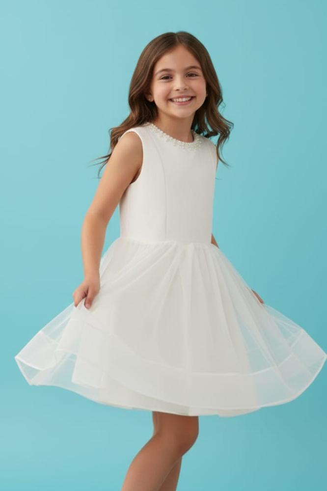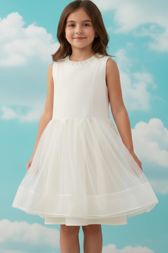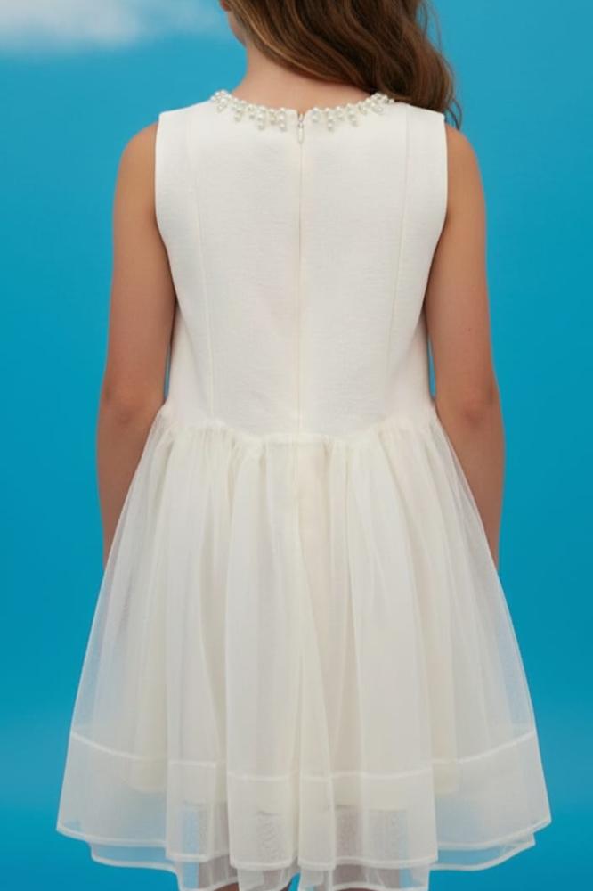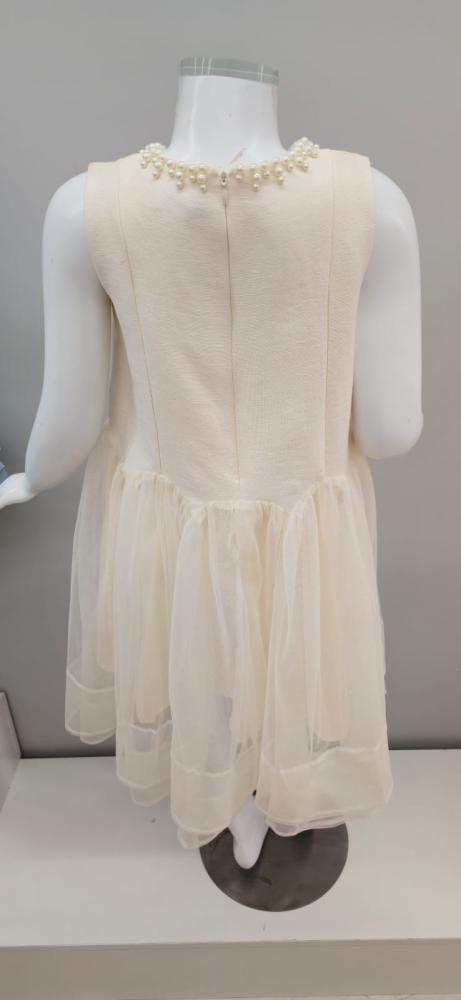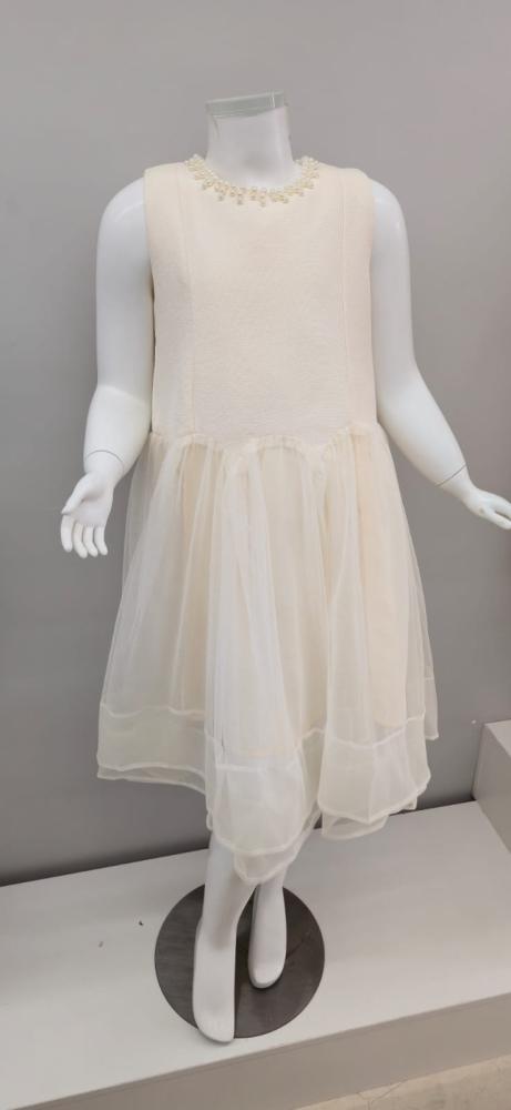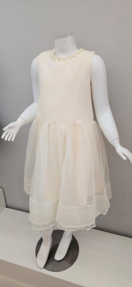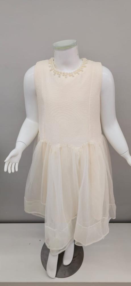 فستان بيج نفاش أنيق مع الؤلؤ على العنق