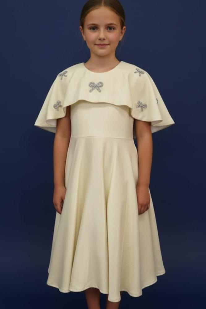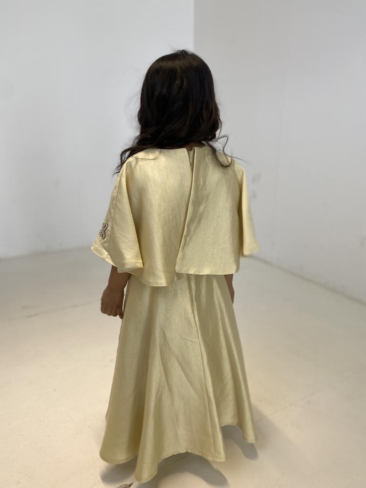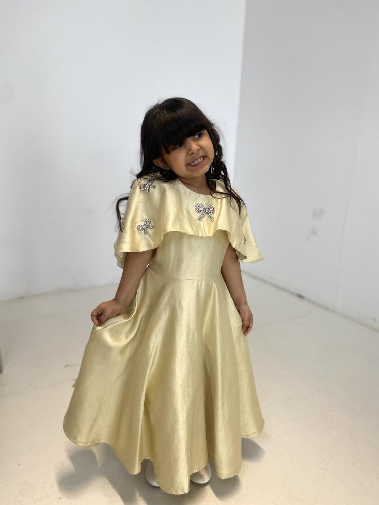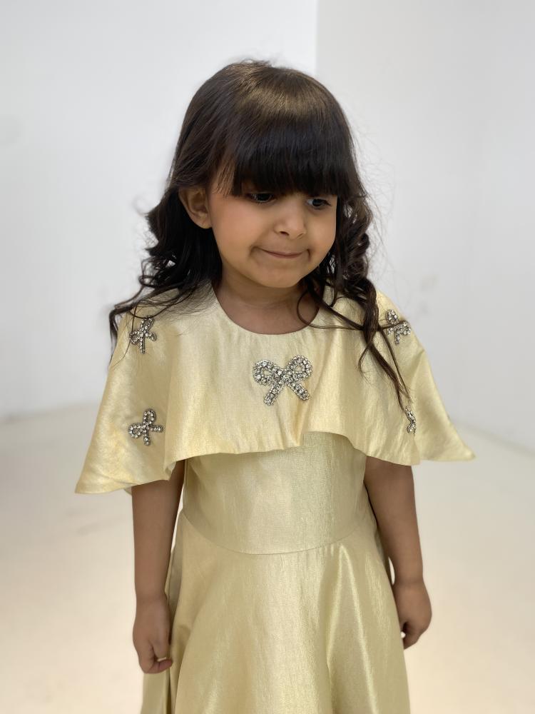 فستان ذهبي مزين بفينكات لؤلؤية على الصدر