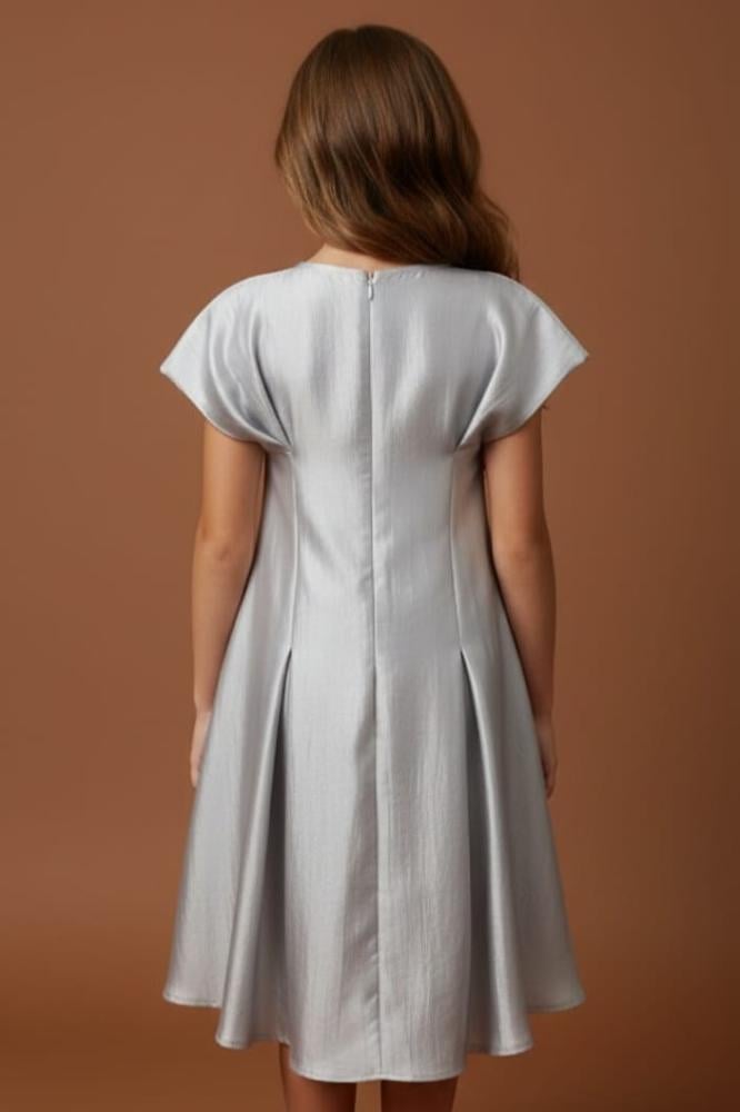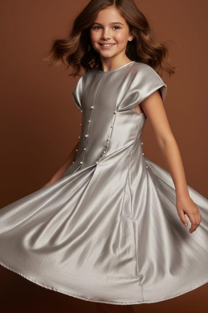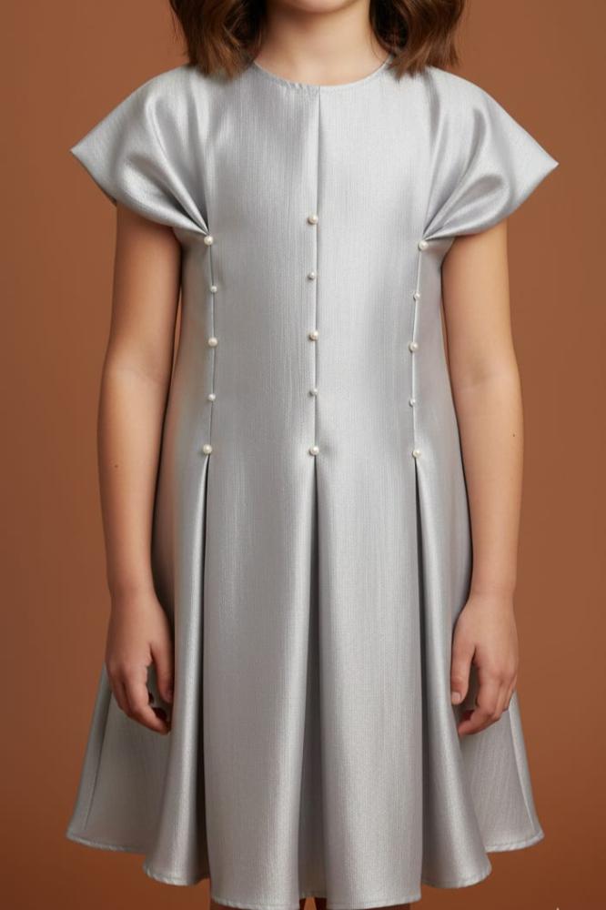 فستان رمادي مع الؤلؤ والكسرات في نص الفستان