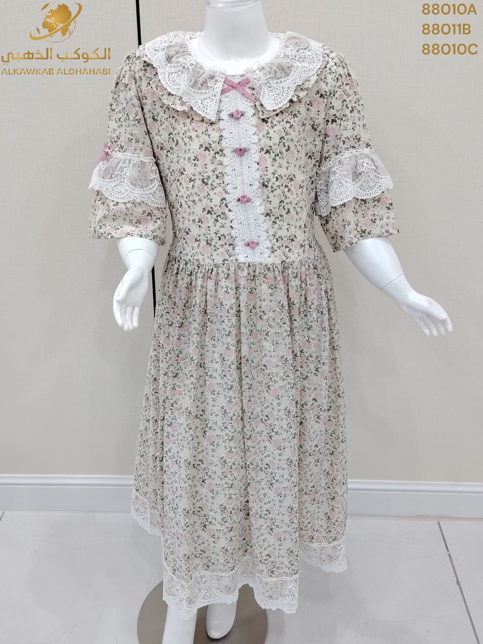 فستان بناتي بنقشة ورود ناعمة على خلفية بيج فاتحة، بتصميم واسع وأكمام قصيرة وياقة دائرية مزينة بتفاصيل أمامية بسيطة تمنحه إطلالة كلاسيكية وهادئة.