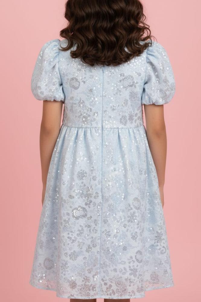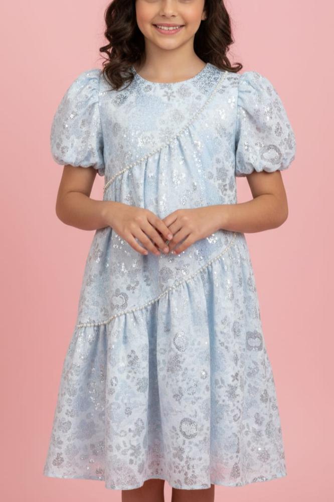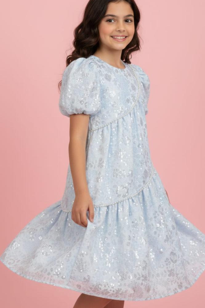 فستان سماوي كشكشة ولؤلؤ على والفستان